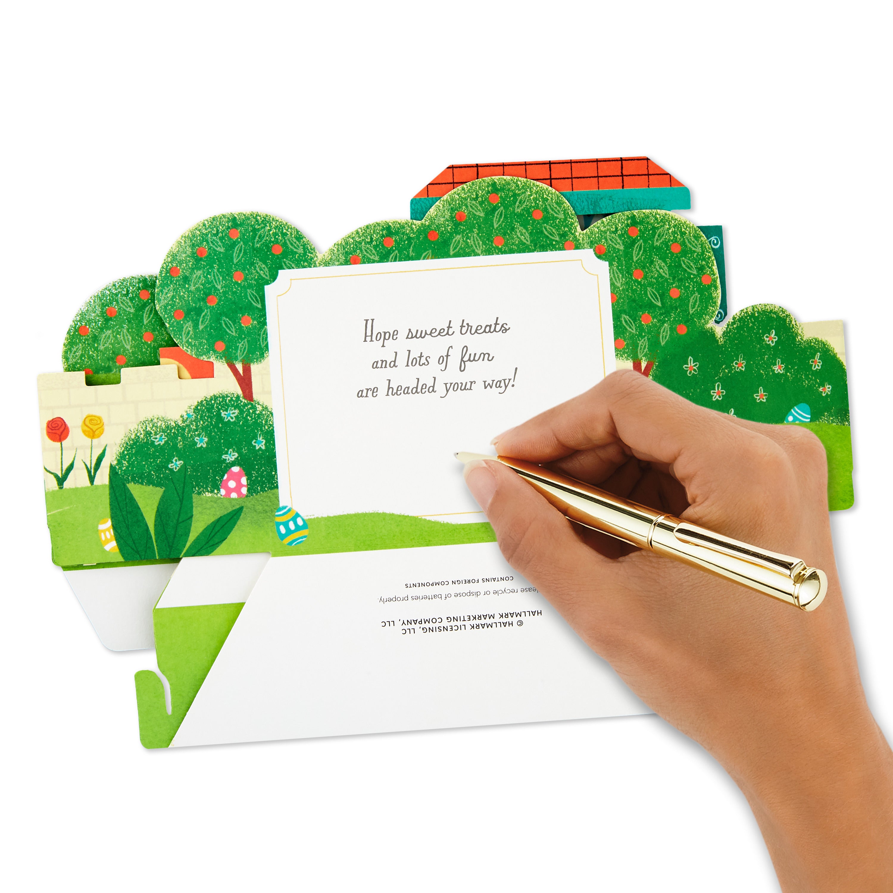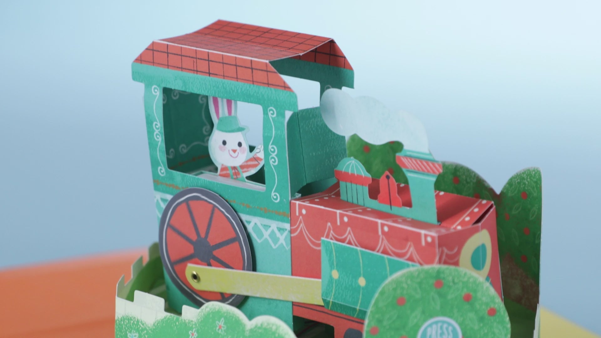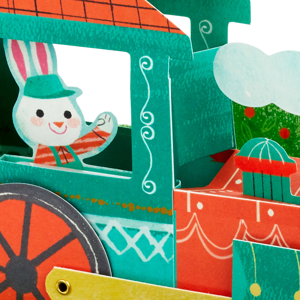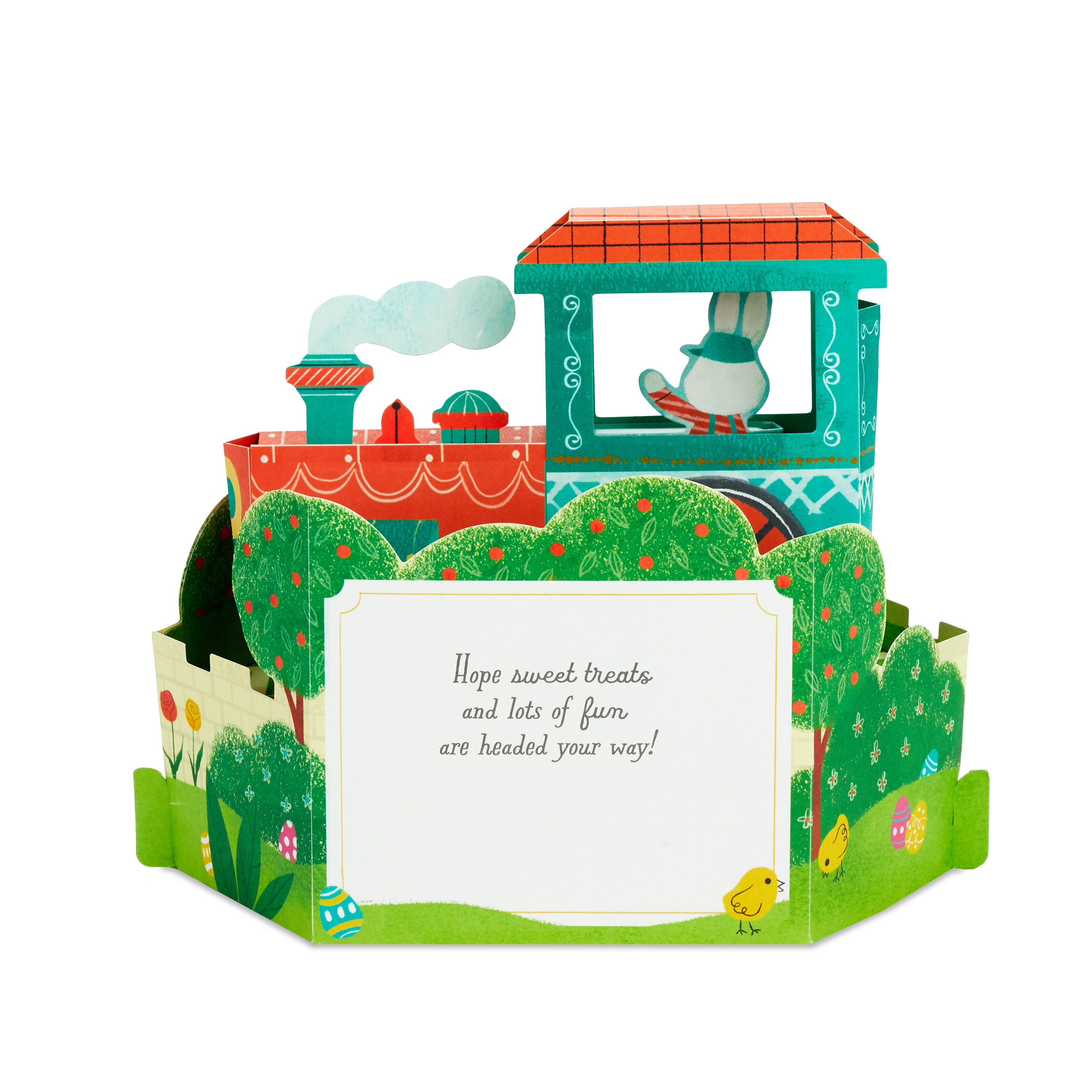 This card pop-ups into a 3D diorama of a green train with a white rabbit conductor, features a three-dimensional, laser cut scene, a designed base for display, a fun instrumental song, and a wheel on the train turns when the button on the front is pressed, the message, 'Happy Easter' on the front, and comes complete with a co-ordinating Hallmark branded, yellow envelope. Simply pull down on sides of card and push up base to pop it open and lock into place—no assembly required!