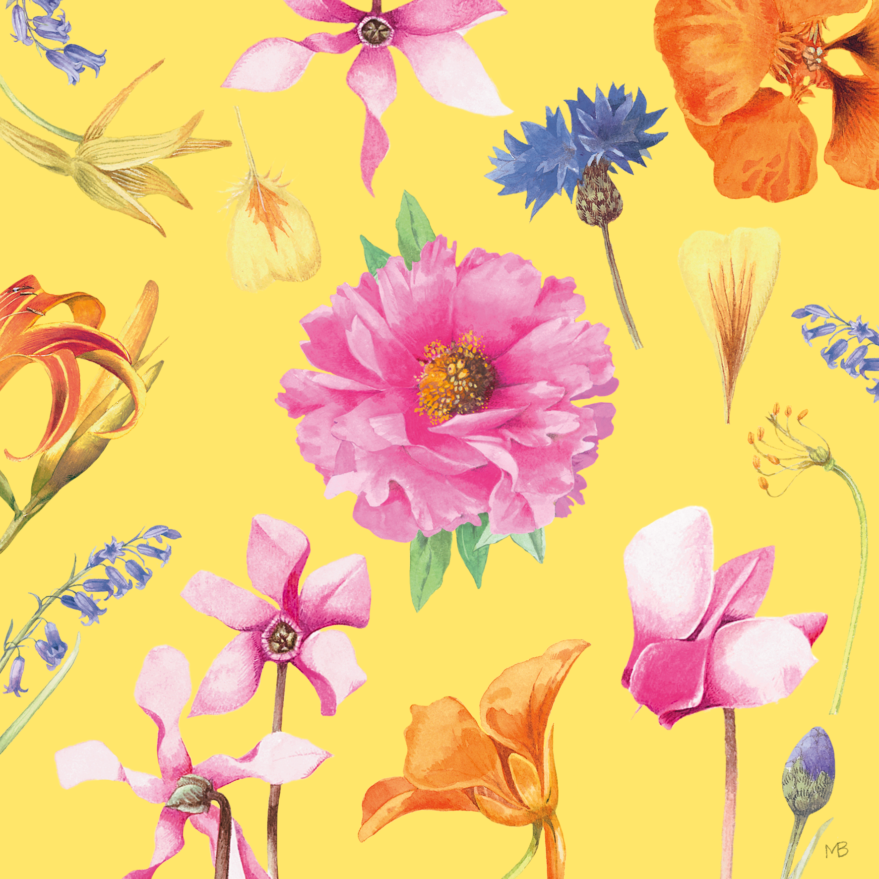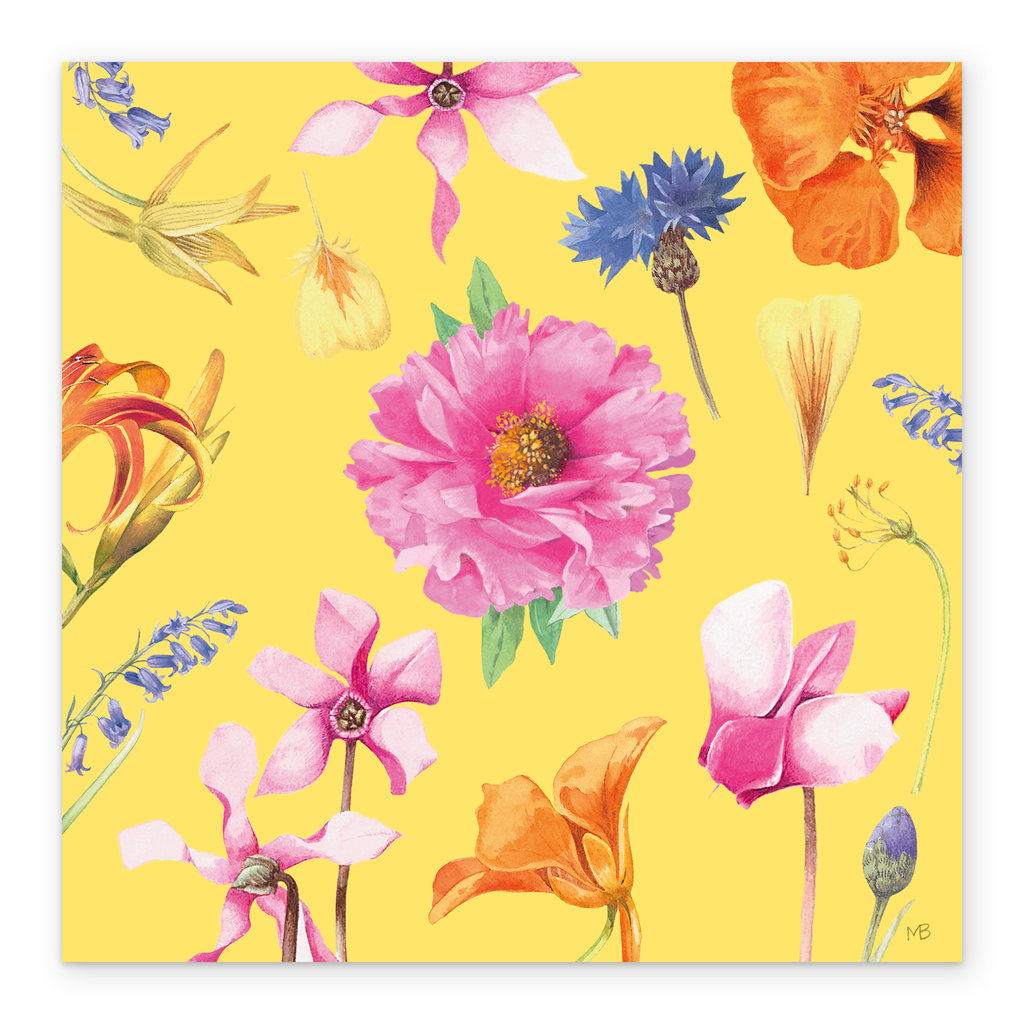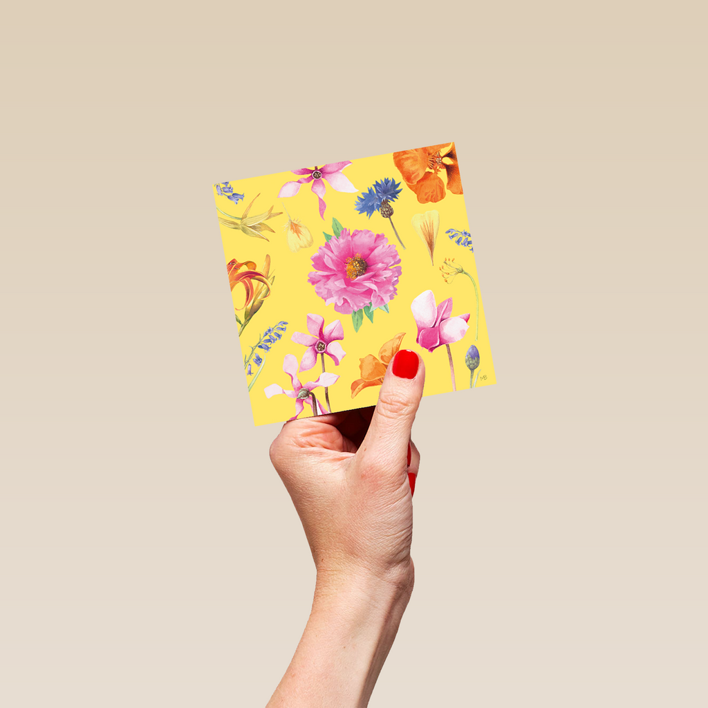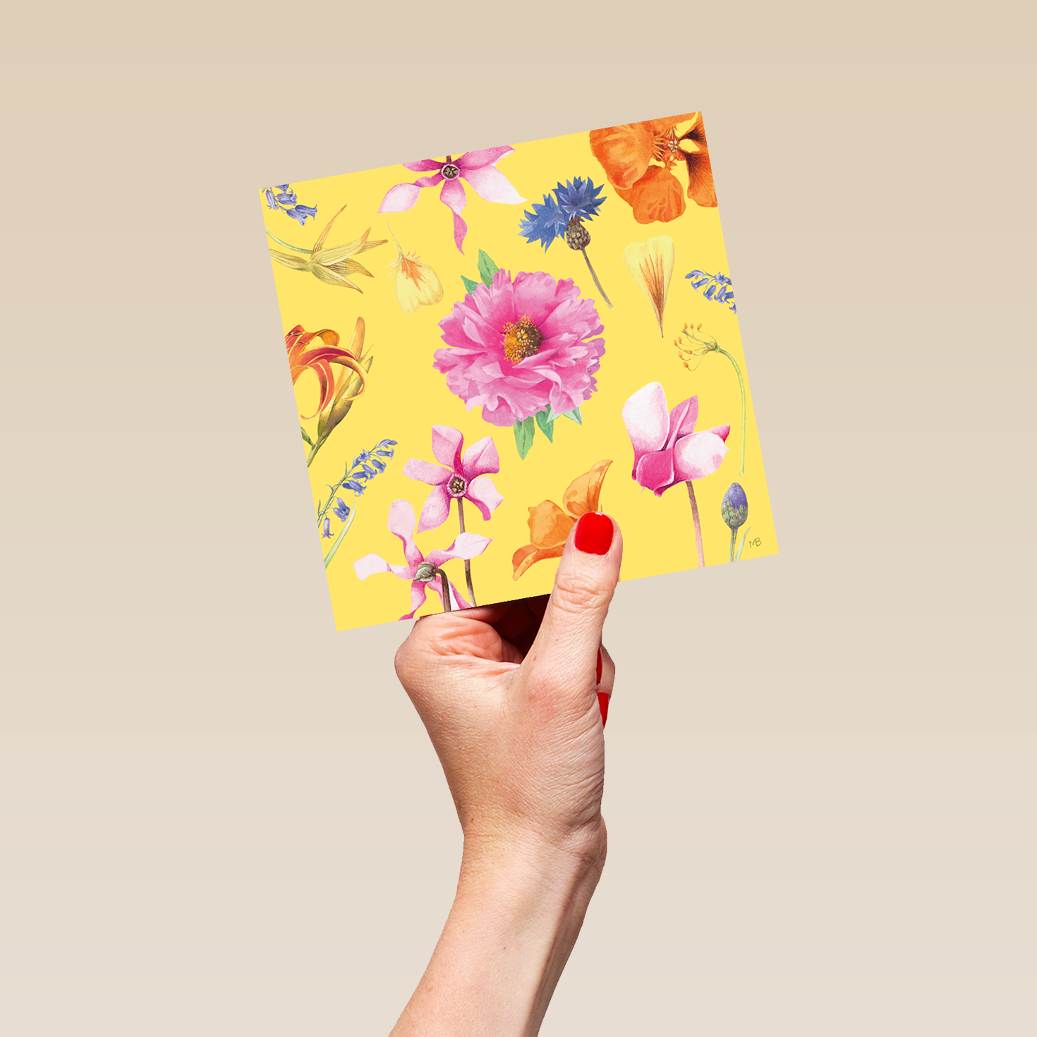 Printed on premium-quality board, this card features a yellow background with a busy floral design, with wildflowers including Bluebells, Thistles, Crocosmia and more, inspired by our Marjolein Bastin range, and comes complete with a co-ordinating white envelope.