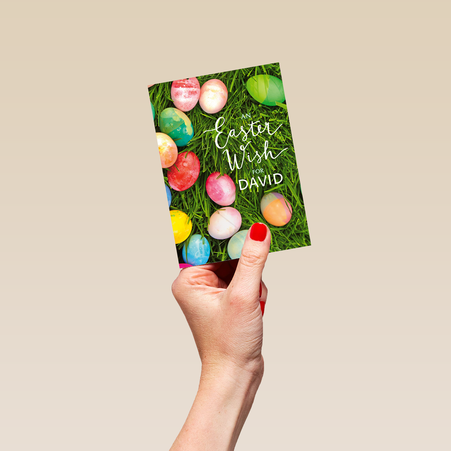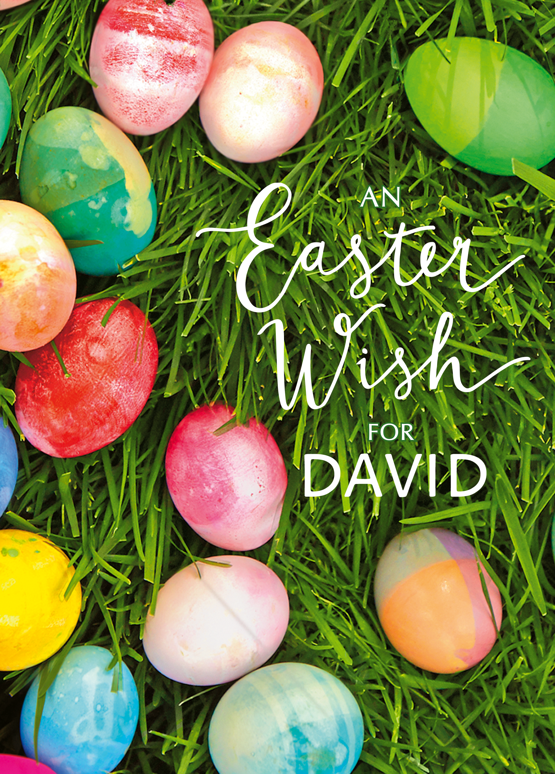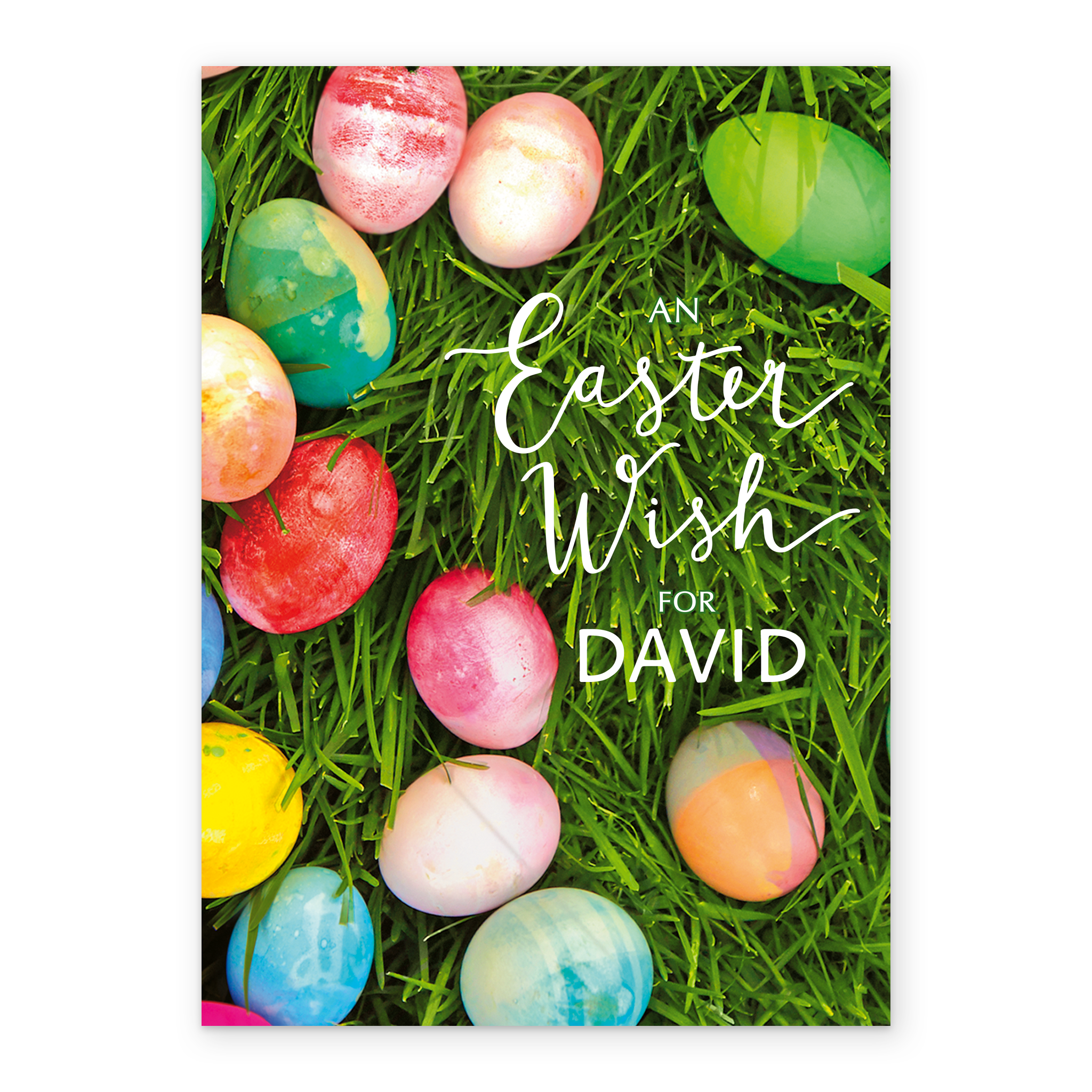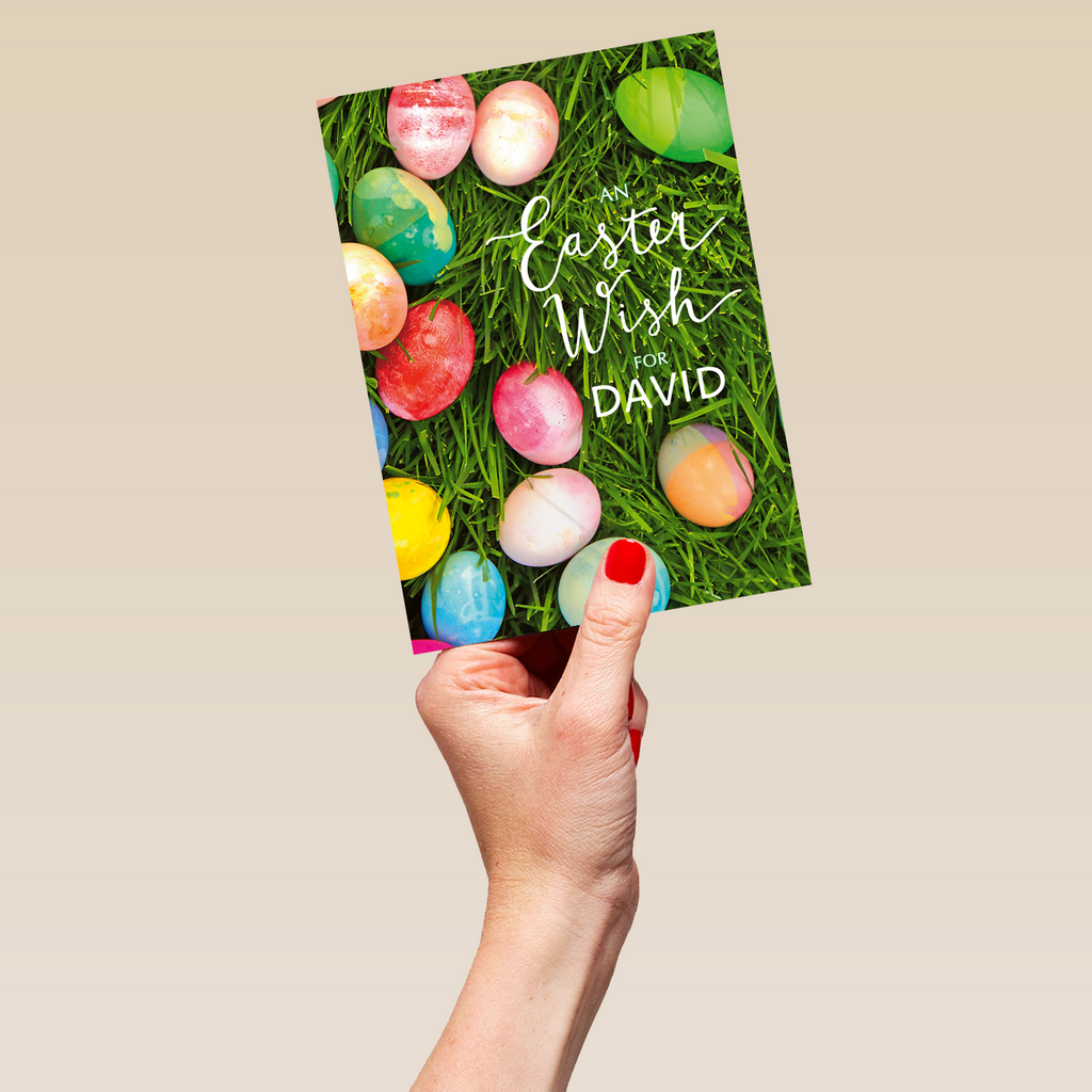 Printed on premium-quality board, this card features a photograph of traditional painted Easter eggs laying on fresh green grass, with the message 'An Easter Wish For ____', space to personalise a name, and comes complete with a co-ordinating white envelope.
