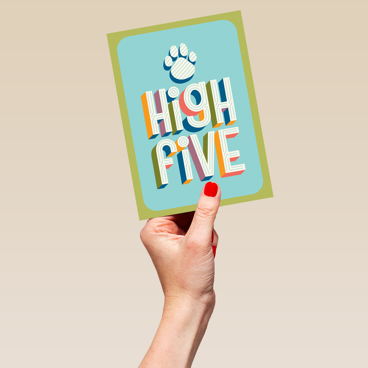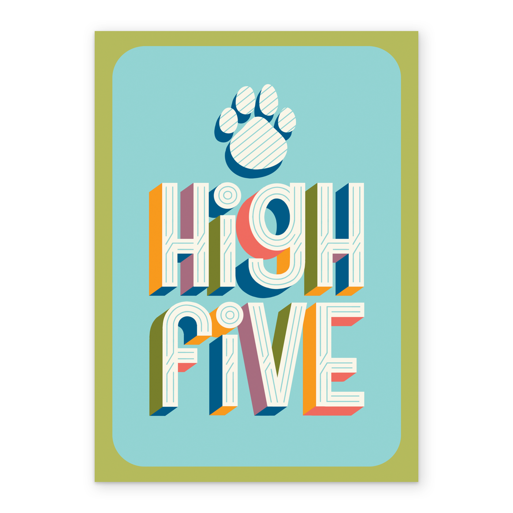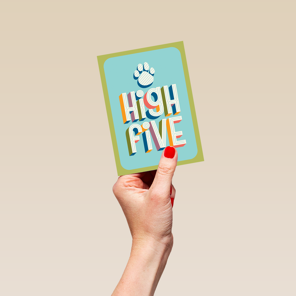 Printed on premium-quality board, this card features a bold word art design with a paw print, with the message 'High Five', and comes complete with a co-ordinating white envelope.