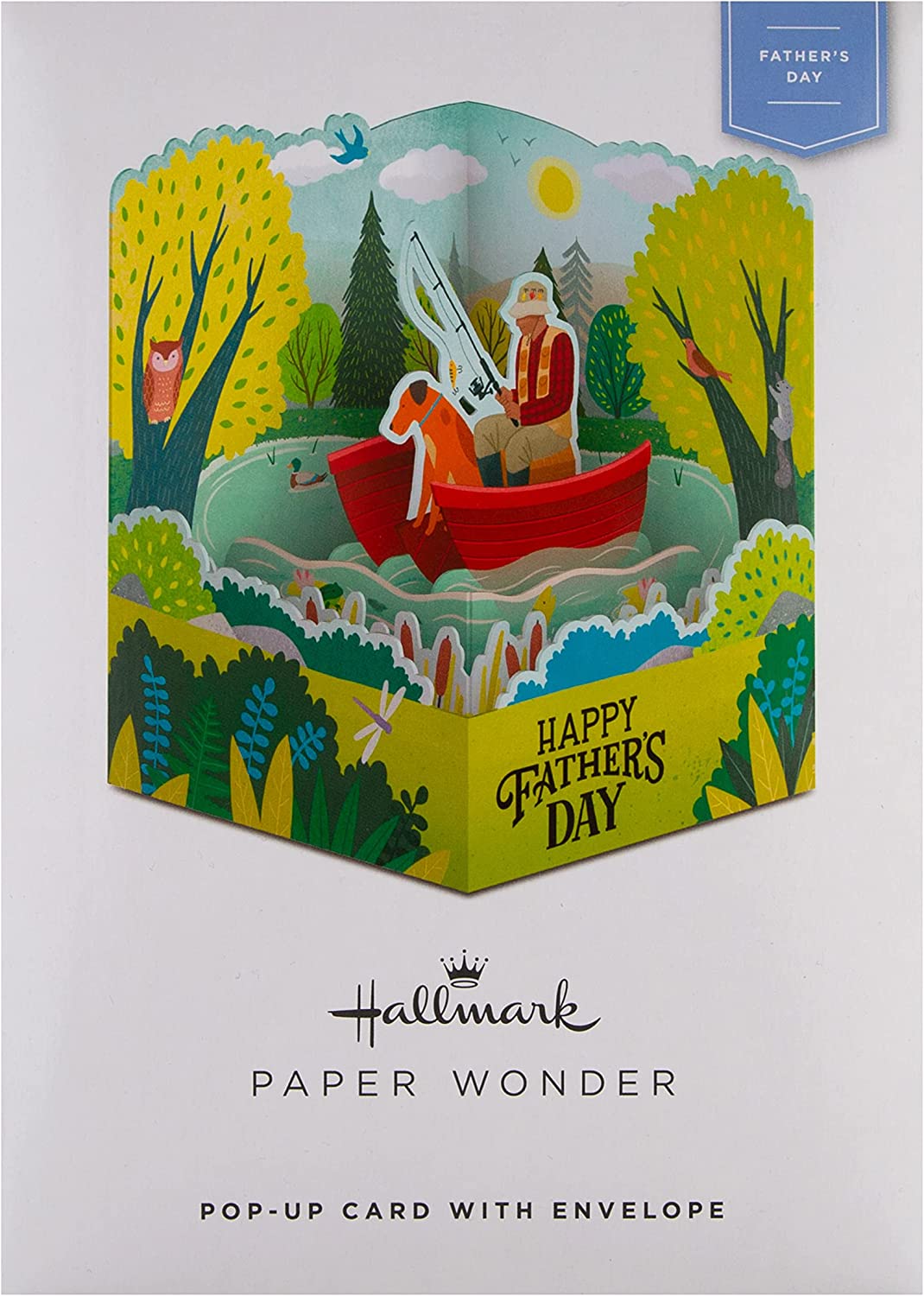 This card pops up into a 3D fishing scene, features die cut details and comes complete with a co-ordinating light green, Hallmark branded envelope.