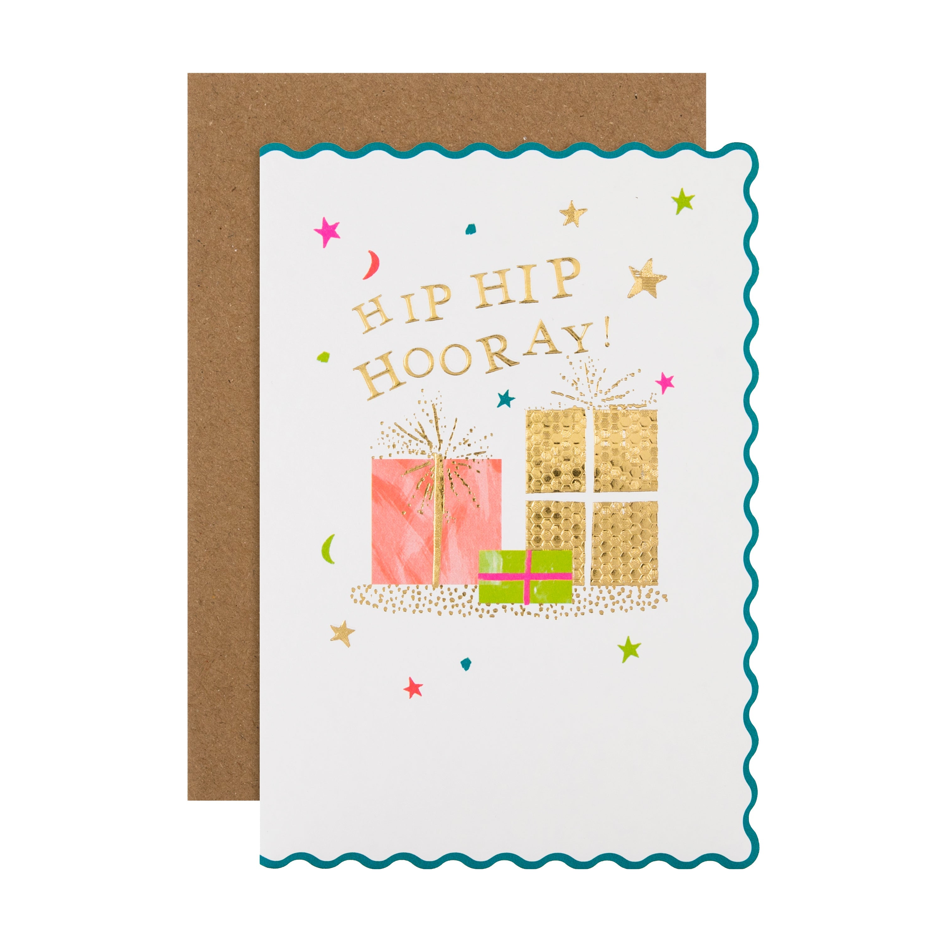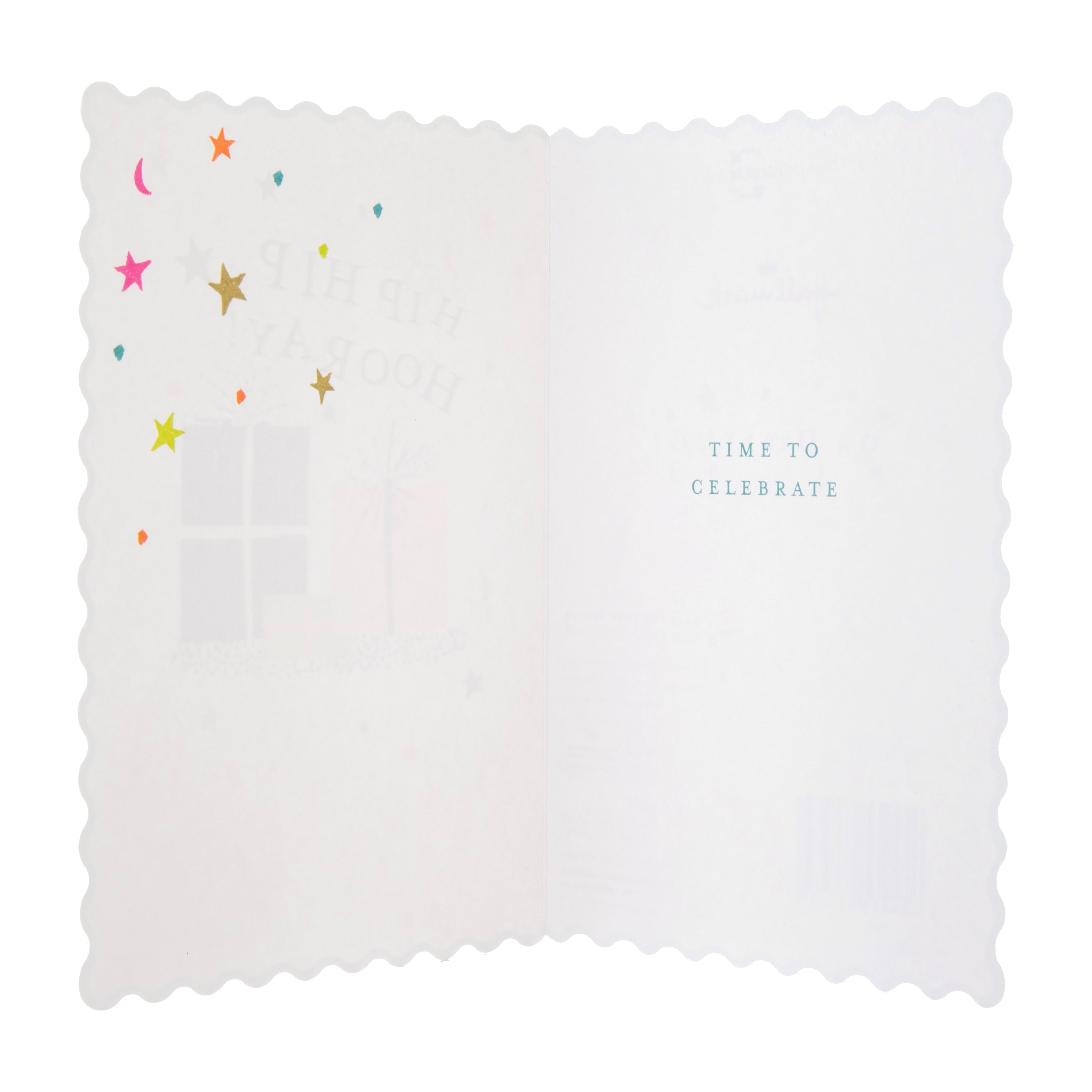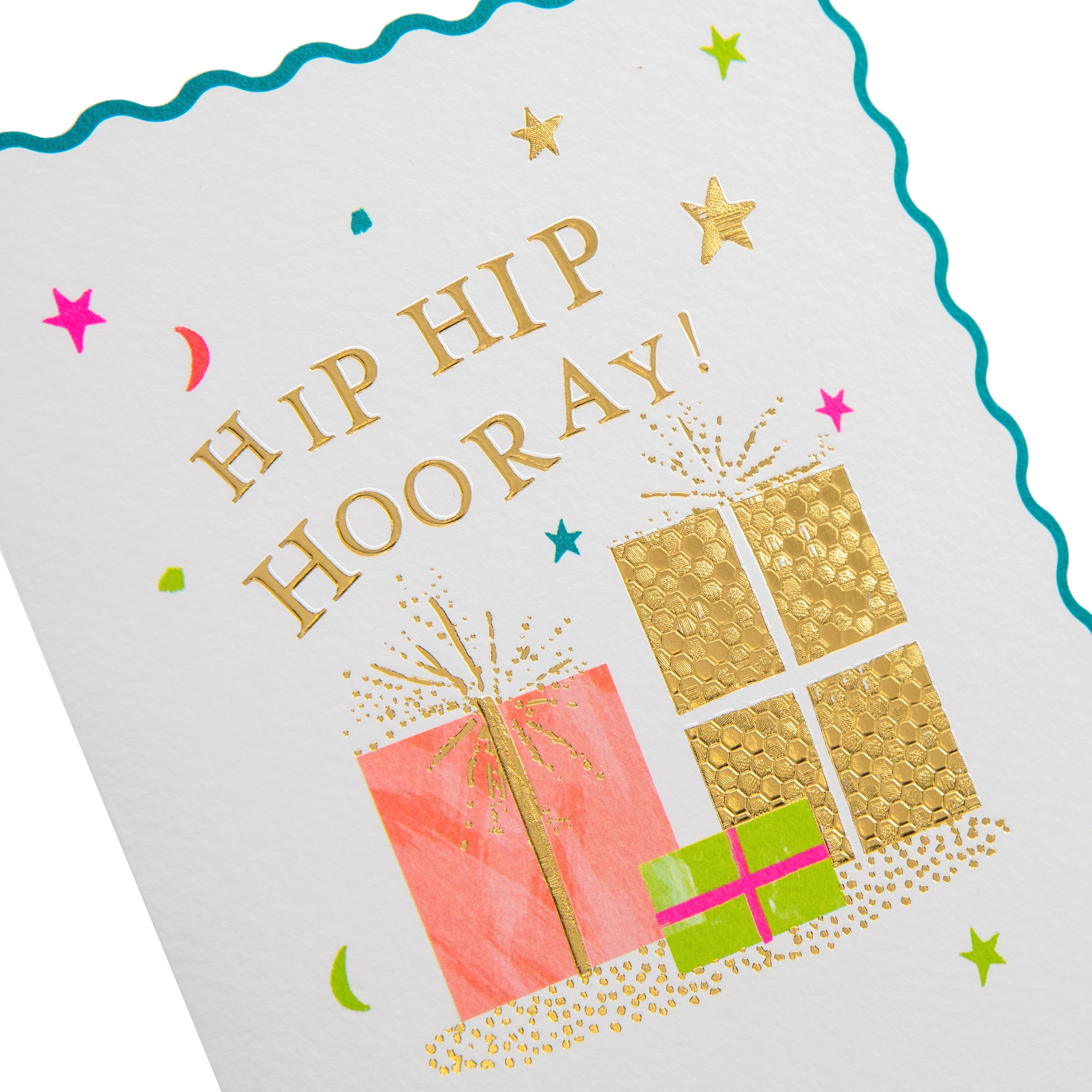 Printed on high-quality textured board, this card features embossed elements, textured embossed foil elements, neon print design, shaped edges, and comes complete with a co-ordinating Hallmark branded, Kraft envelope.