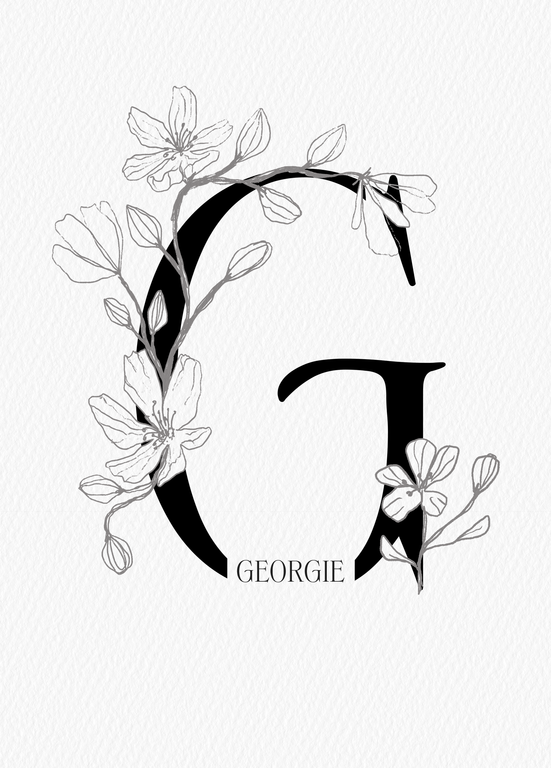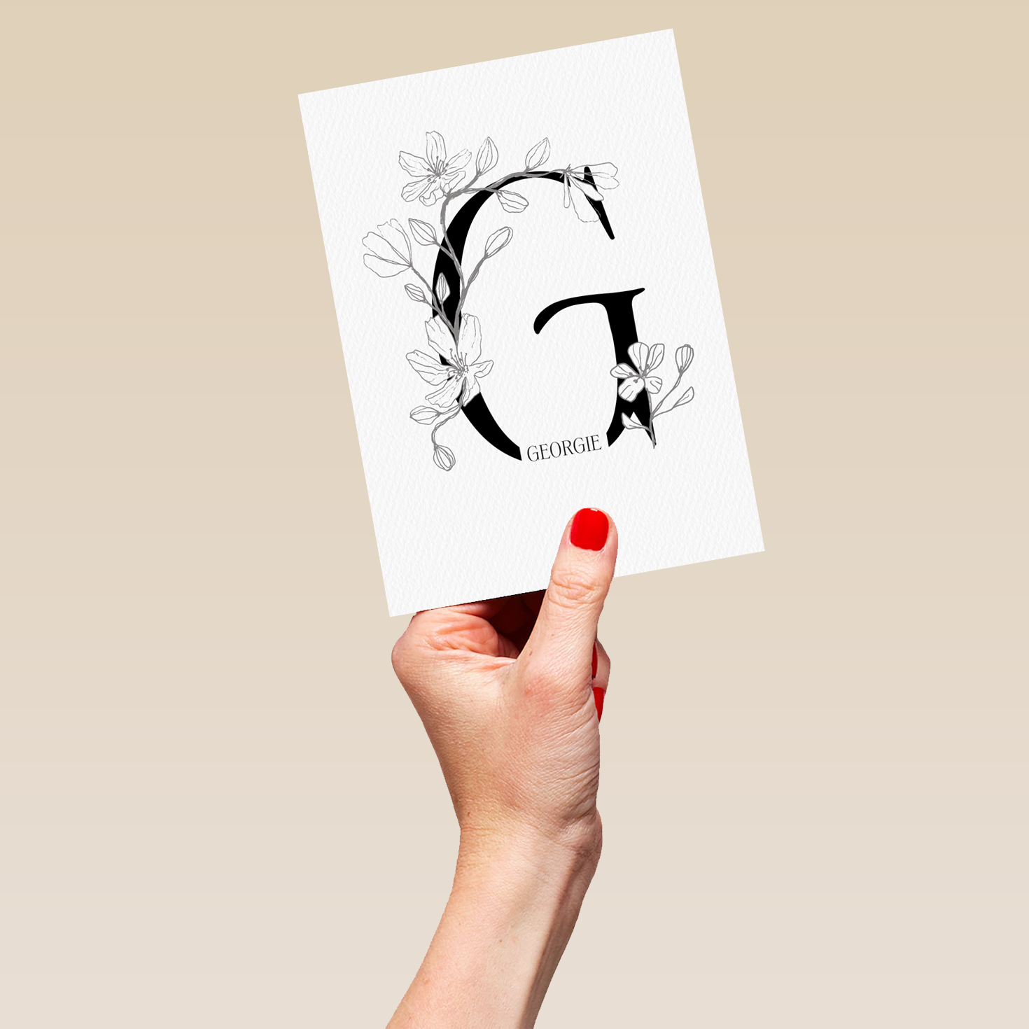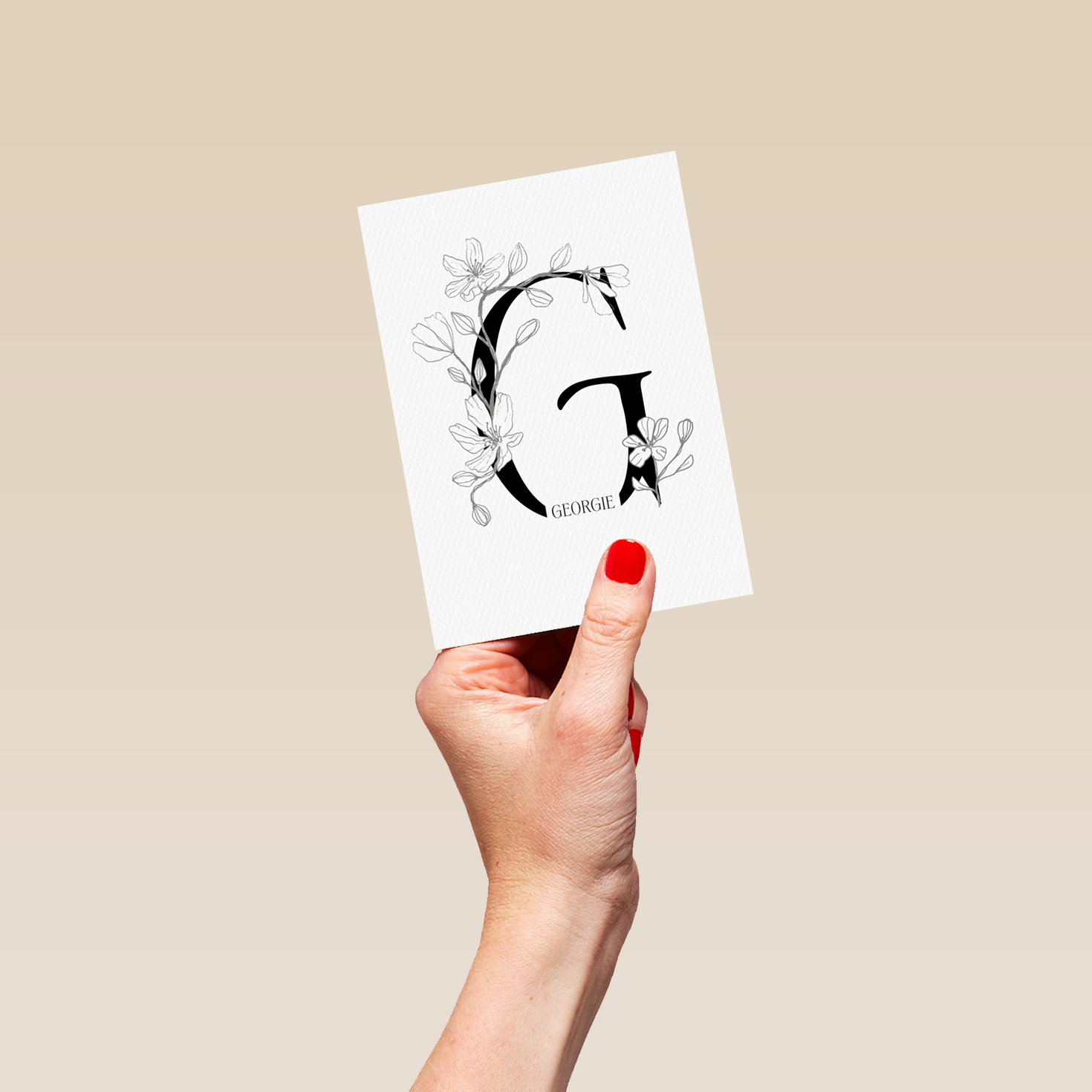 Printed on premium-quality board, this card features an illustrated floral embellished letter G, space to personalise a name, and comes complete with a co-ordinating white envelope.