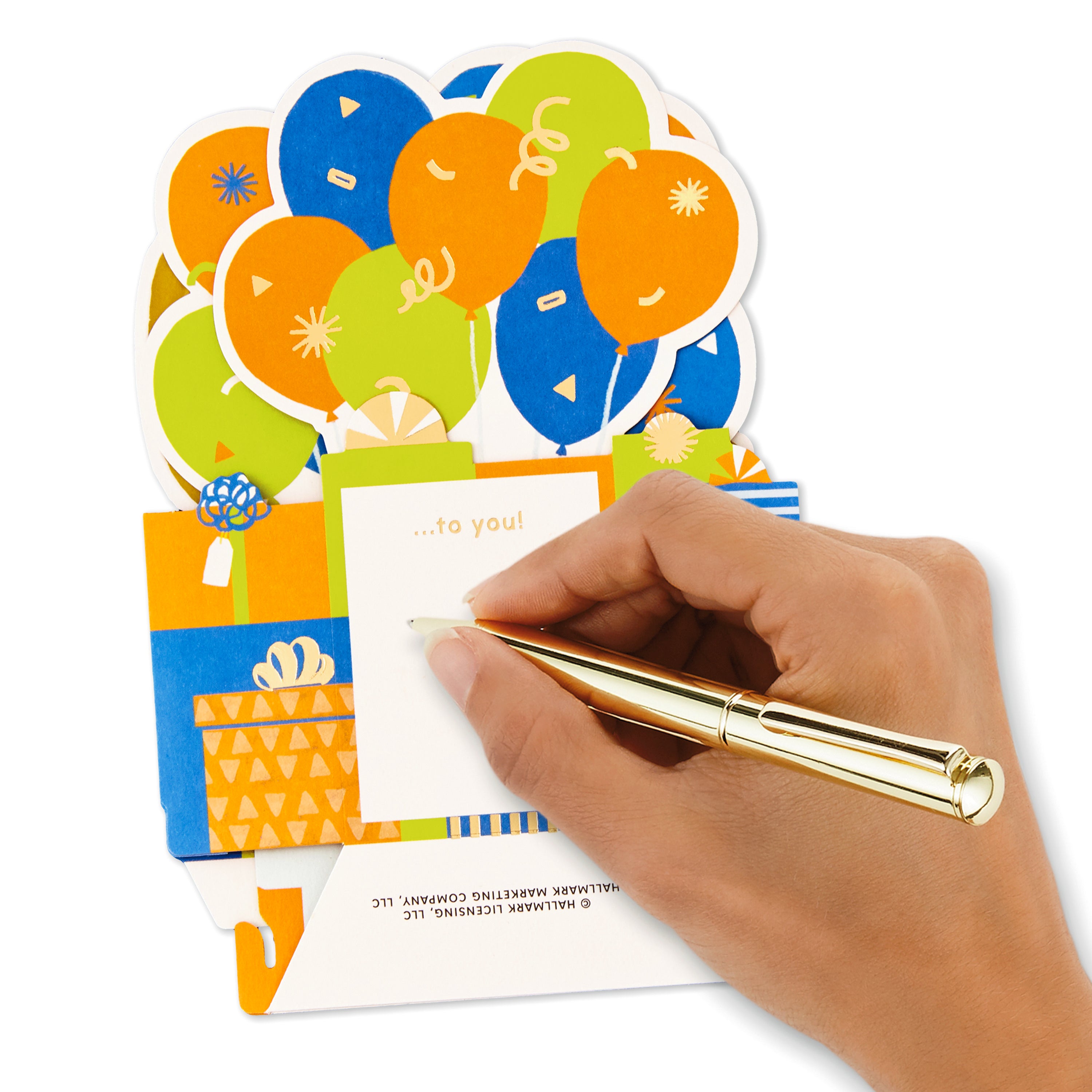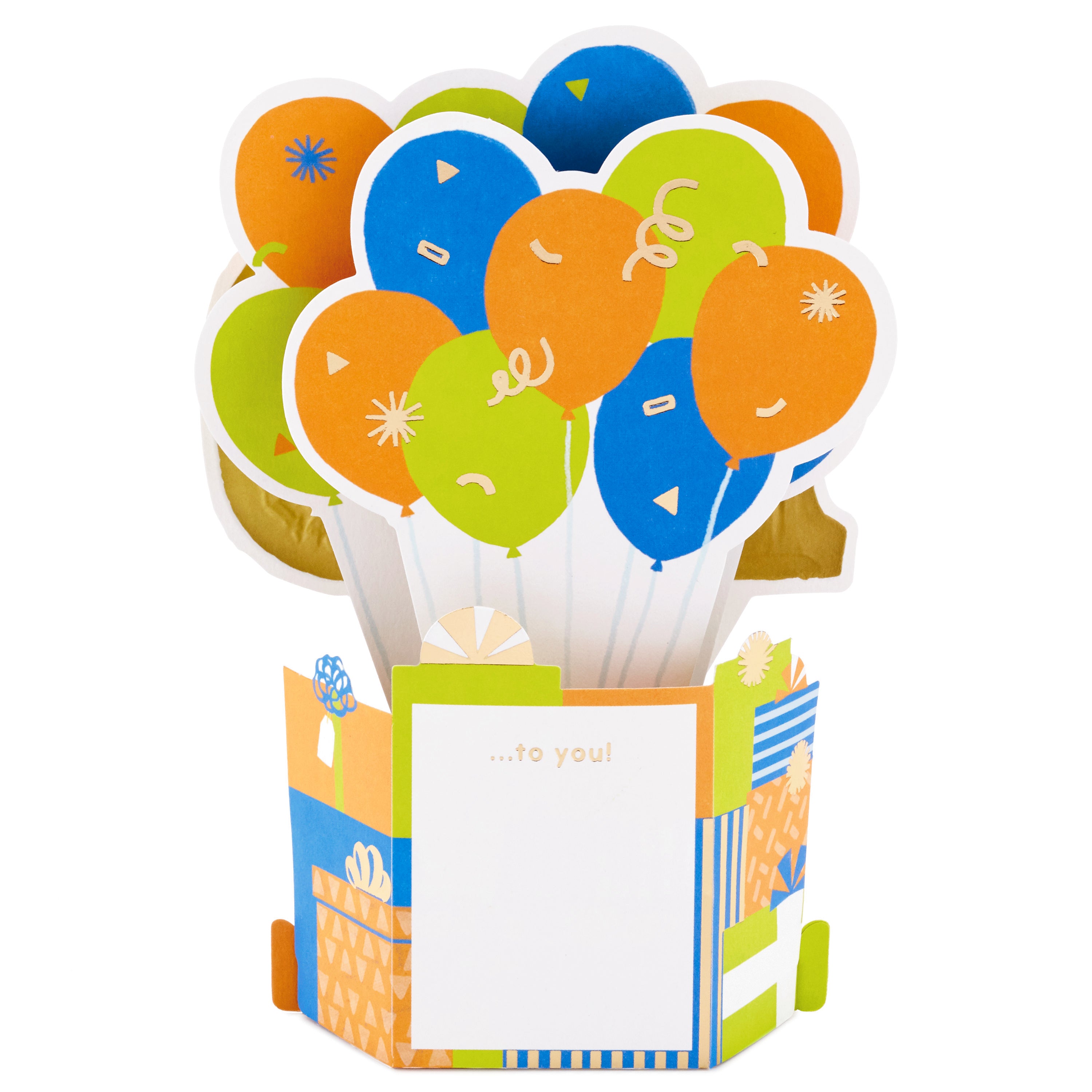 Printed on high quality board, with a simple, squeeze-to-pop-up mechanism, this brilliant card features a bold die-cut, 3D pop-up, orange, blue and green balloons design, with gold-foil 100 feature and lettering, and comes complete with a Hallmark branded, yellow envelope.