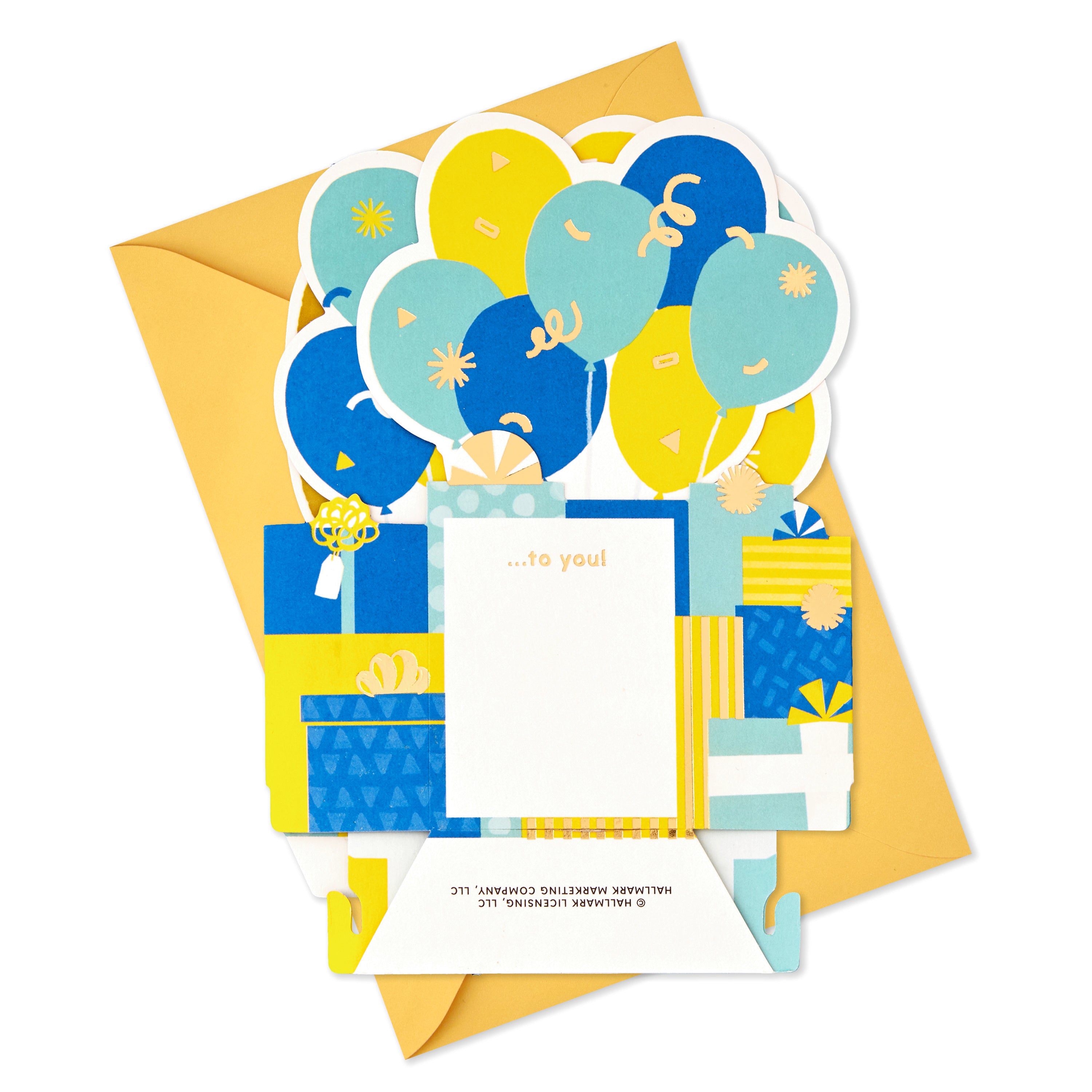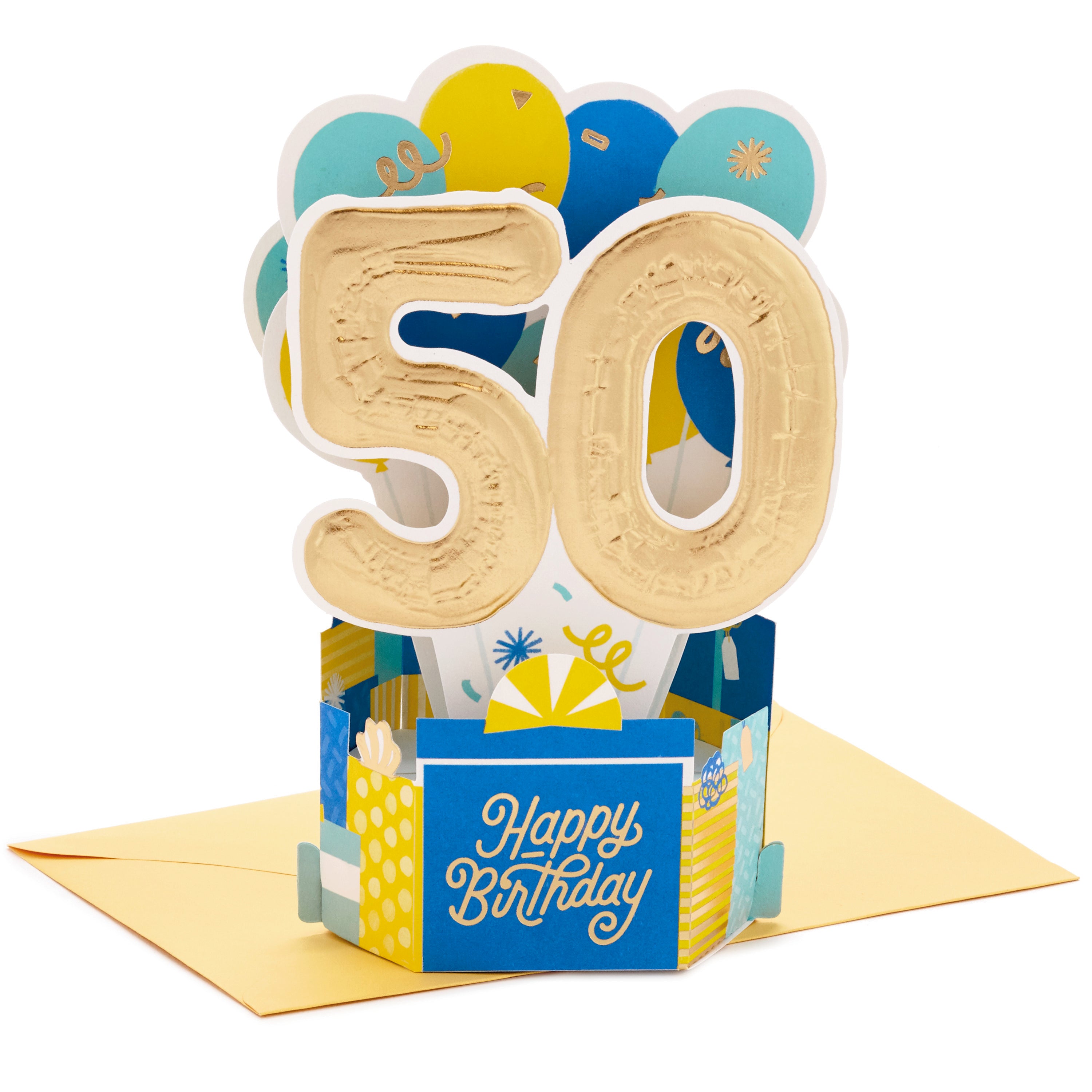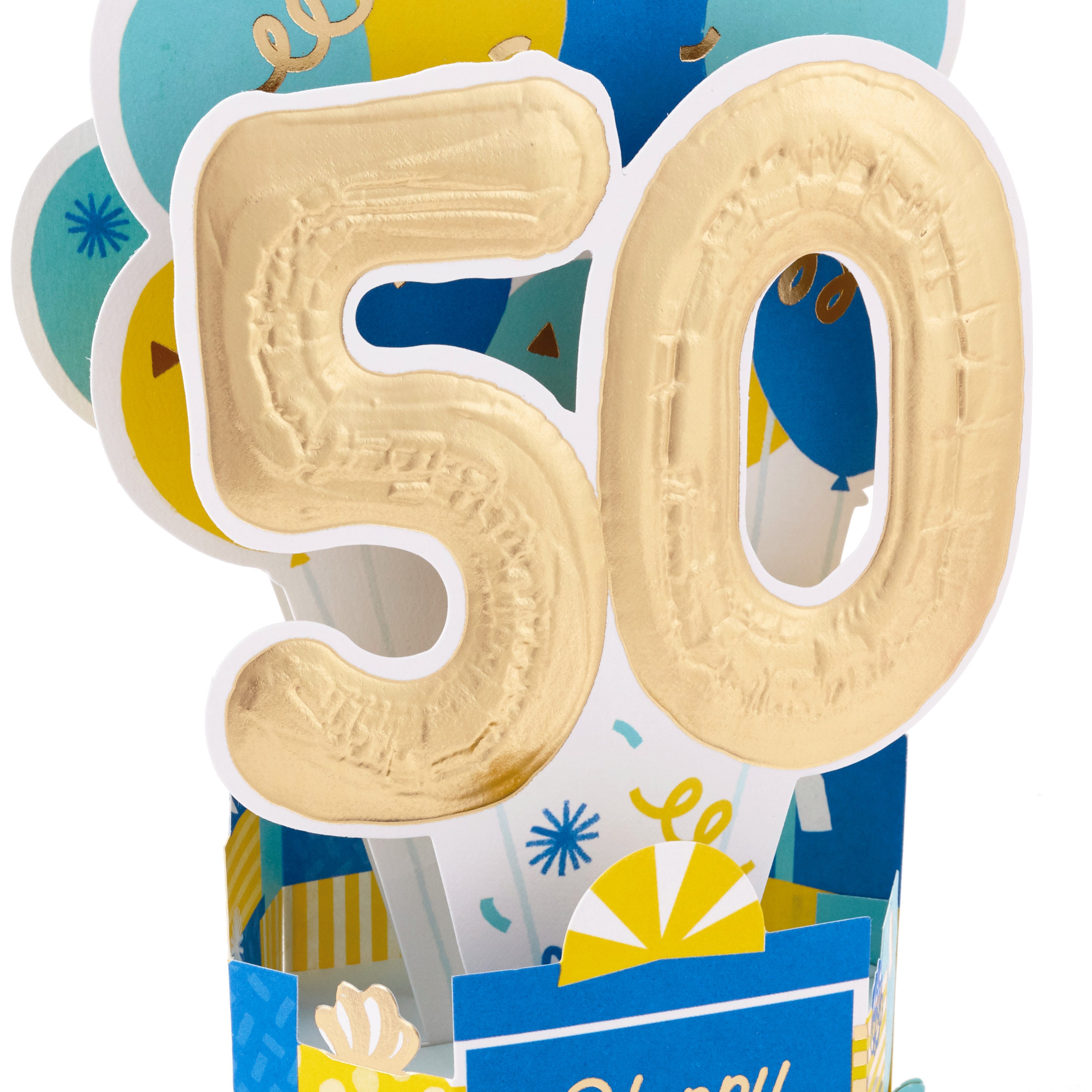 Printed on high quality board, with a simple, squeeze-to-pop-up mechanism, this striking card features a bold die-cut, 3D, blue and yellow balloons design, with gold-foil 50 feature and lettering, and comes complete with a Hallmark branded, yellow envelope.