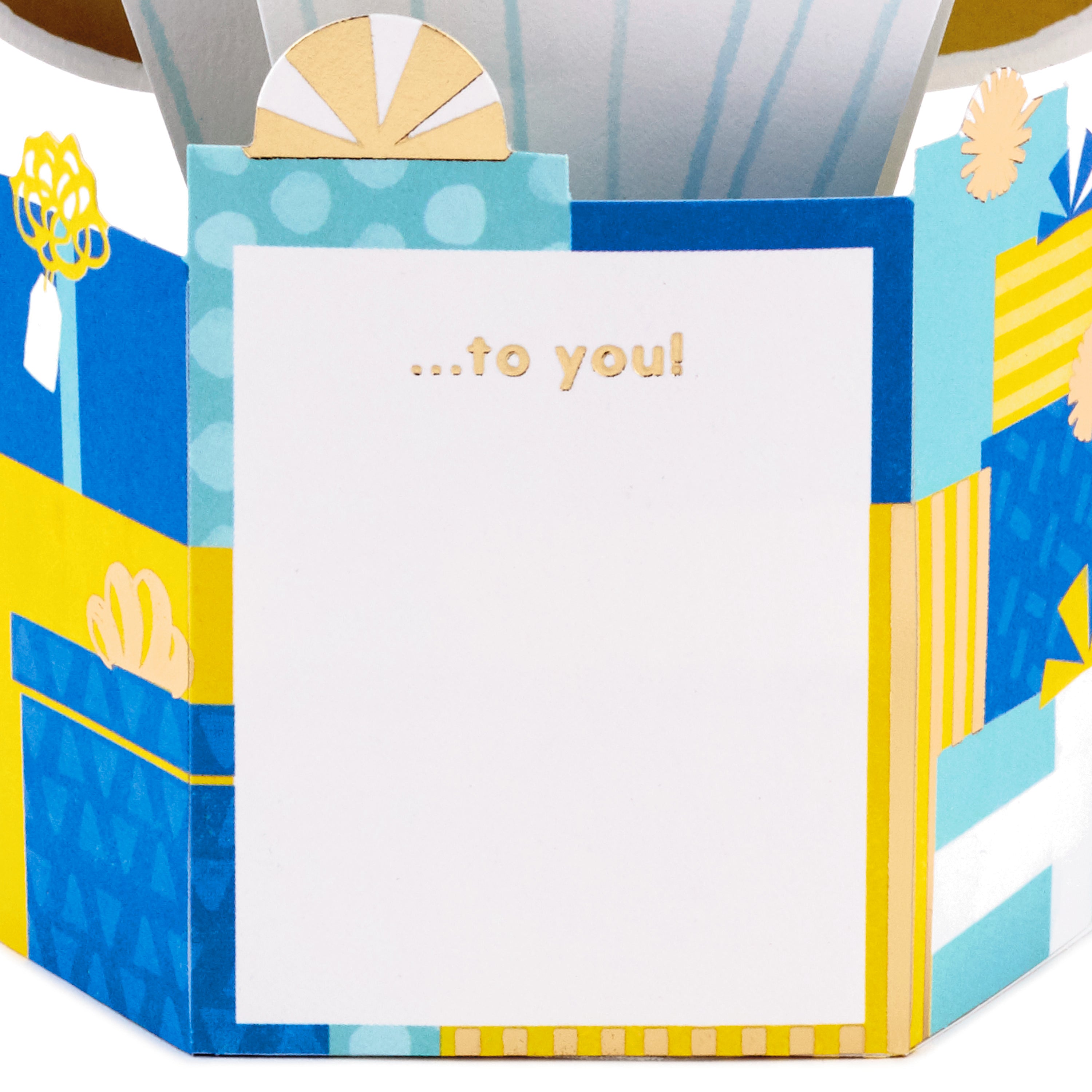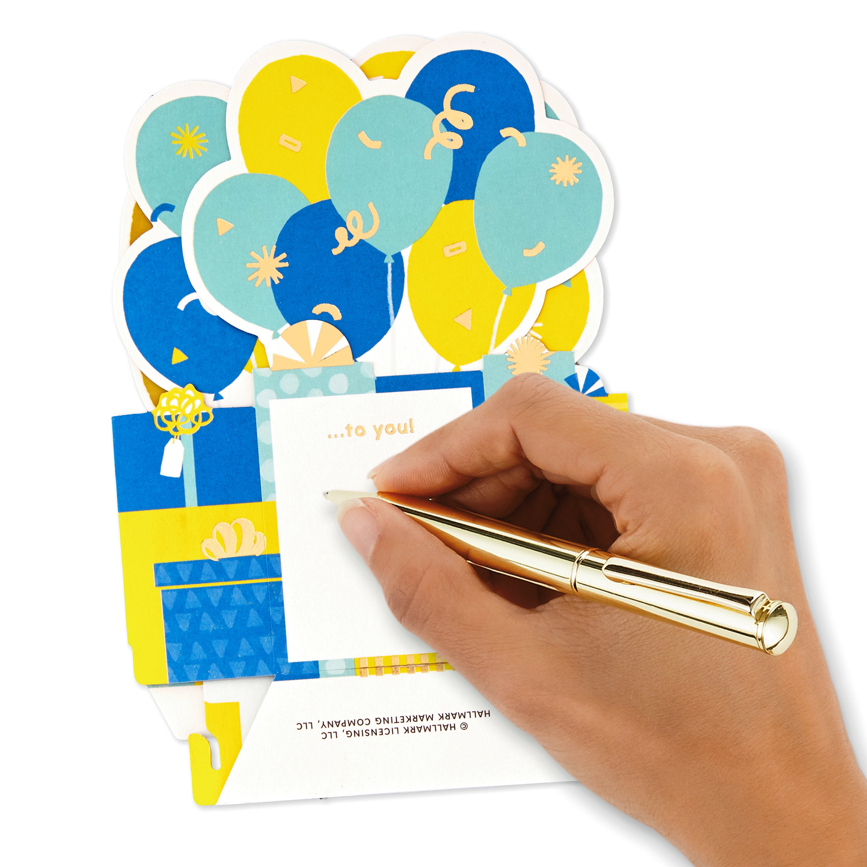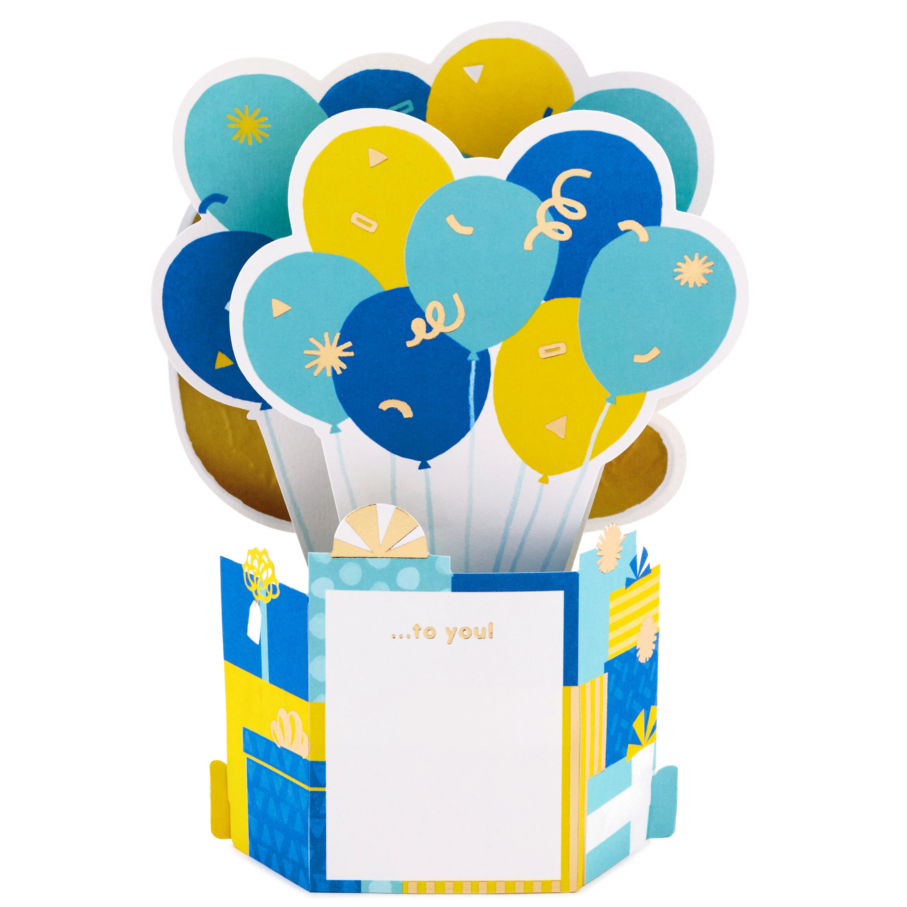 Printed on high quality board, with a simple, squeeze-to-pop-up mechanism, this striking card features a bold die-cut, 3D, blue and yellow balloons design, with gold-foil 50 feature and lettering, and comes complete with a Hallmark branded, yellow envelope.