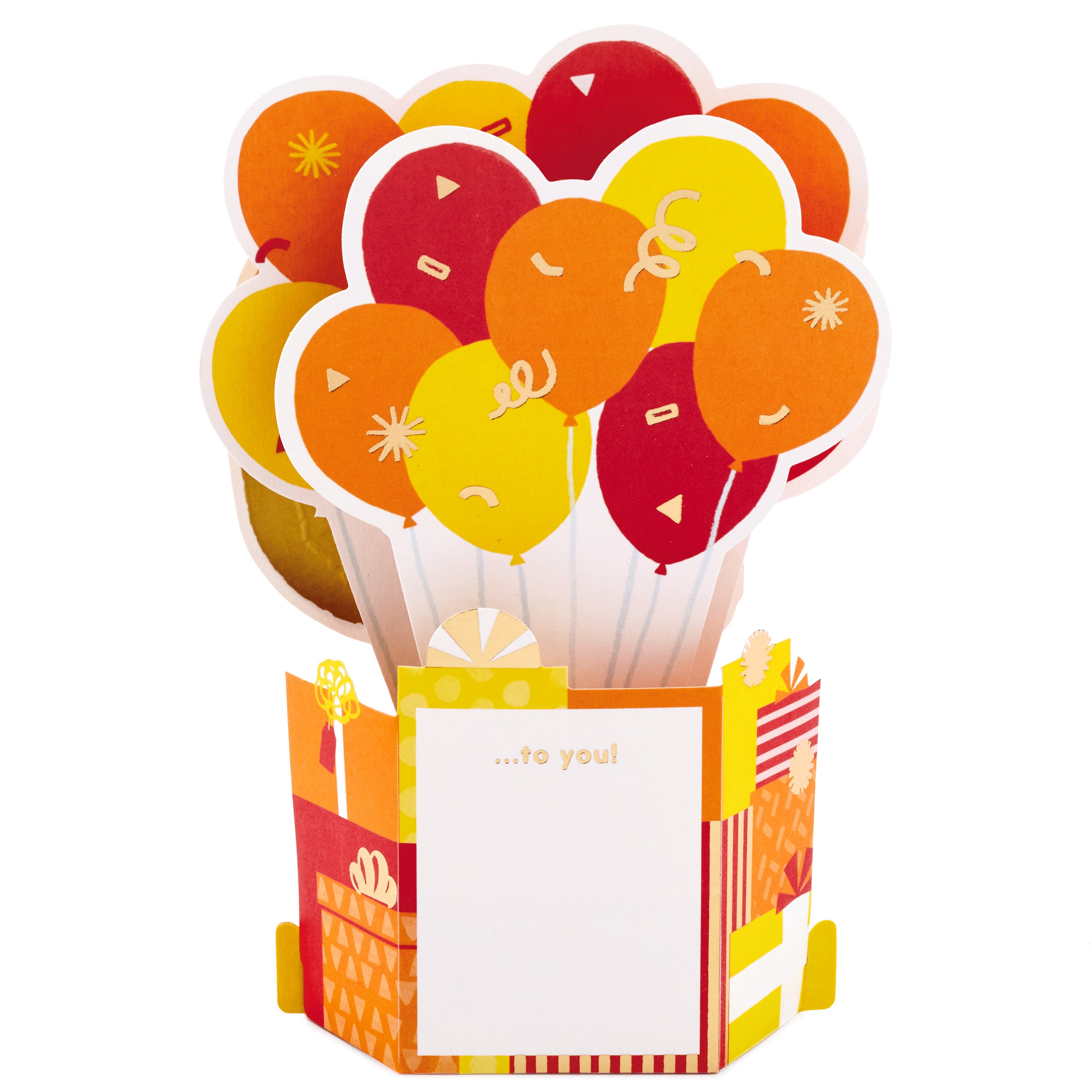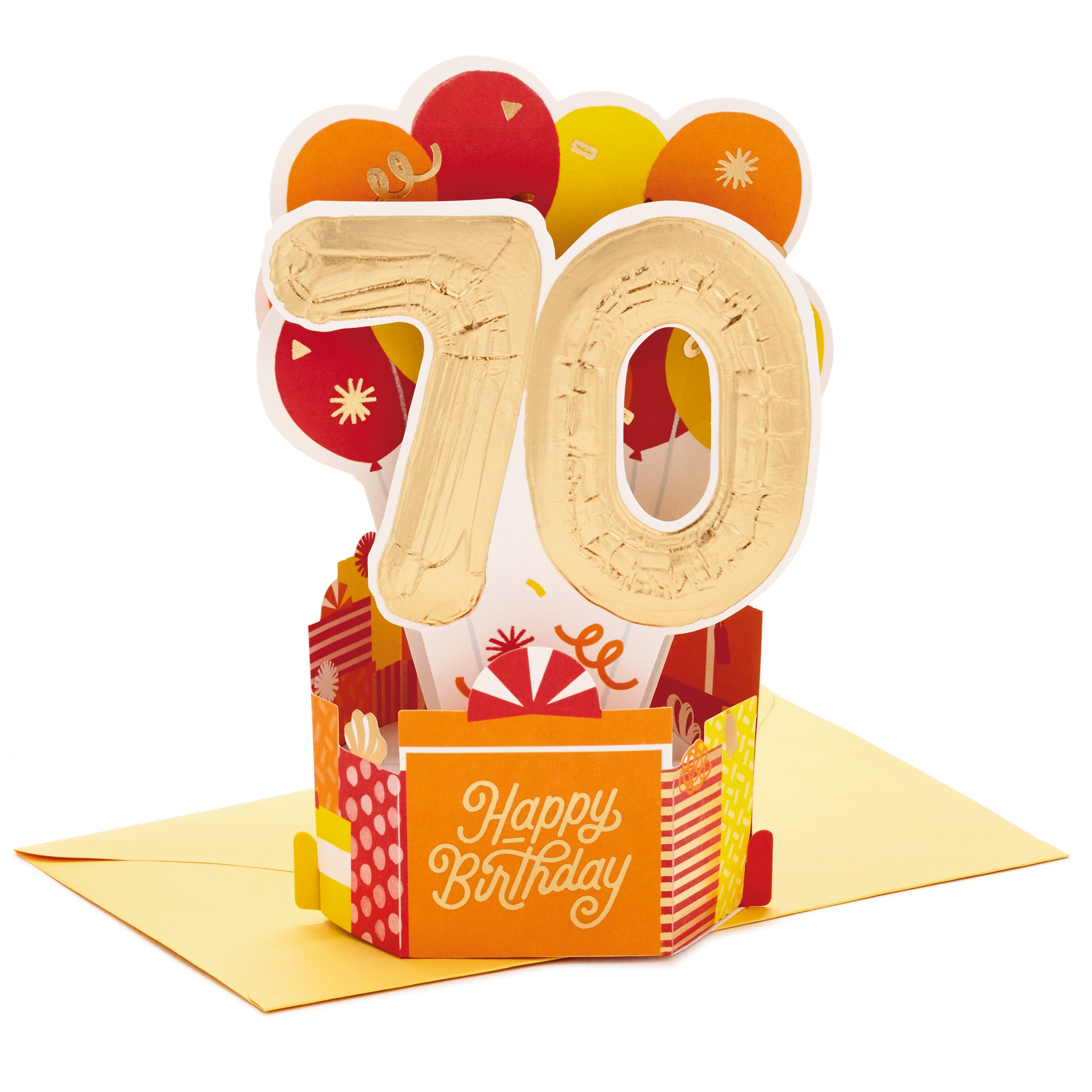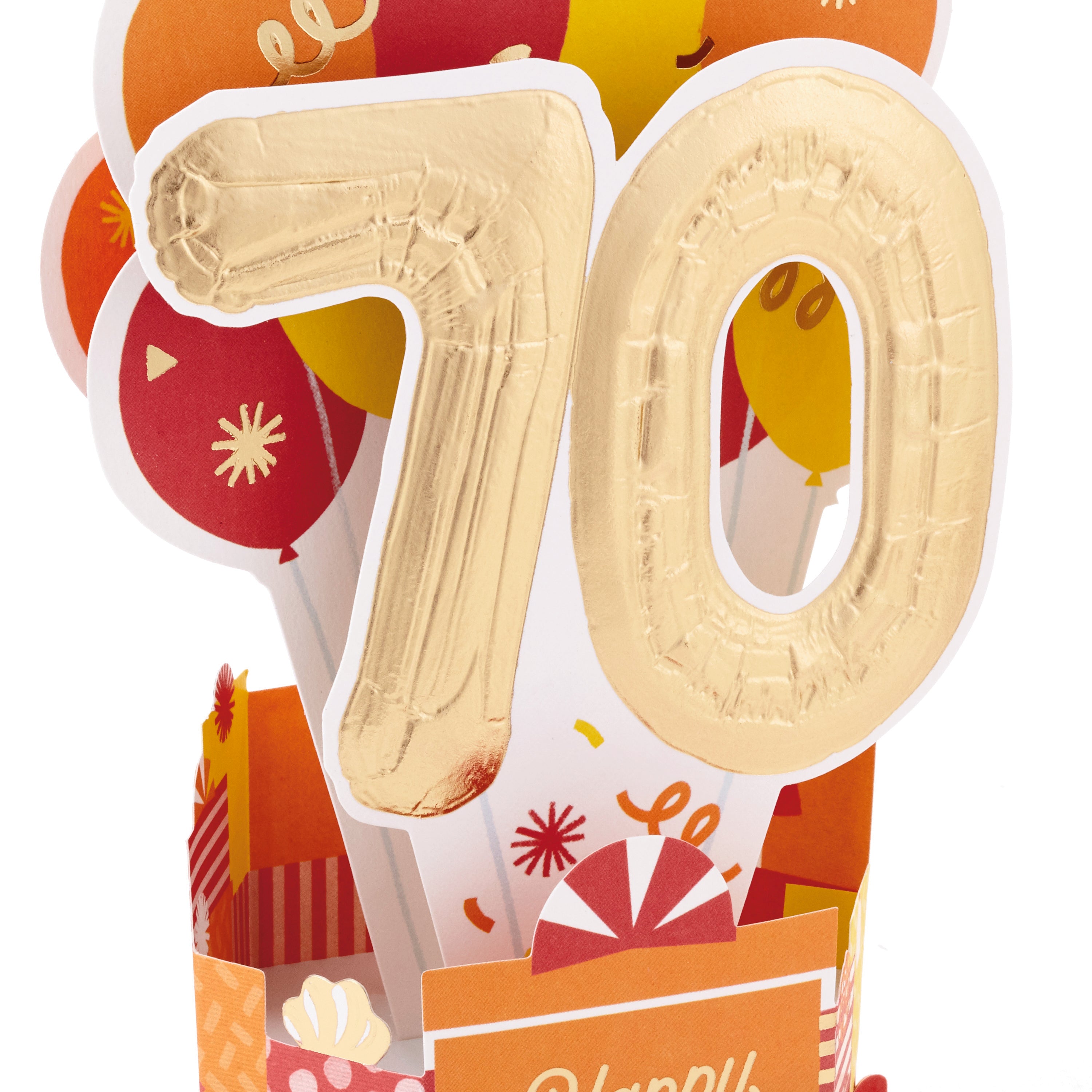 Printed on high quality board, with a simple, squeeze-to-pop-up mechanism, this colourful card features a bold die-cut, 3D, red, orange and yellow balloons design, with gold-foil 70 feature and lettering, and comes complete with a Hallmark branded, yellow envelope.