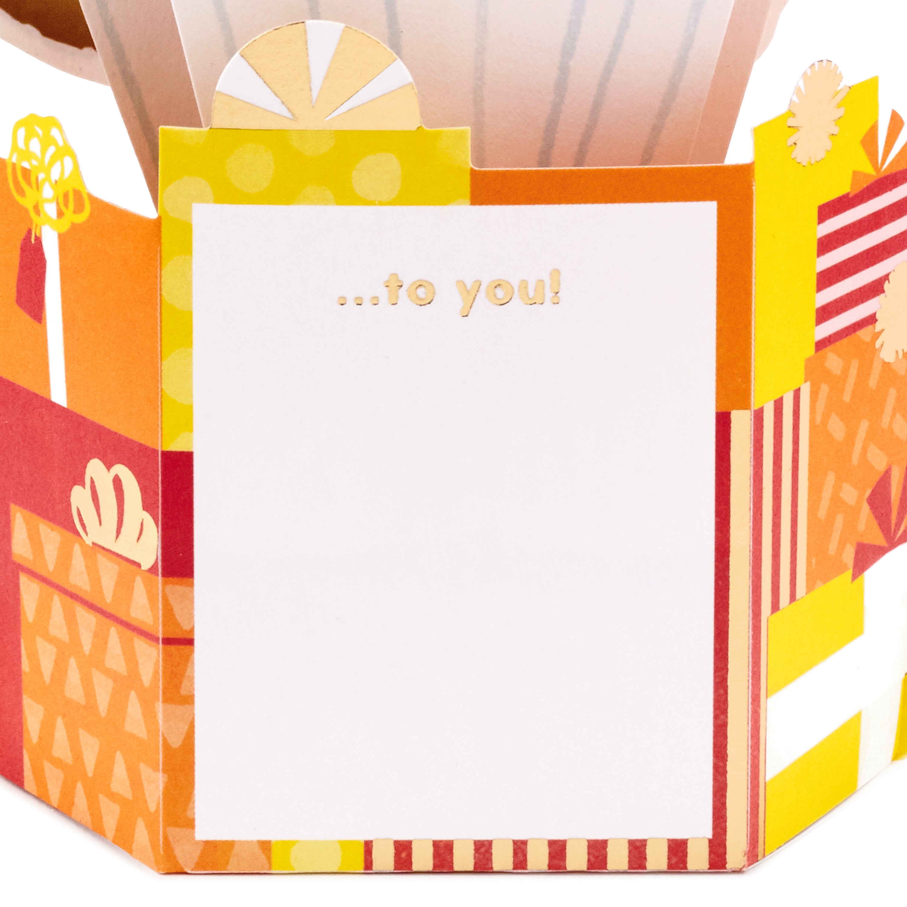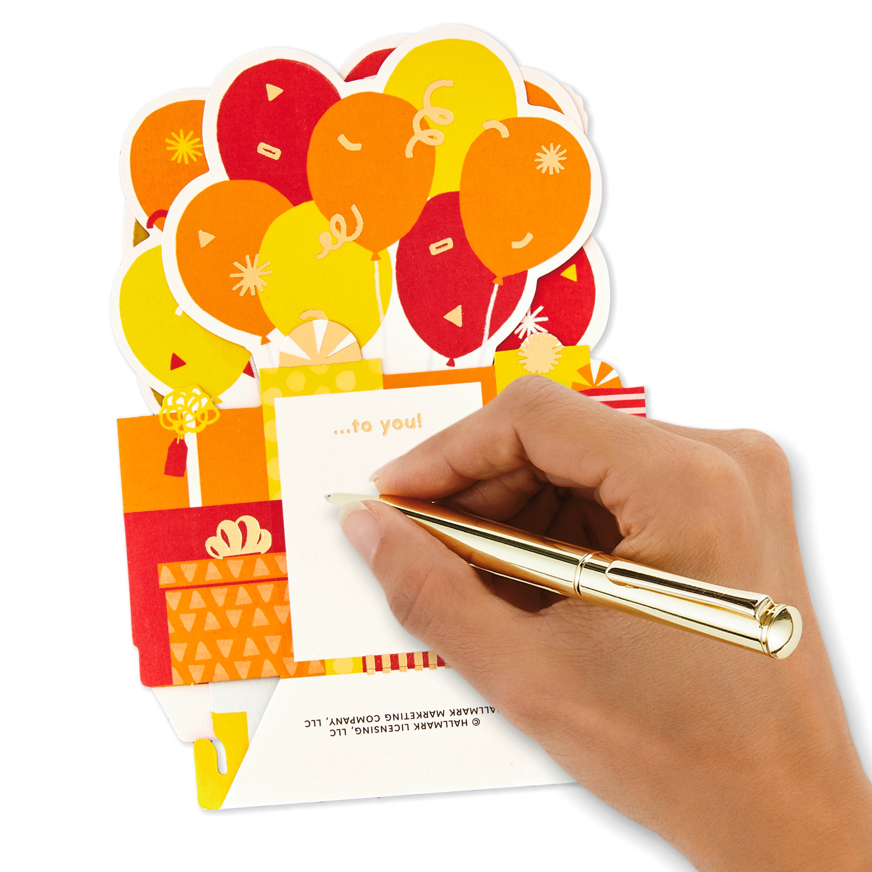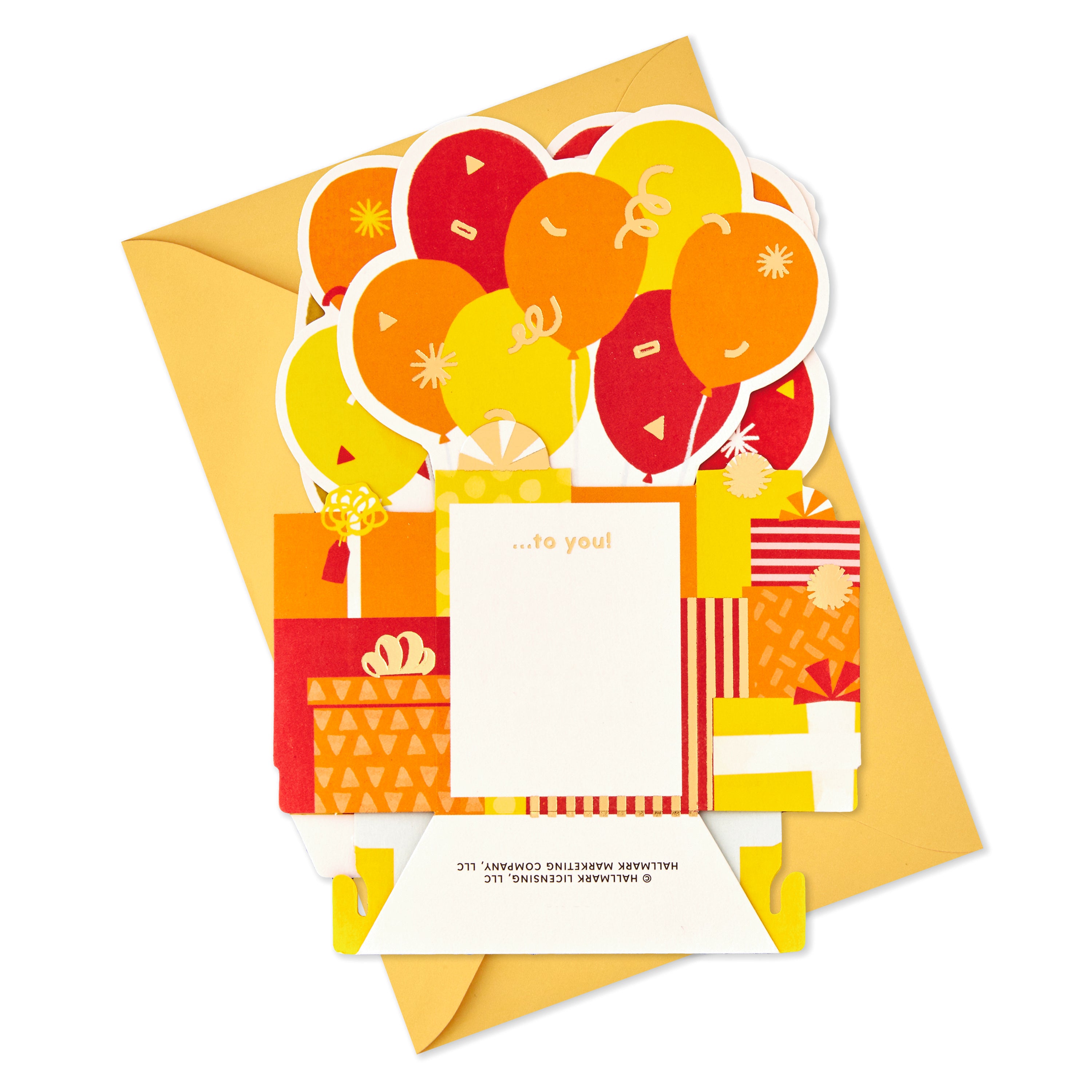 Printed on high quality board, with a simple, squeeze-to-pop-up mechanism, this colourful card features a bold die-cut, 3D, red, orange and yellow balloons design, with gold-foil 70 feature and lettering, and comes complete with a Hallmark branded, yellow envelope.