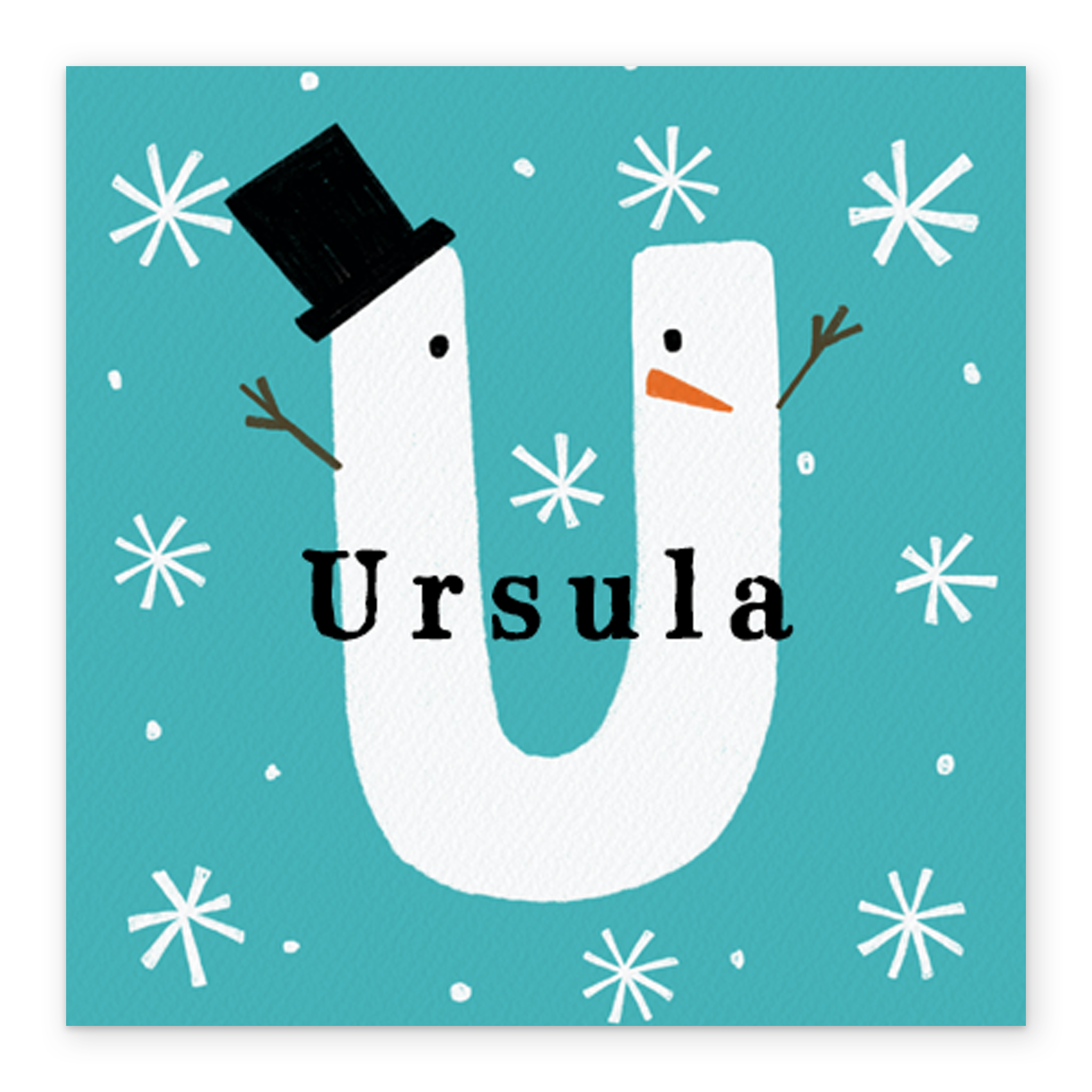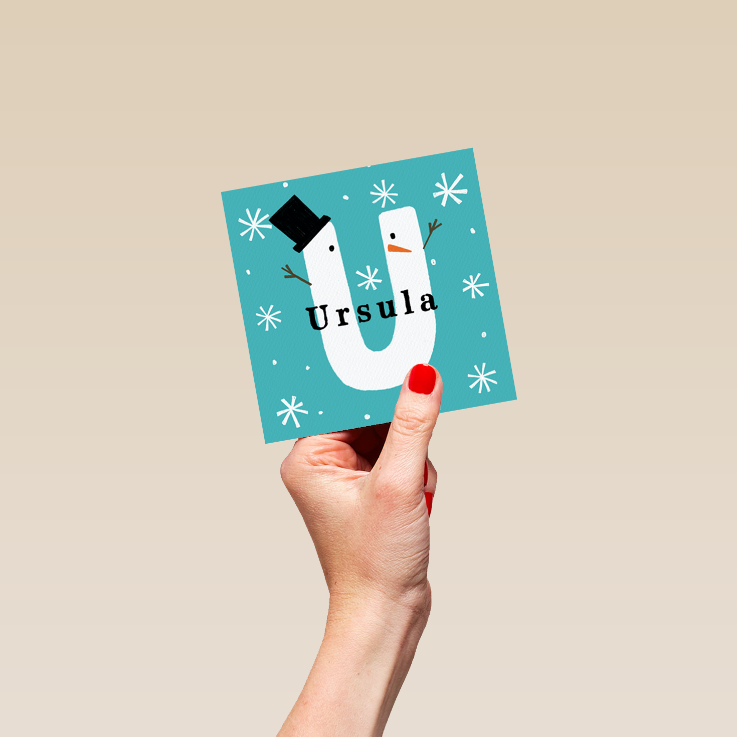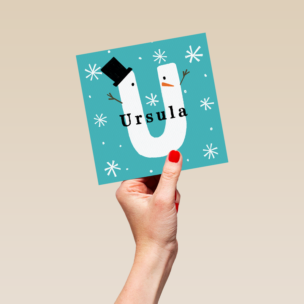 Show them you care with a personalised snowman monogram letter U Christmas card from Hallmark. Our greetings cards are printed on premium quality, FSC®-certified card & delivered nationwide. This card is available as standard 12cm by 12cm and large 15cm by 15cm.