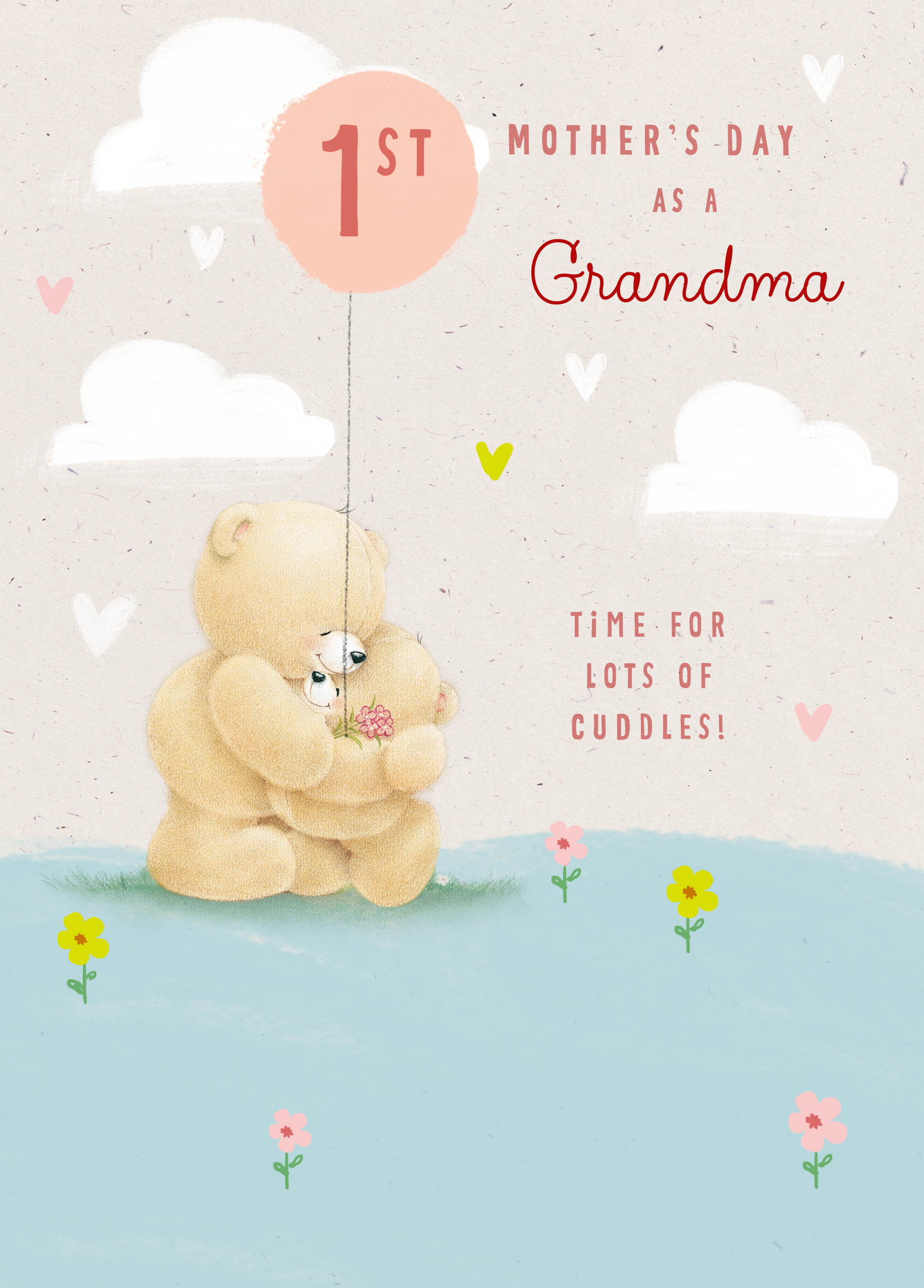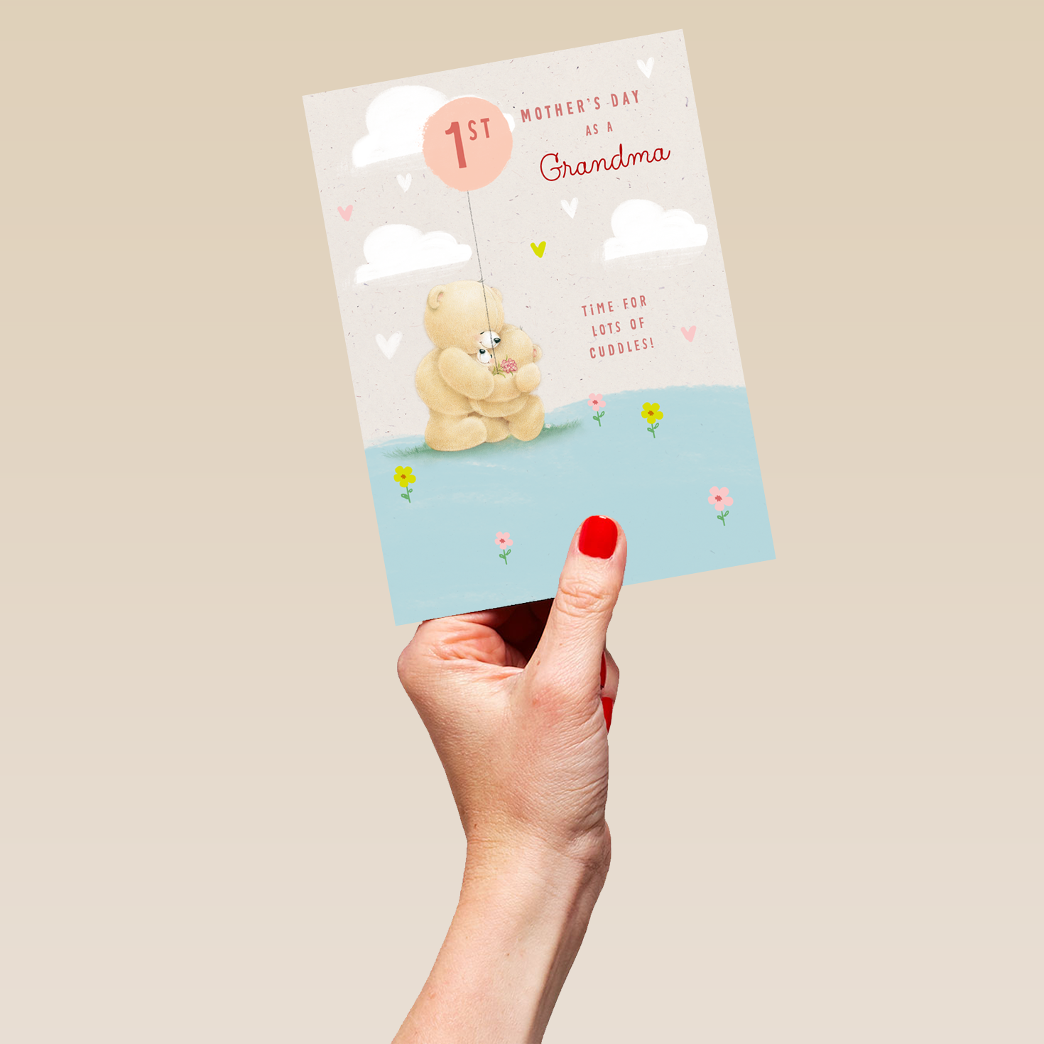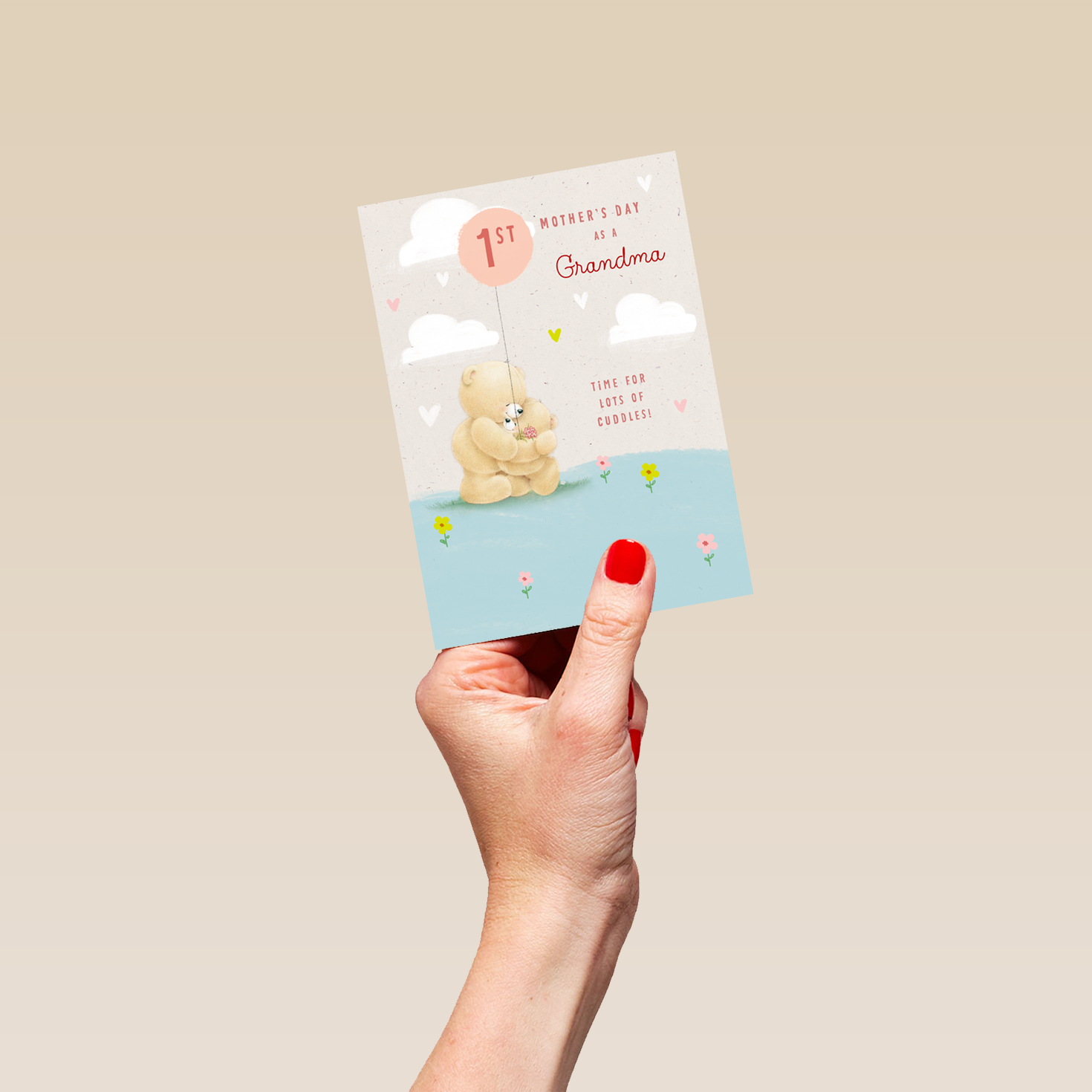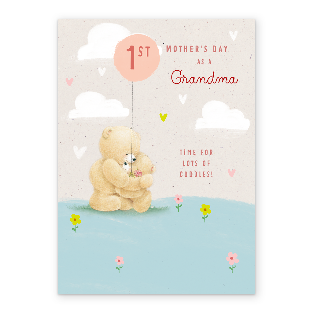 Printed on premium-quality board, this card features 2 Forever Friends bears hugging amongst grass and colourful flowers, while holding flowers and a balloon , with the message '1st Mother's Day as a Grandma, Time for lots of cuddles!', space to personalise a name, and comes complete with a co-ordinating white envelope.