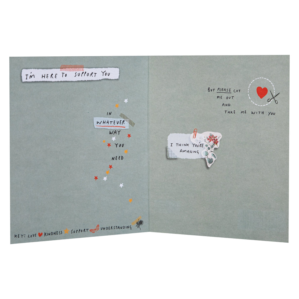 Message Inside Reads: I'm here to support you in whatever way you need, but please cut me out and take me with you. I think you're amazing. Key: Love, Kindness, Support, Understanding.