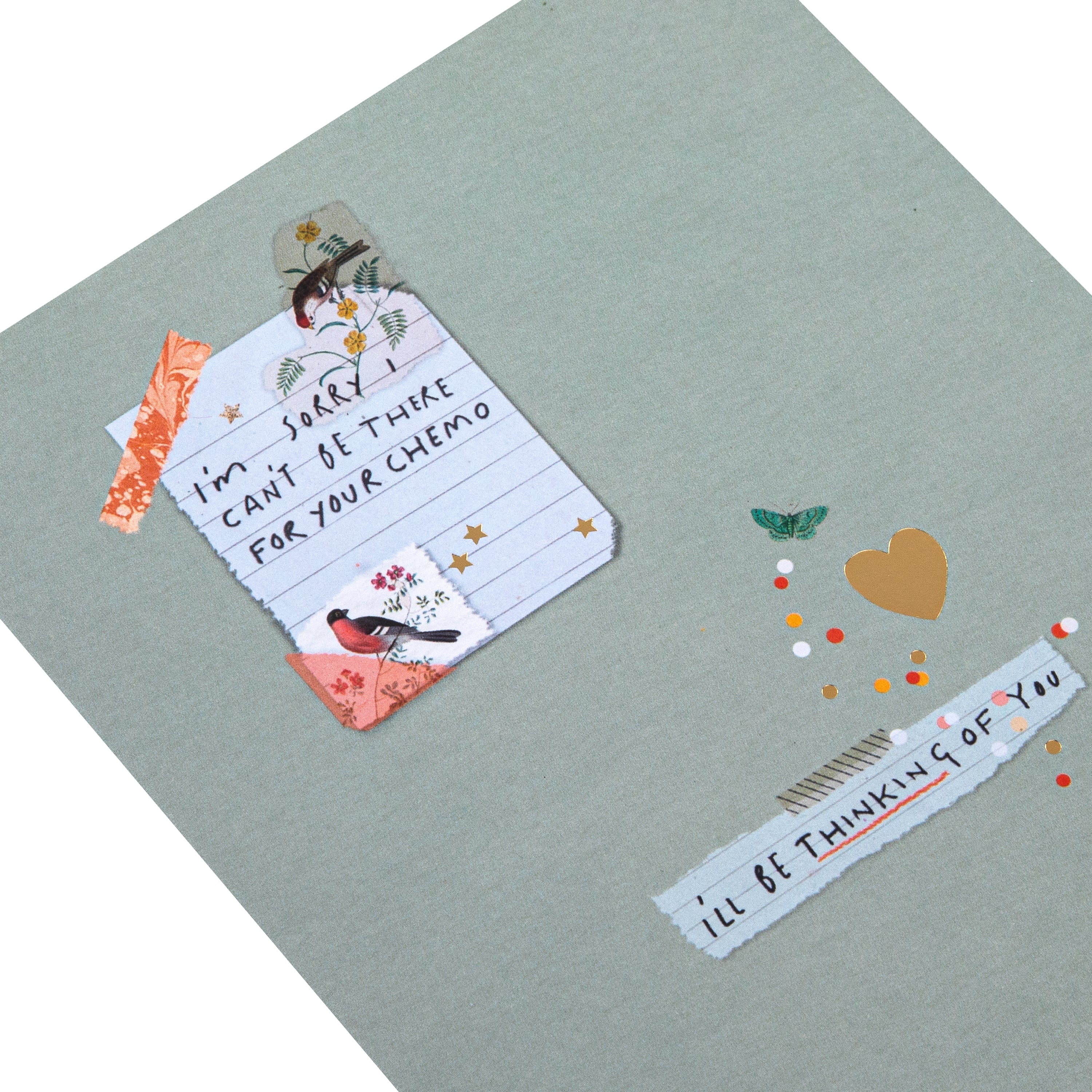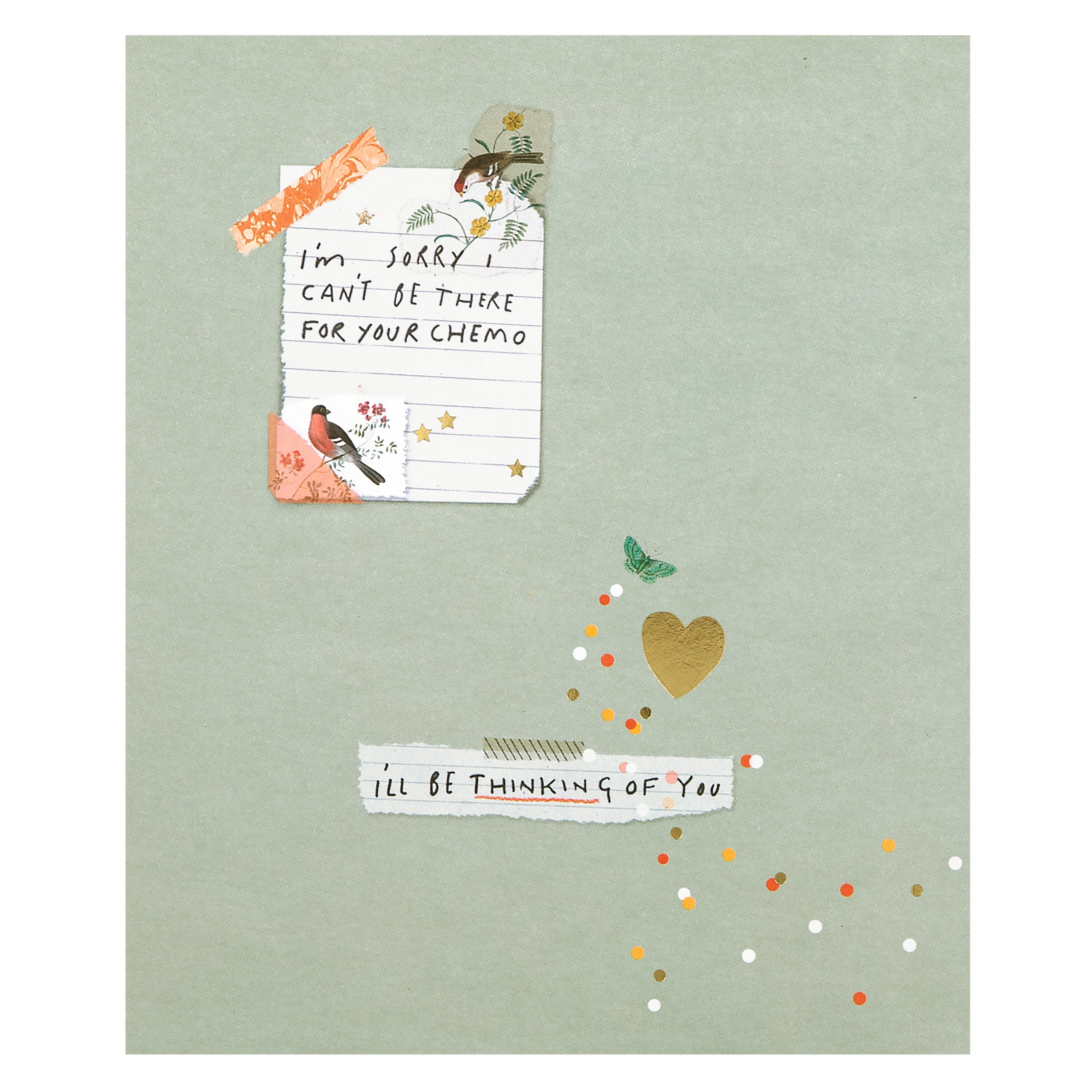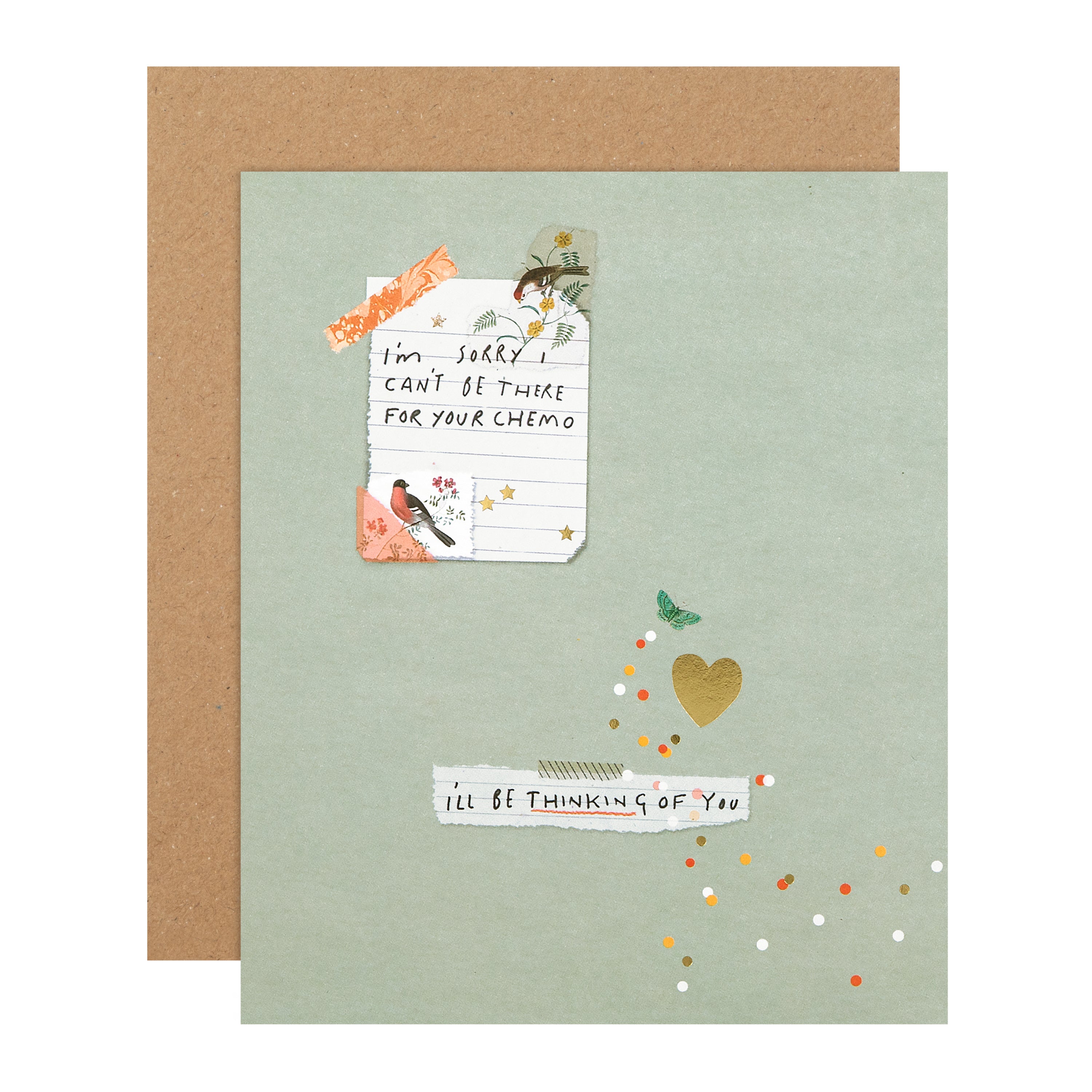 Printed on high-quality board, this card features metallic gold foil details, with the message 'I'm sorry I can't be there for your chemo. I'll be thinking of you' on the front. This card comes complete with a co-ordinating Hallmark branded, brown Kraft envelope.