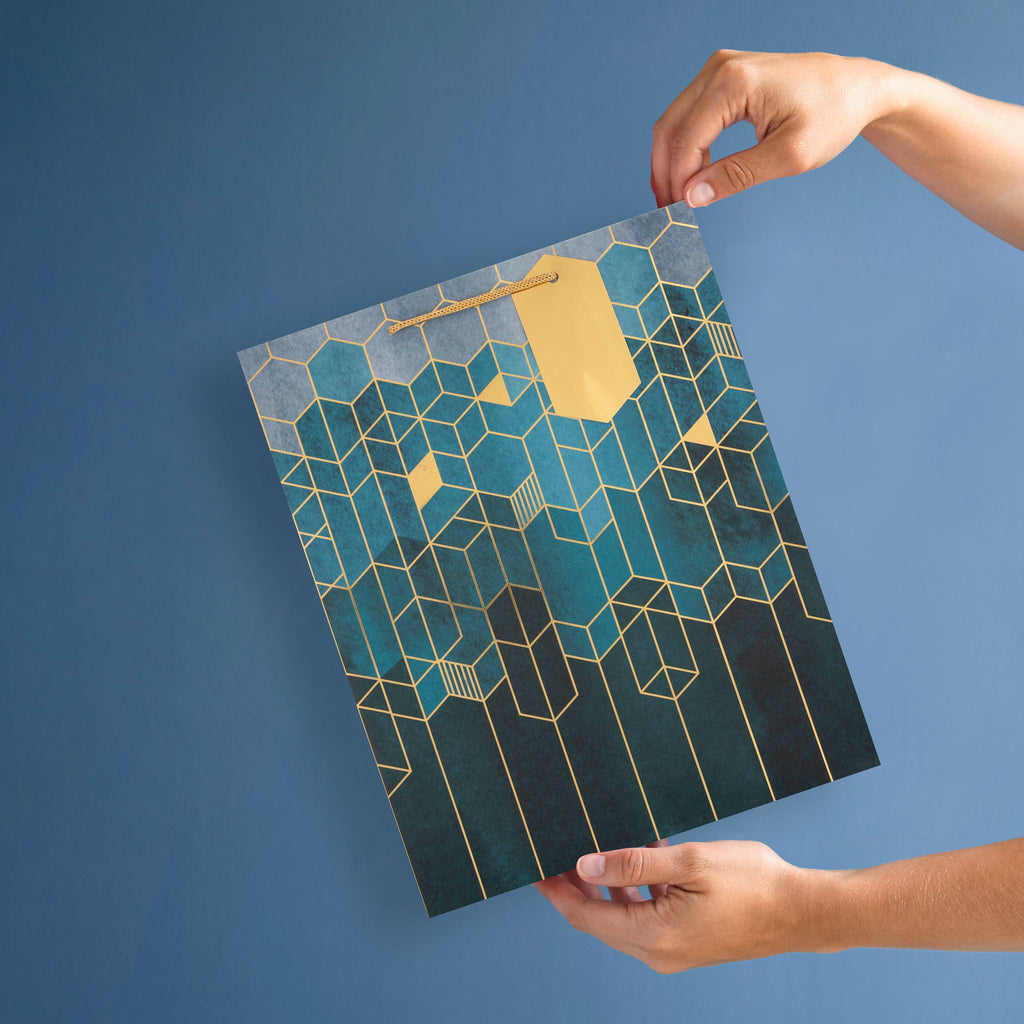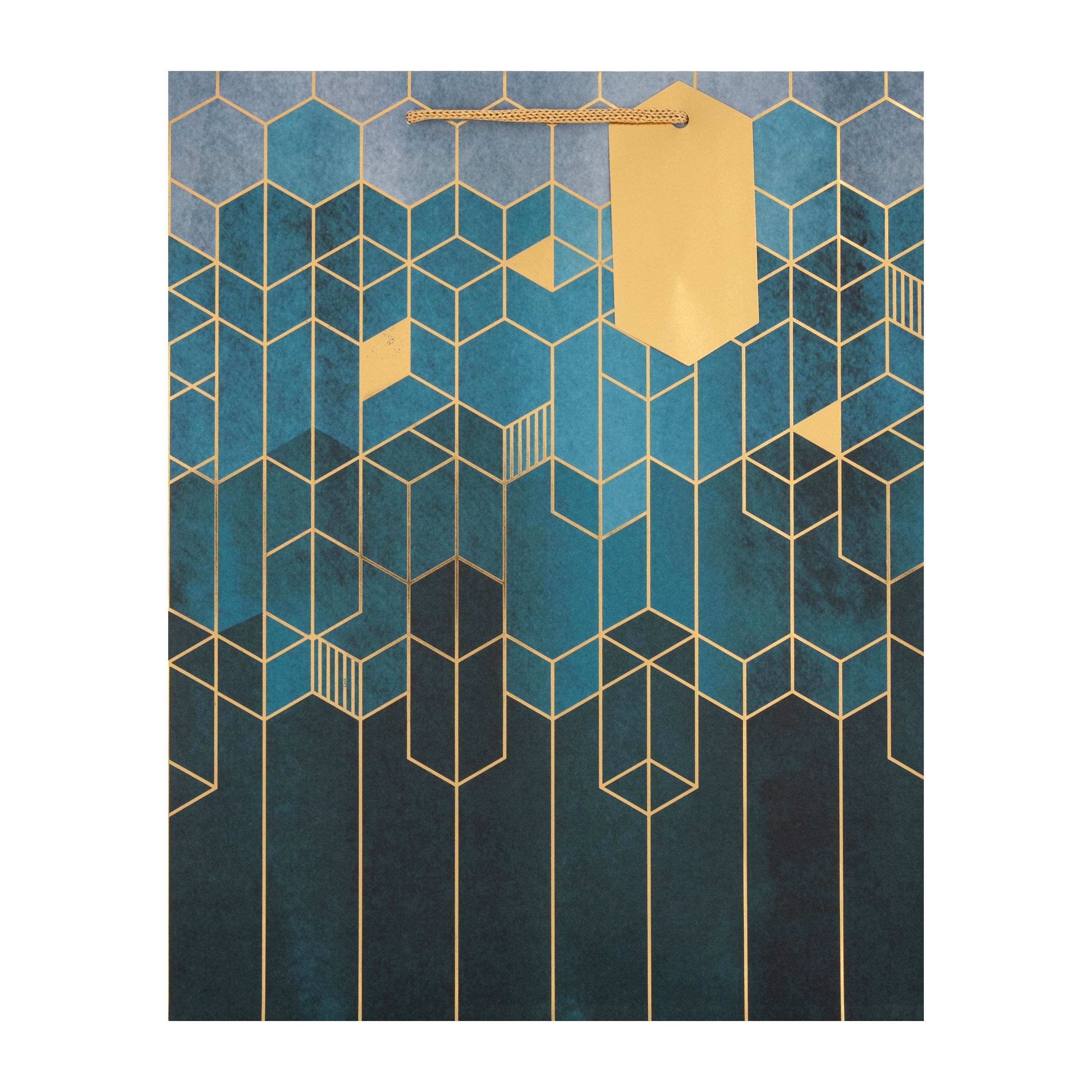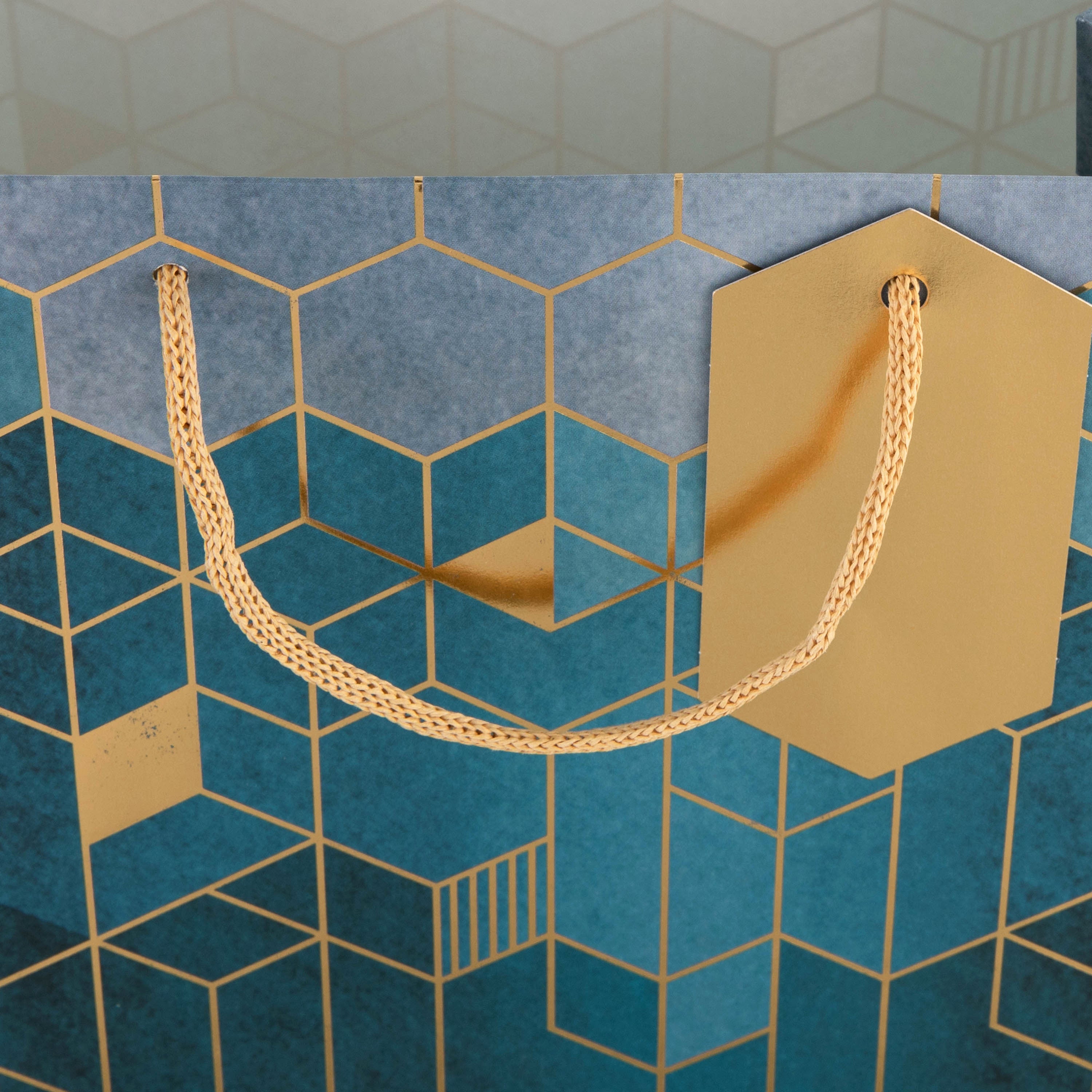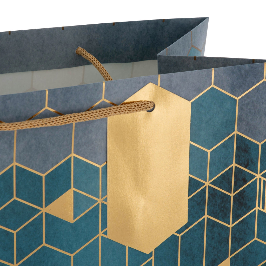 This bag features a gold foil geometric and hexagonal design on the front, a hexagon shaped gold foil tag, and fully recyclable gold knitted paper handles.