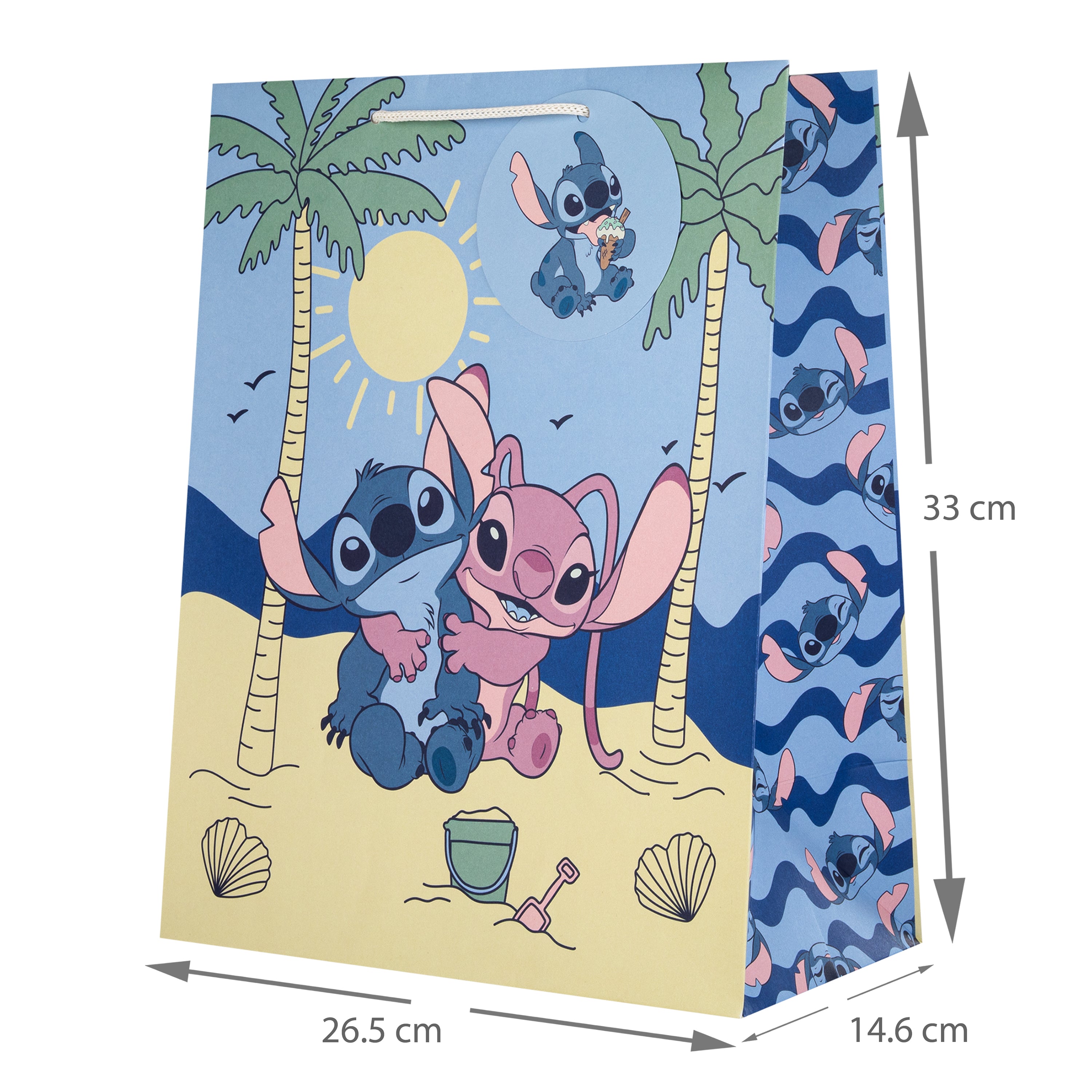 This pack contains 3 large gift bags in 3 fun Lilo & Stitch designs. One design features Stitch and Angel on the beach, one design features Stitch sunbathing with the message 'Happy Days', and one design features Stitch and Angel with the message 'Hooray!'. All bags feature white paper knitted handles, and die-cut round matching gift tags with Stitch design.