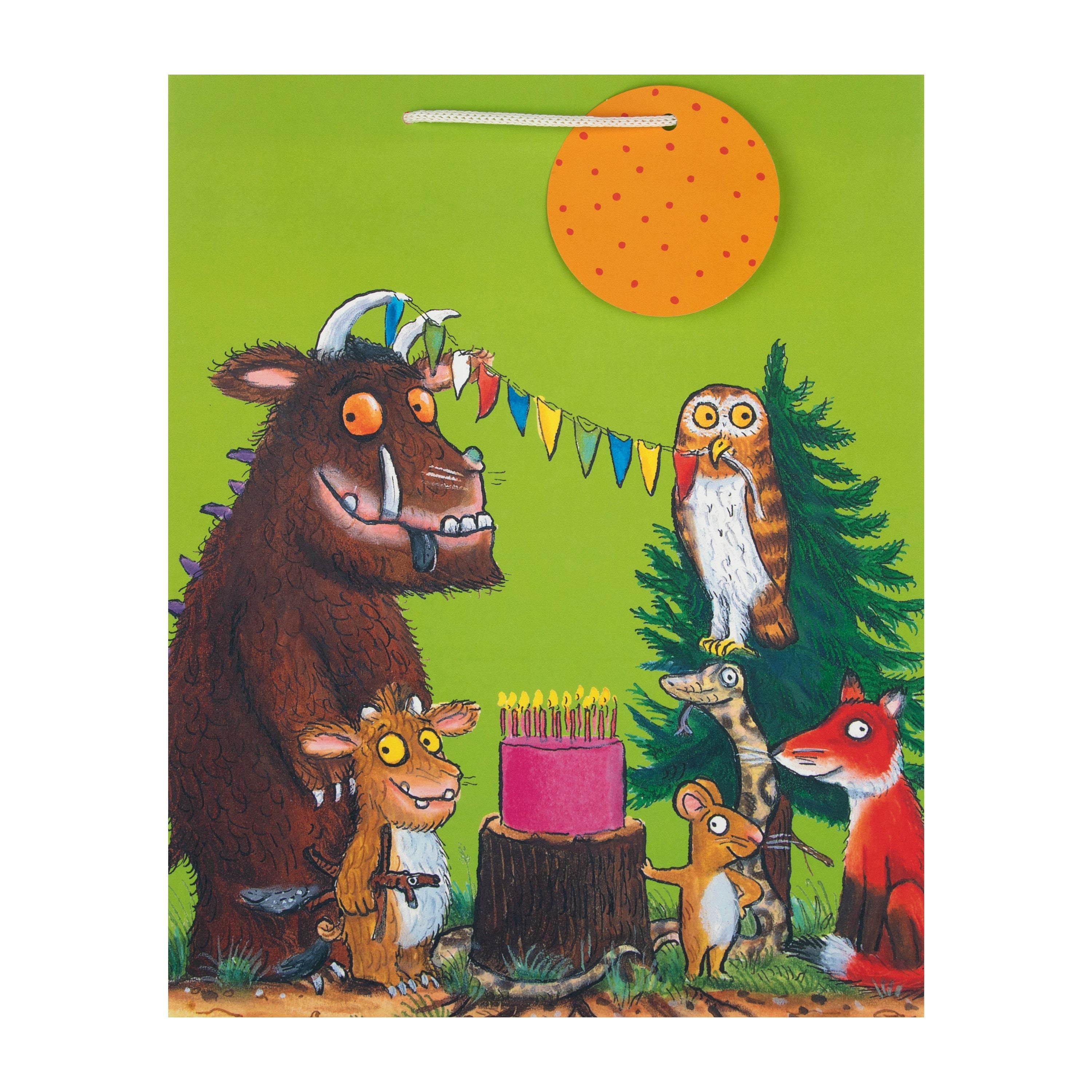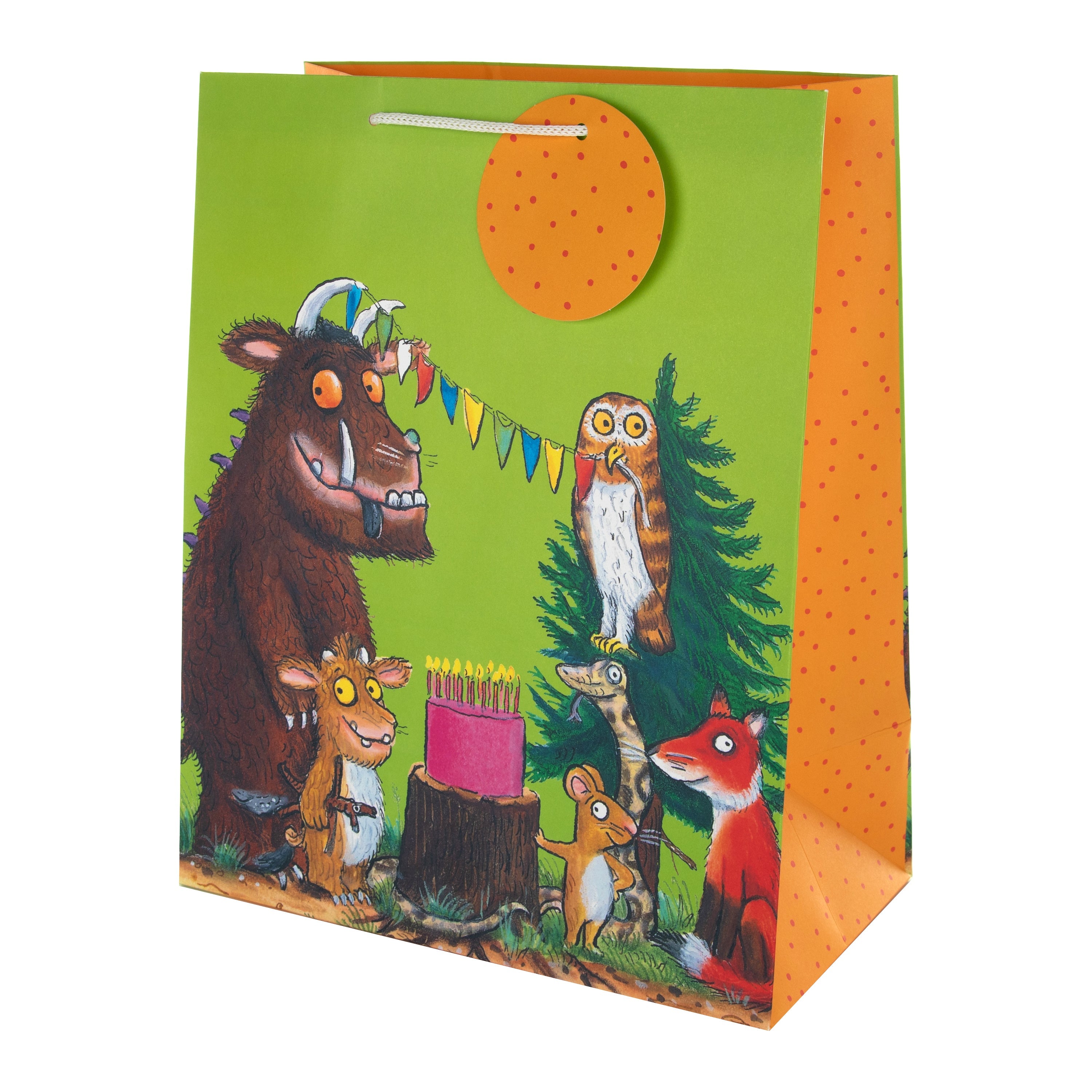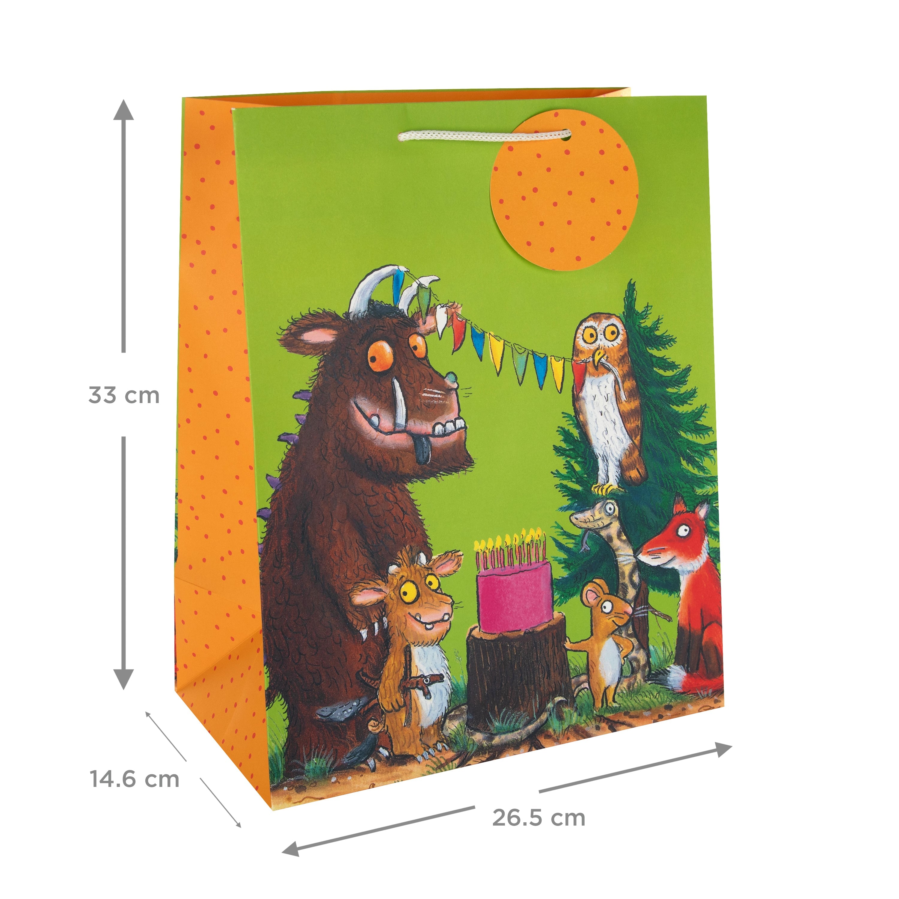 Containing 3 large bags, all with the same cute design featuring all your favourite characters, including The Gruffalo, The Gruffalo's Child and The Big Bad Mouse, as well as the Owl, the Fox and the Snake, all gathered together around a candle covered cake, set against a bright green background, each bag also features white knitted paper handles and a co-ordinating die-cut circular, orange and red-spotted, gift tag.