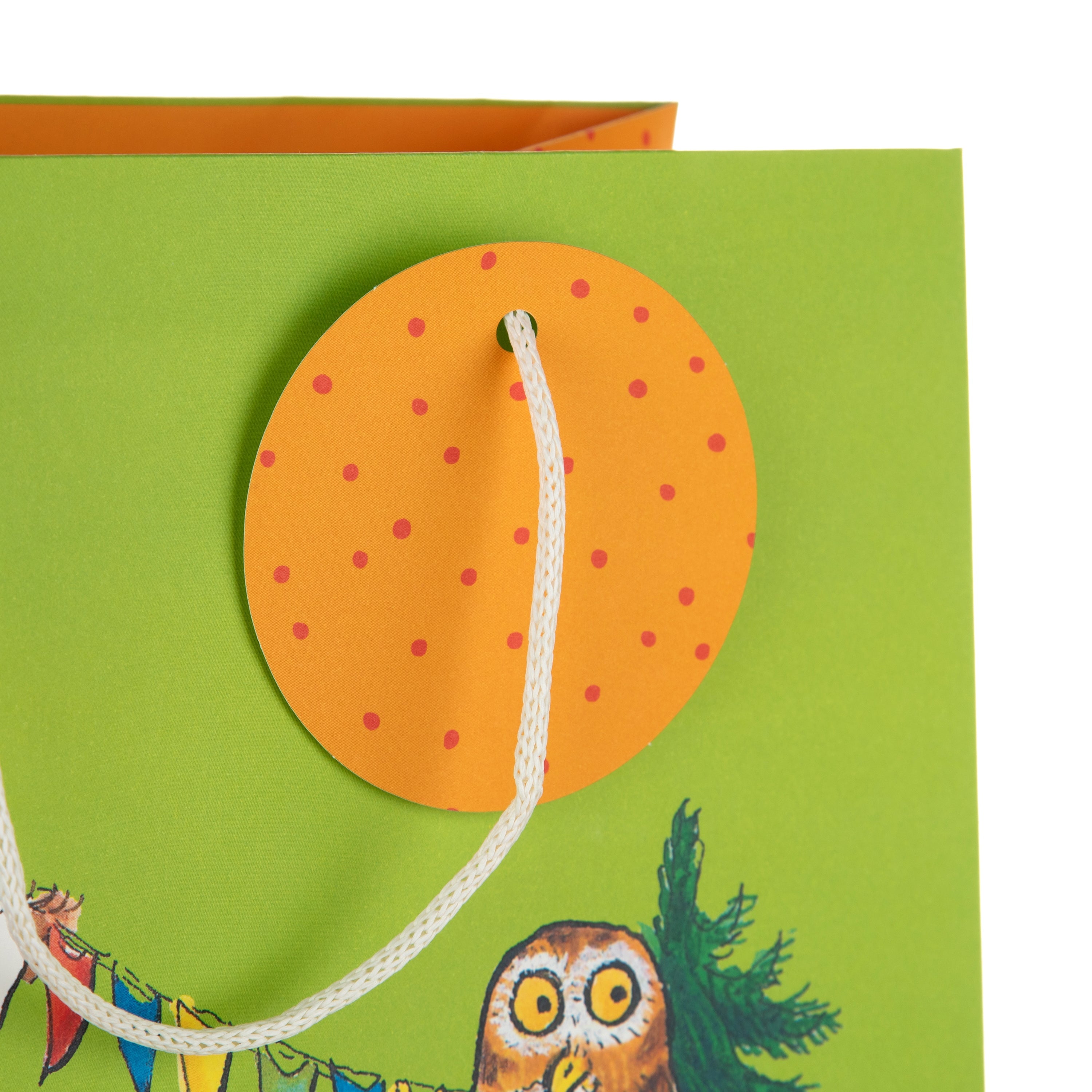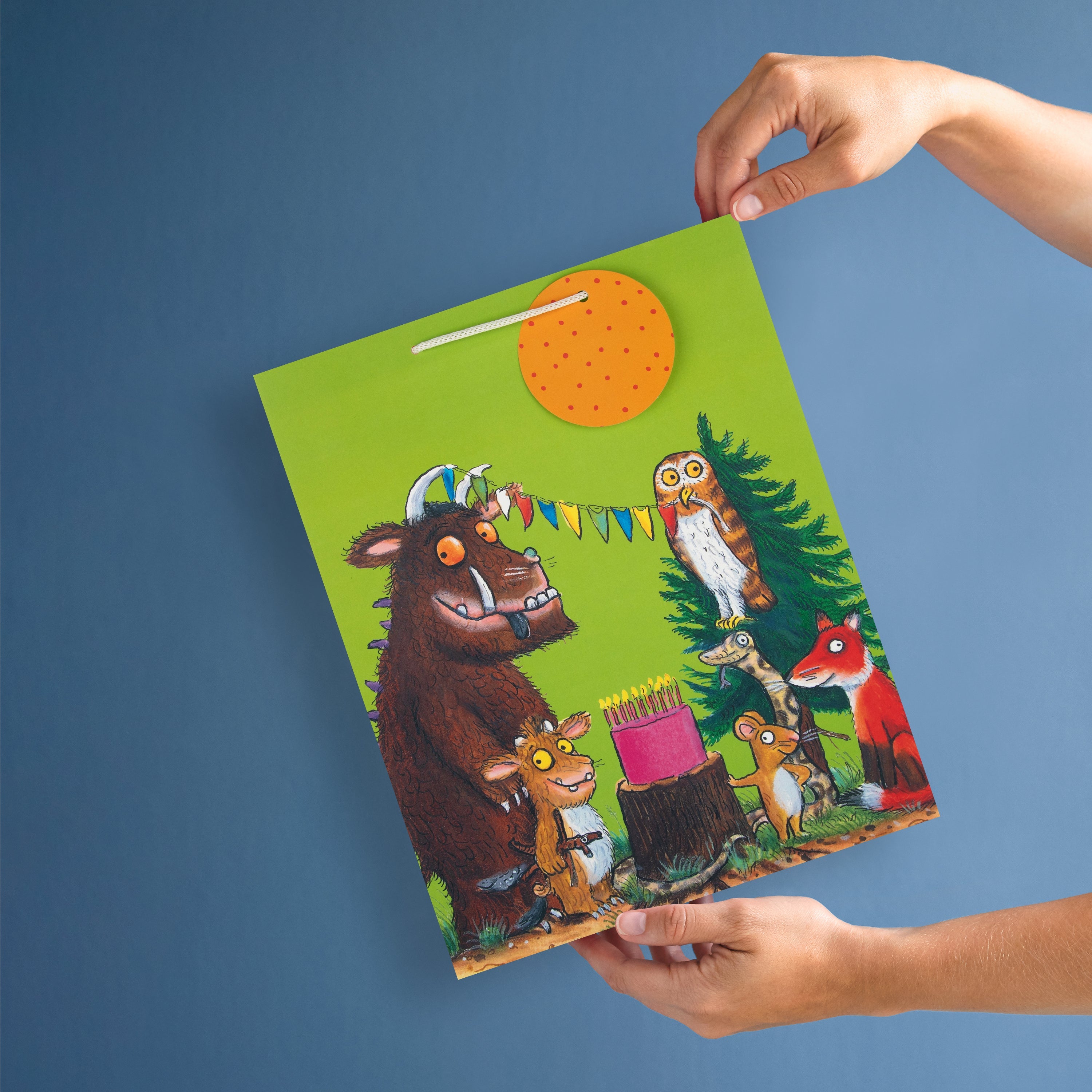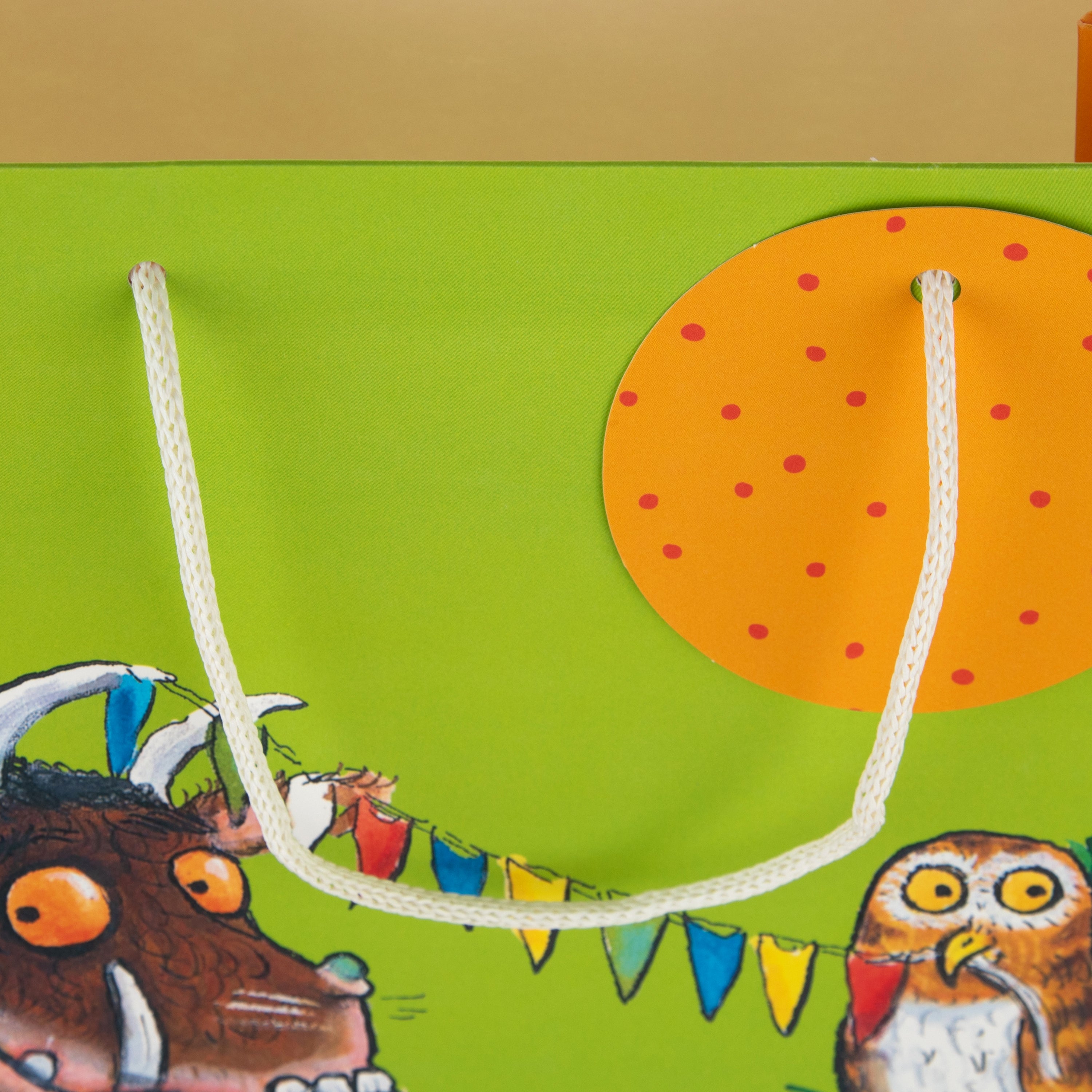 Containing 3 large bags, all with the same cute design featuring all your favourite characters, including The Gruffalo, The Gruffalo's Child and The Big Bad Mouse, as well as the Owl, the Fox and the Snake, all gathered together around a candle covered cake, set against a bright green background, each bag also features white knitted paper handles and a co-ordinating die-cut circular, orange and red-spotted, gift tag.