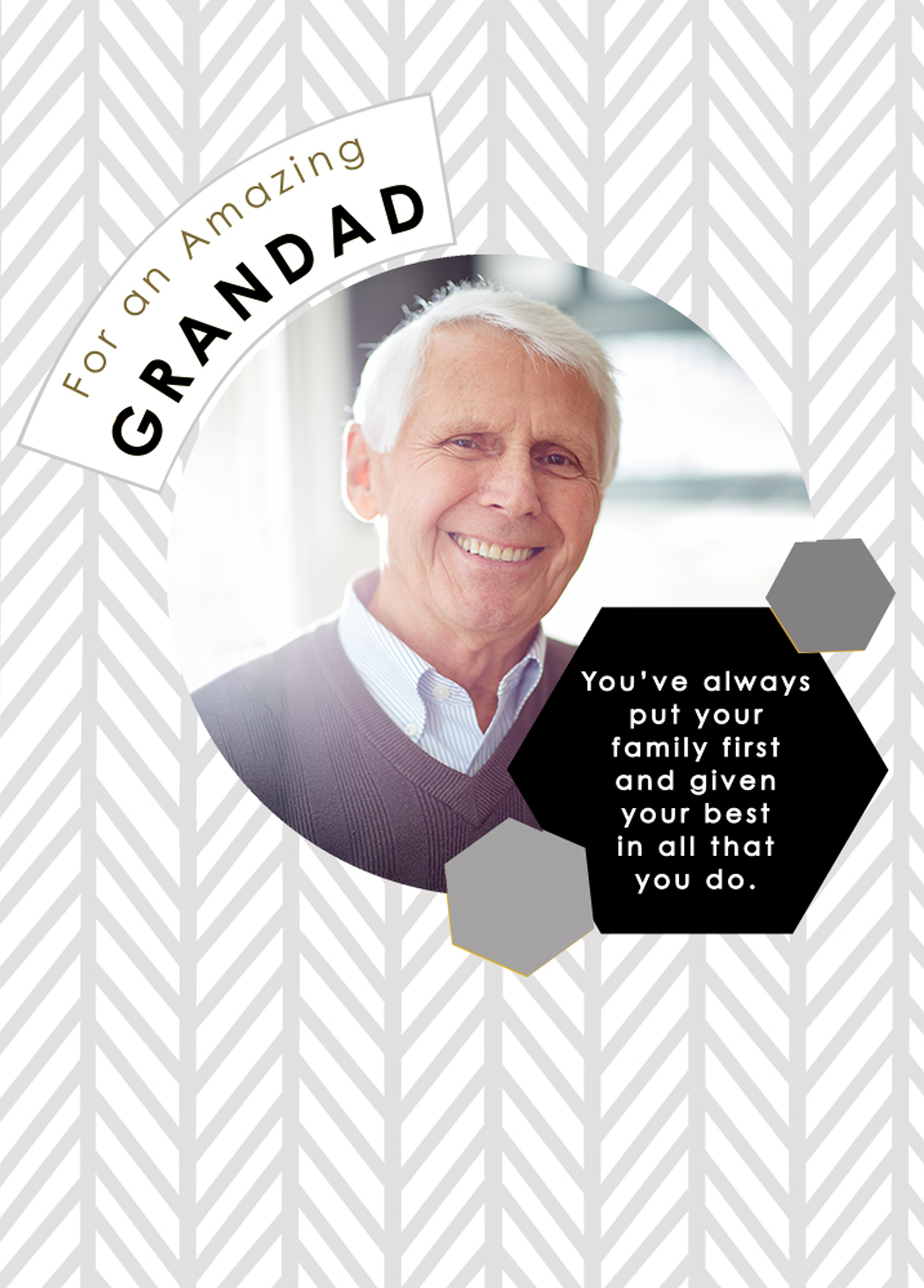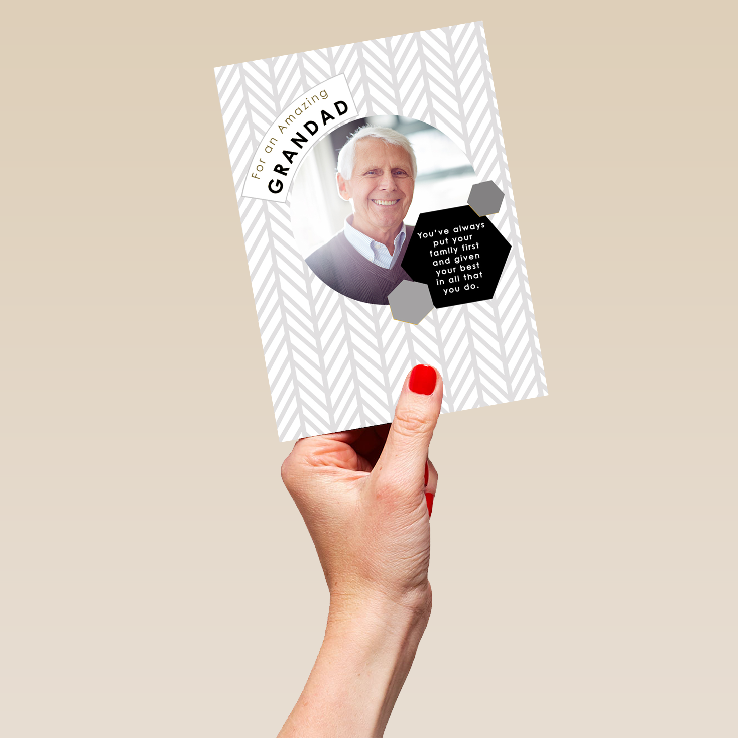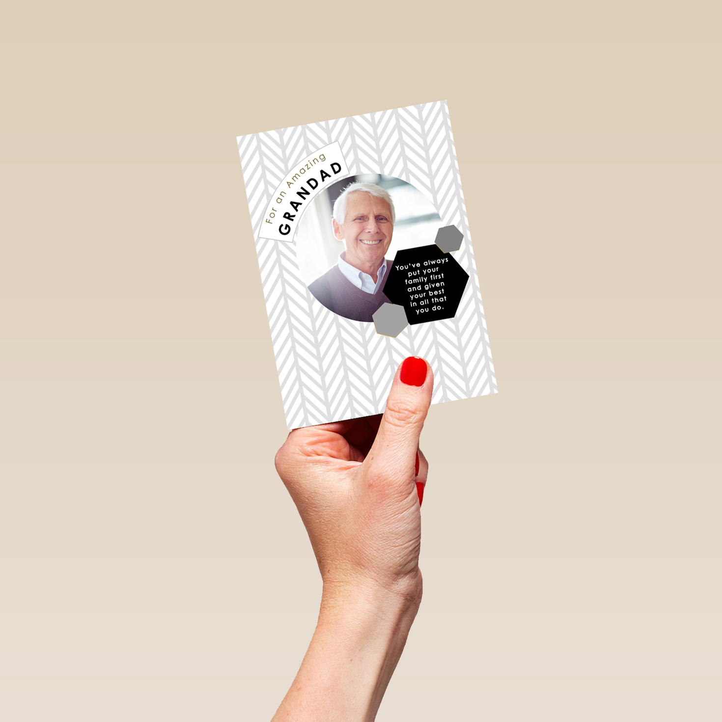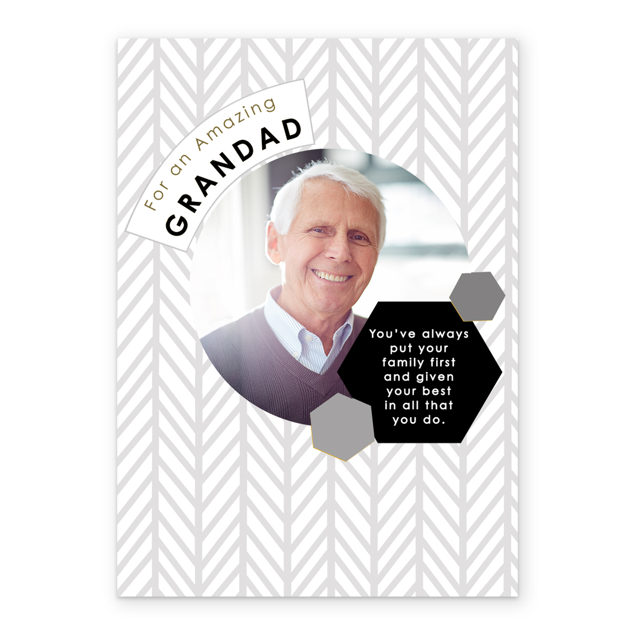 Show them you care with a personalised grandad patterned photo birthday card from Hallmark. Our greetings cards are printed on premium quality, FSC®-certified card & delivered nationwide. This card is available as standard 12cm by 16.7cm and large 15.5cm by 21.6cm.