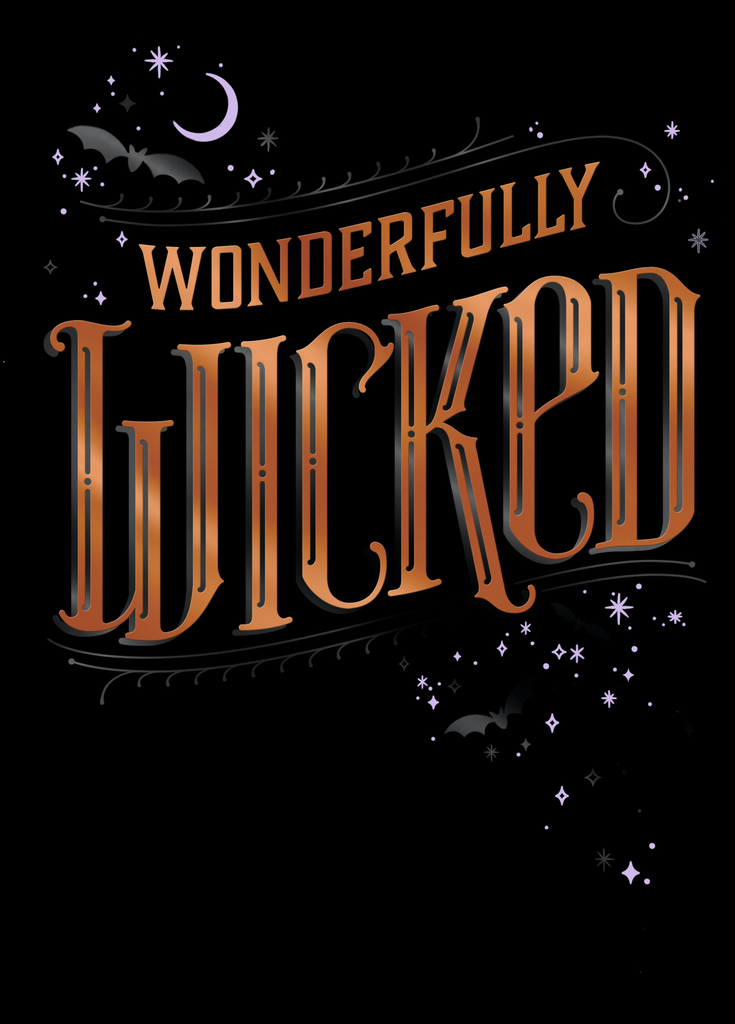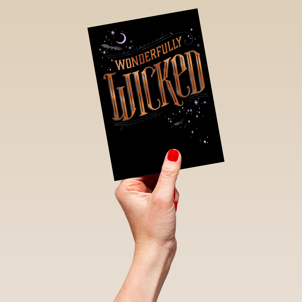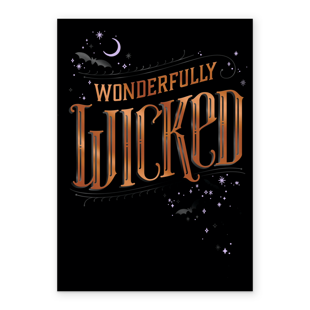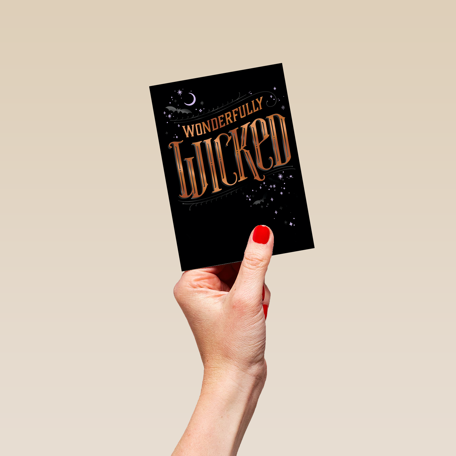 Printed on high-quality board, this card features a spooky design with bats and stars, and text on the front which reads 'wonderfully wicked', you can customise the text inside, and comes complete with a co-ordinating white envelope.