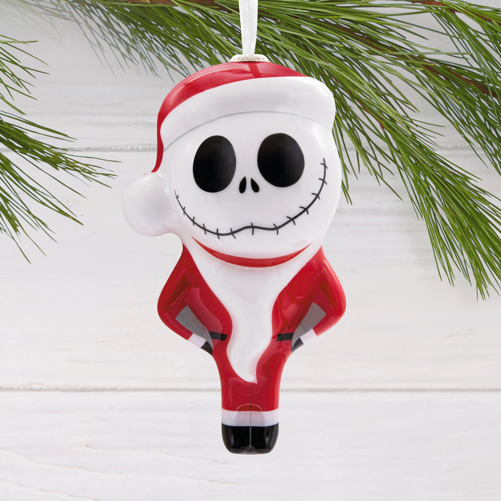 This Keepsake Hanging Ornament features a decoupage Jack Skellington wearing a Santa costume from Disney's The Nightmare Before Christmas and includes white ribbon for easy hanging around the house.