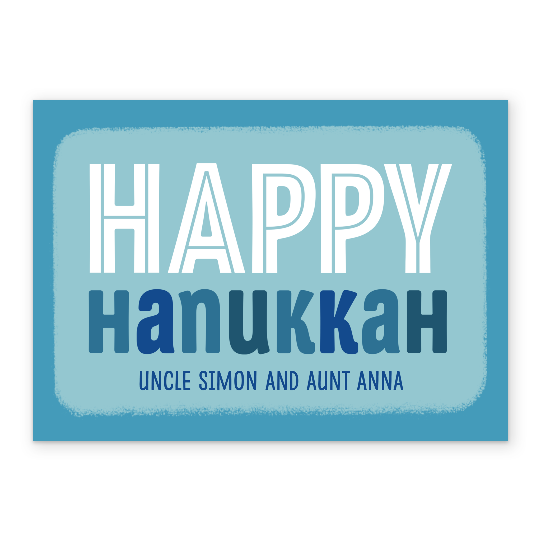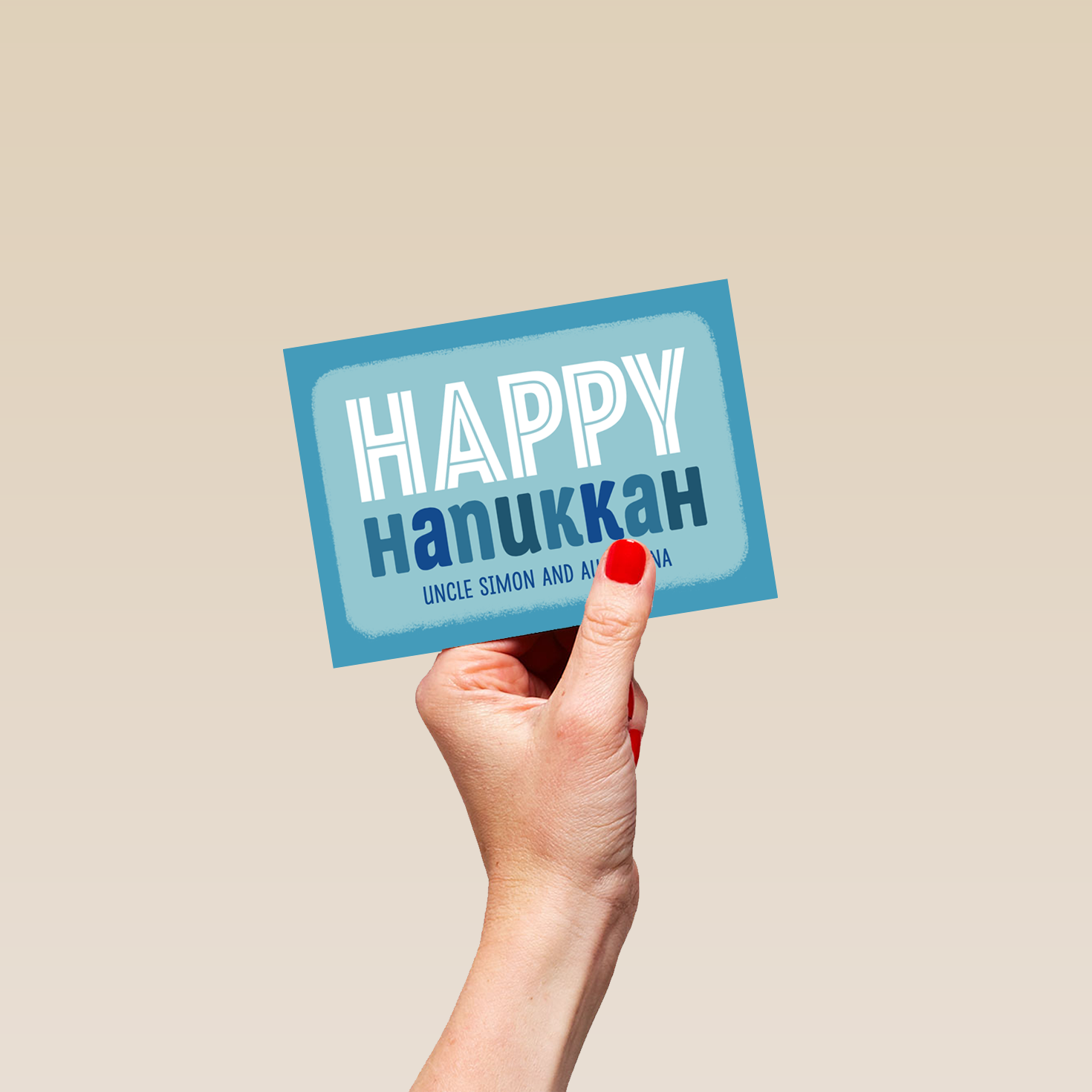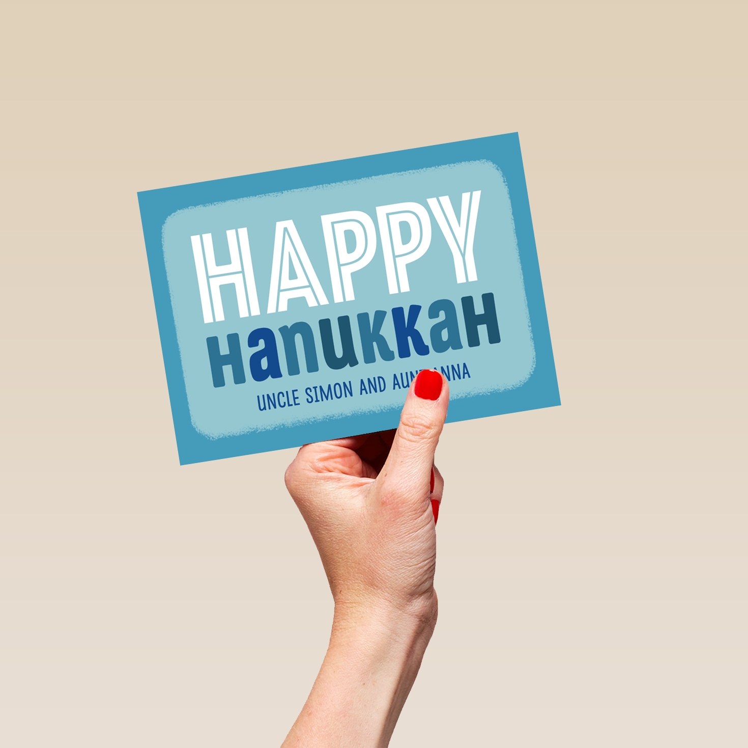 Printed on premium-quality board, this card features vibrant and fun lettering, with the message 'Happy Hanukkah [Name]', space to personalise a name, and comes complete with a co-ordinating white envelope.