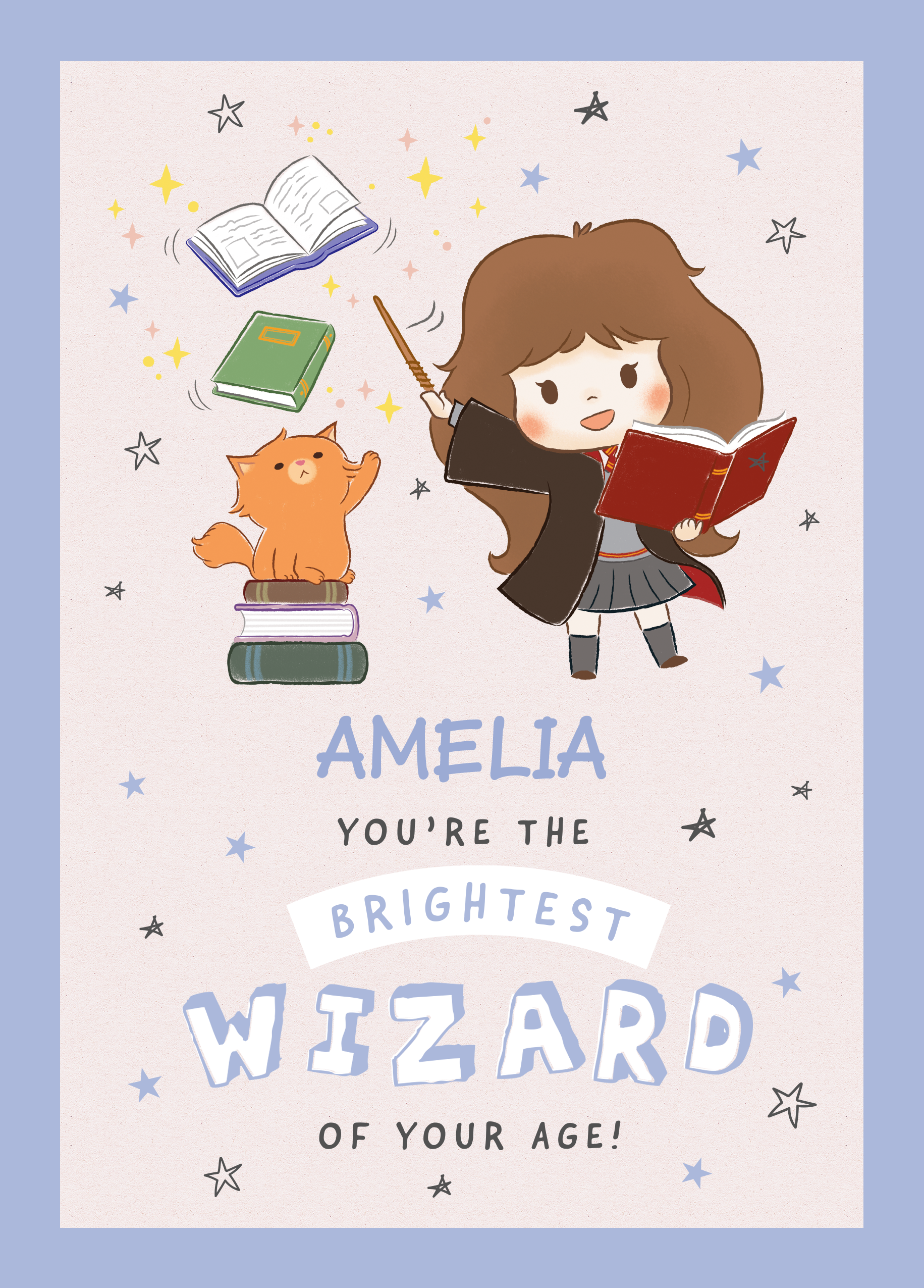 Printed on premium-quality board, this card features Hermione Granger, from Harry Potter, casting some special birthday magic spells with Crookshanks the cat, on a white background adorned with stars and a light blue border, with the message 'You're the brightest wizard of your age!', space to personalise a name, and comes complete with a co-ordinating white envelope.