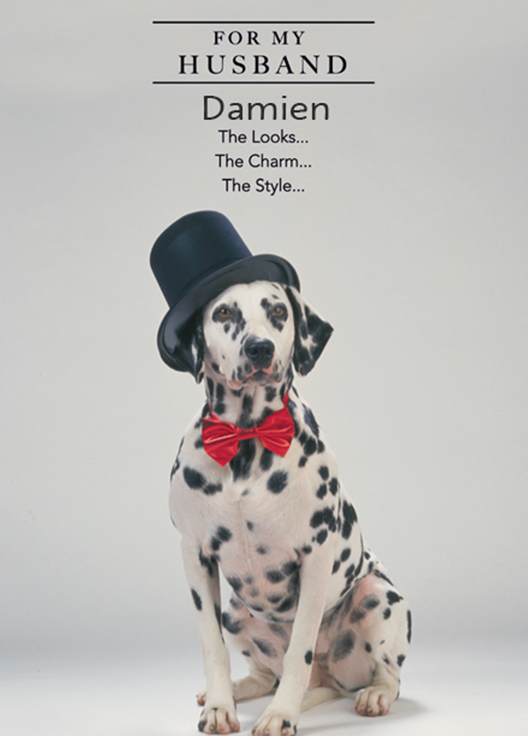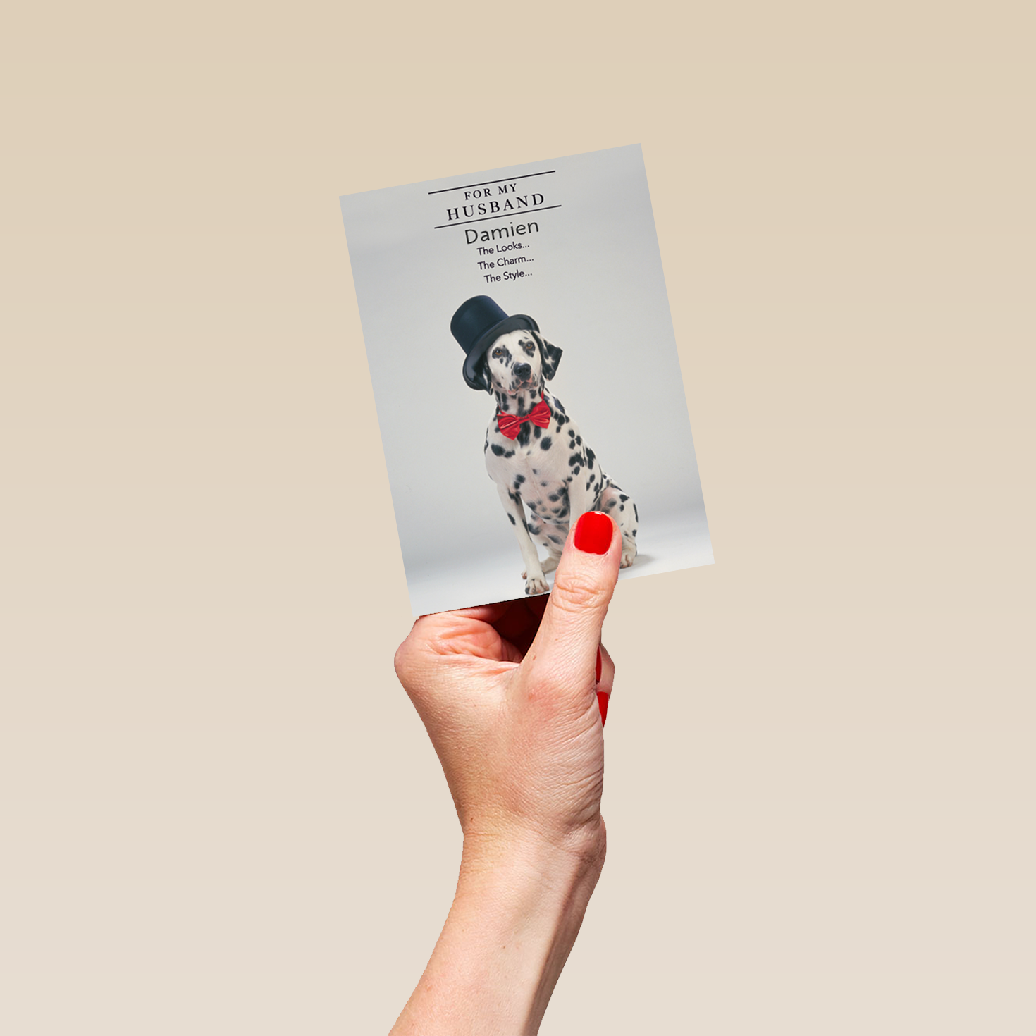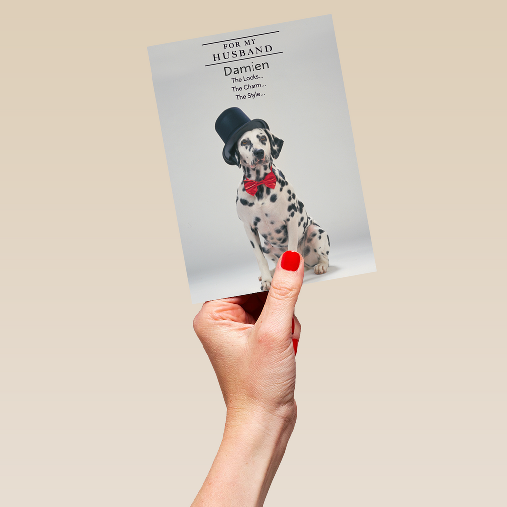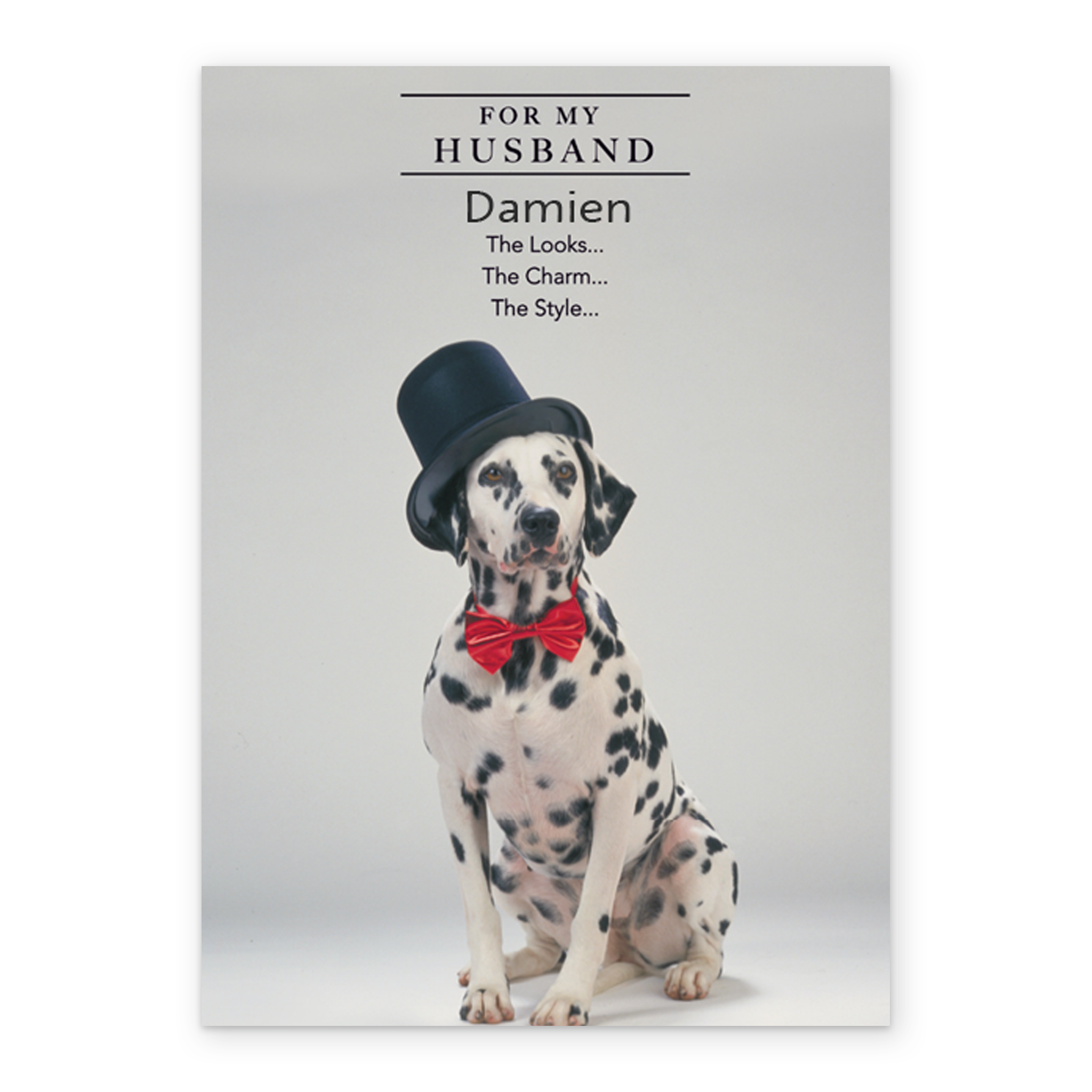 Show them you care with a personalised husband cute dog card from Hallmark. Our birthday cards are printed on premium quality, FSC®-certified card & delivered nationwide. This card is available as standard 12cm by 16.7cm and large 15.5cm by 21.6cm.