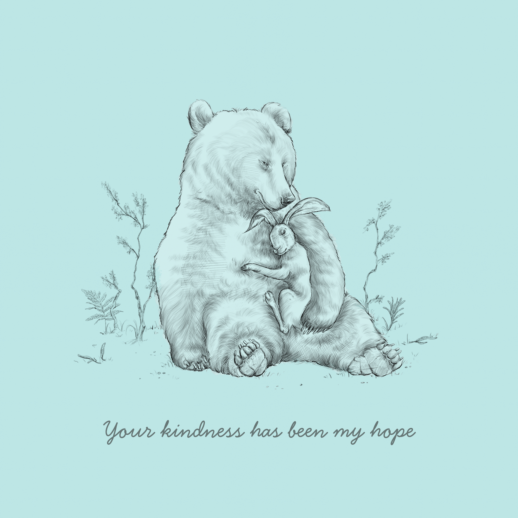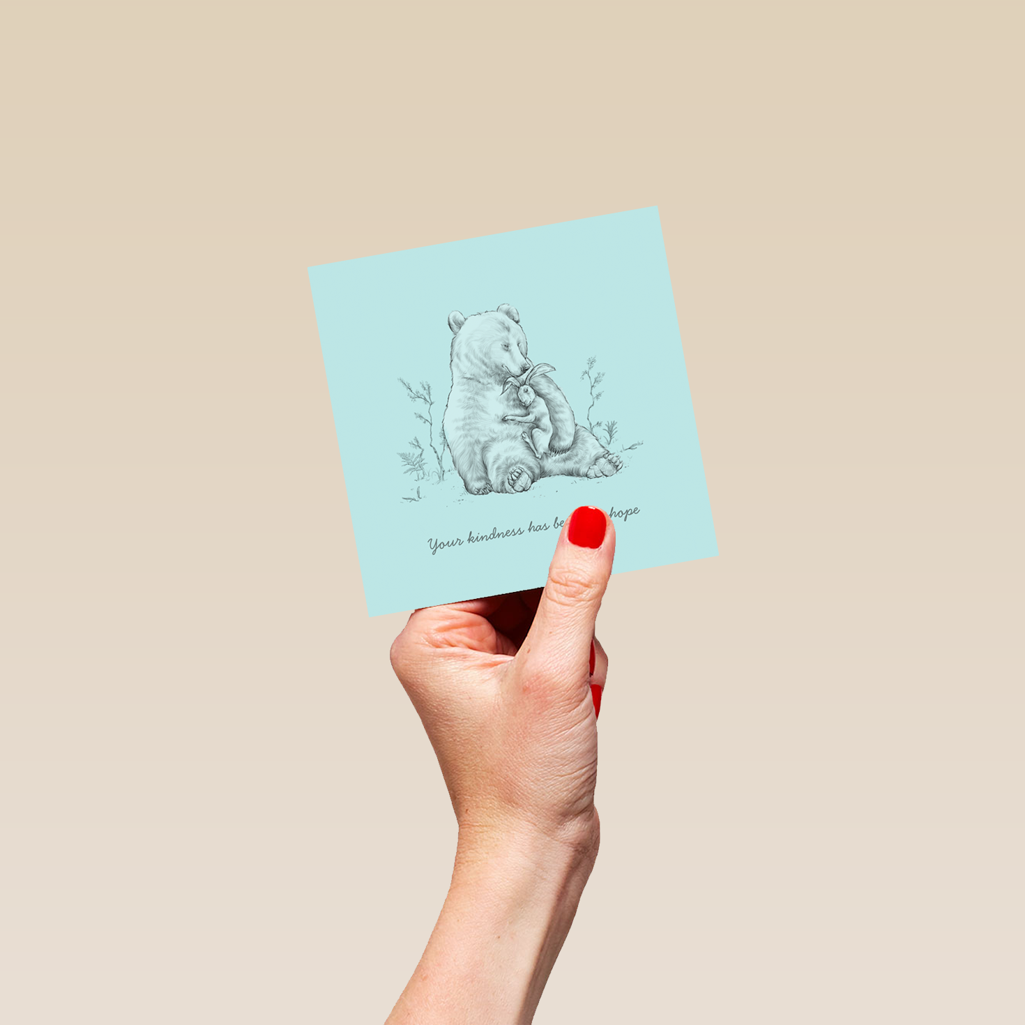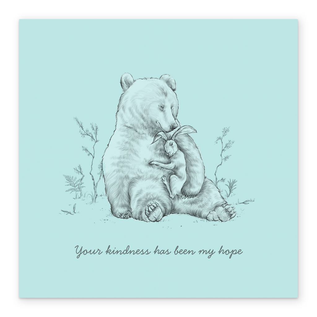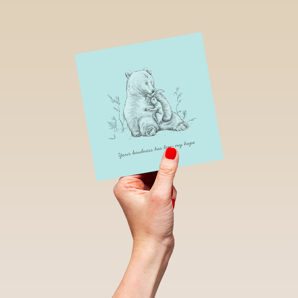 Printed on premium-quality board, this card features a beautiful illustration of a bear and rabbit, with the message 'Your kindness has been my hope' on the front, and comes complete with a co-ordinating white envelope.