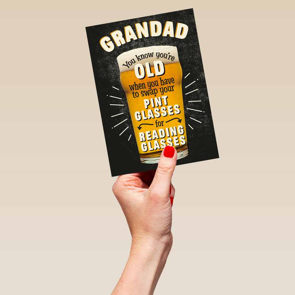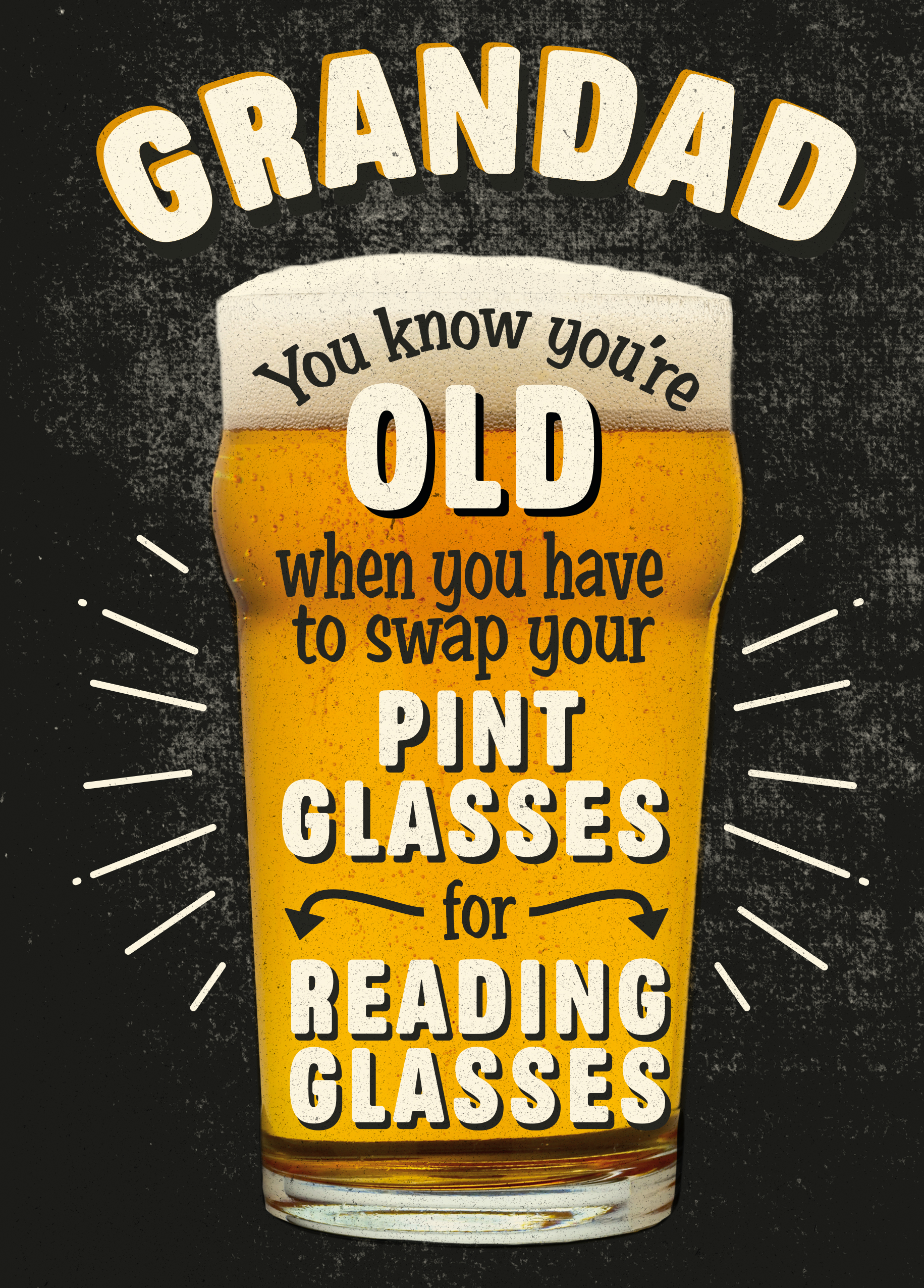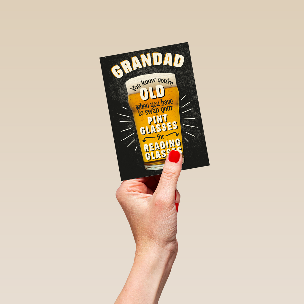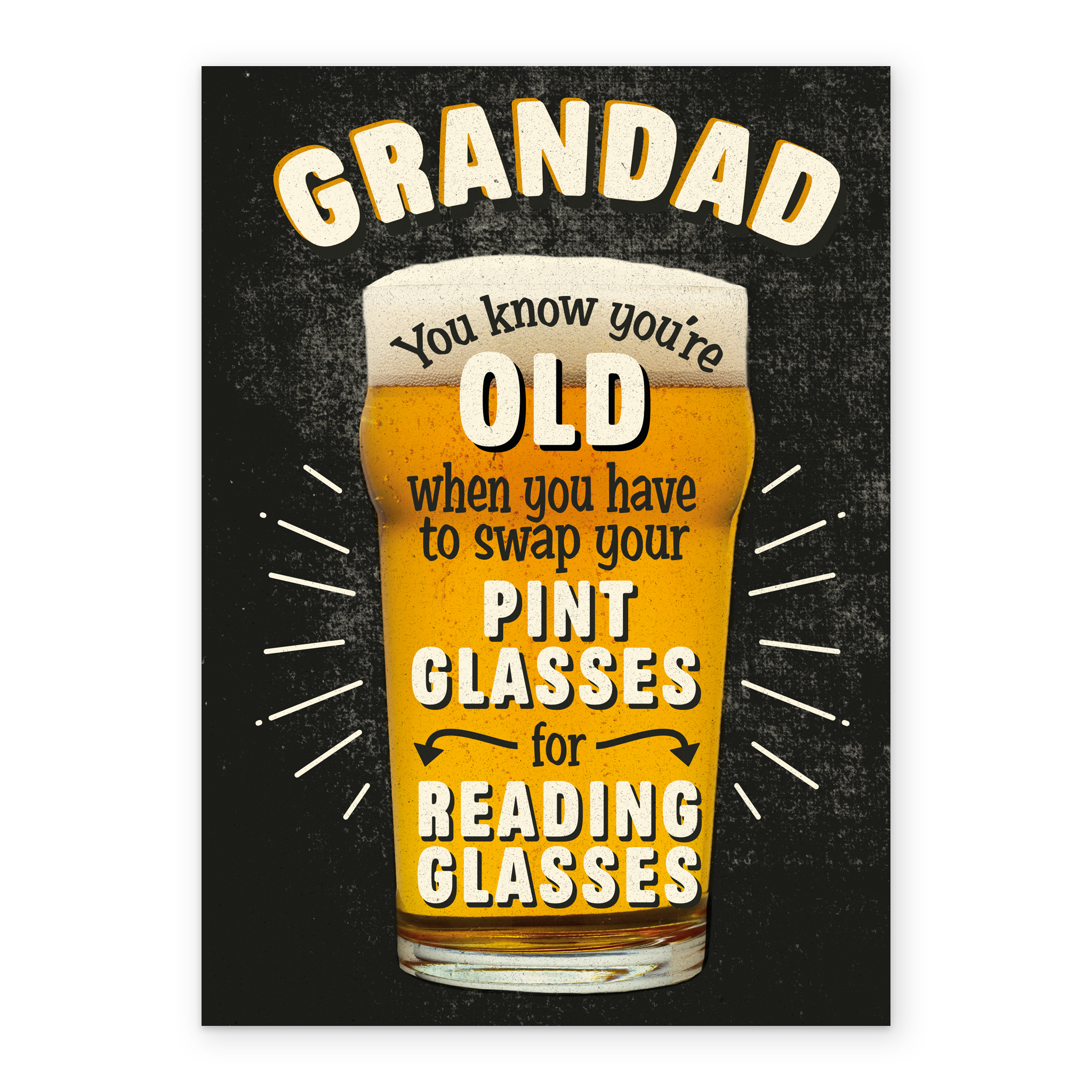 Show them you care with a personalised funny grandad beer glass birthday card from Hallmark. Our greetings cards are printed on premium quality, FSC®-certified card & delivered nationwide. This card is available as standard 12cm by 16.7cm and large 15.5cm by 21.6cm.