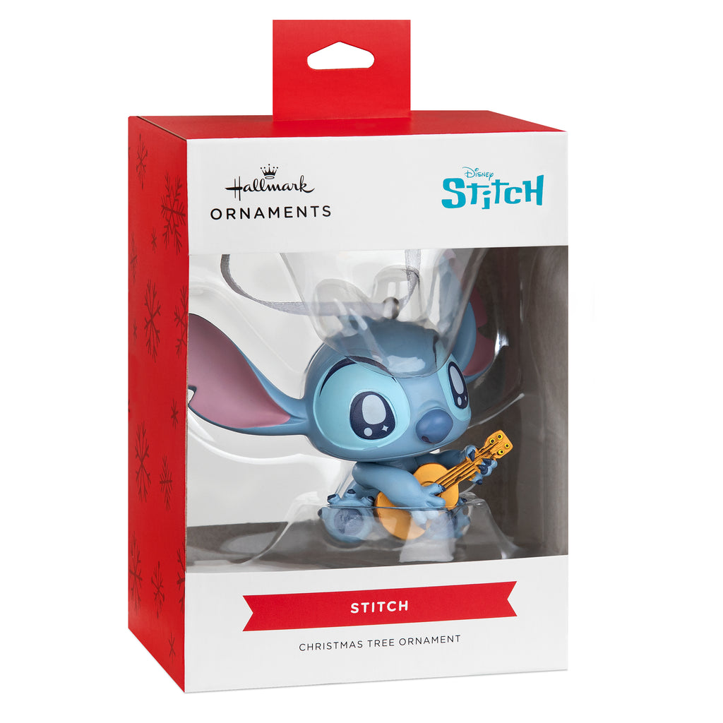 This hanging ornament is made from hard-wearing resin and features Disney's Lilo and Stitch, Experiment 626 playing the ukulele, a hanging loop and white ribbon.