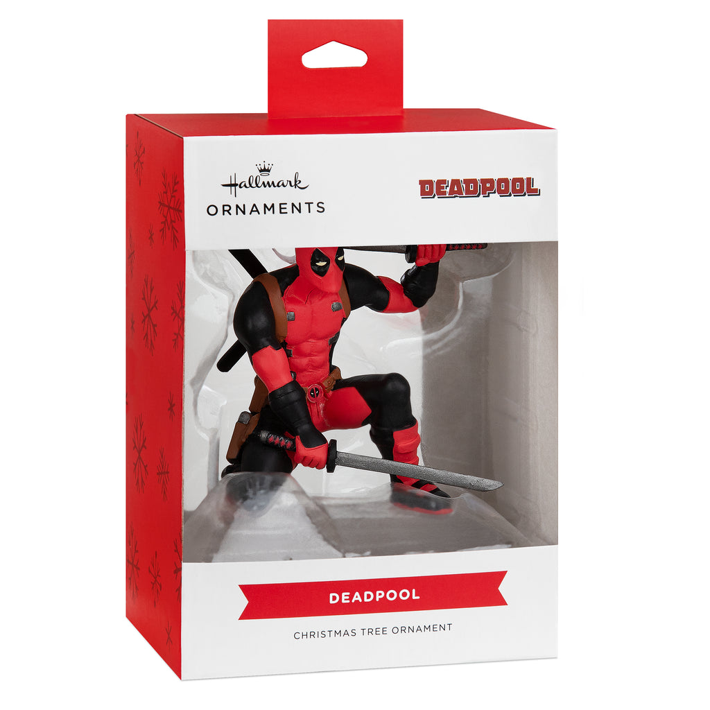 This hanging ornament is made from hardwearing resin and features MARVEL's Deadpool in a crouched pose holding his Katana swords, with a hanging loop and white ribbon for easy display.