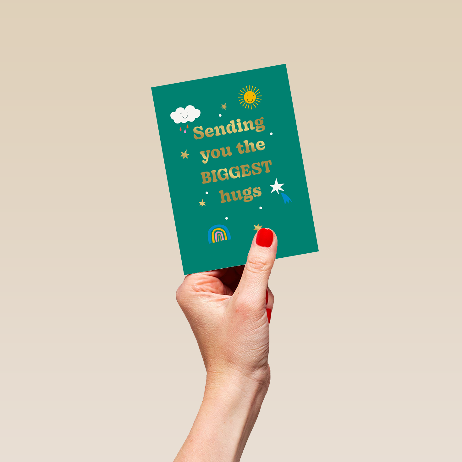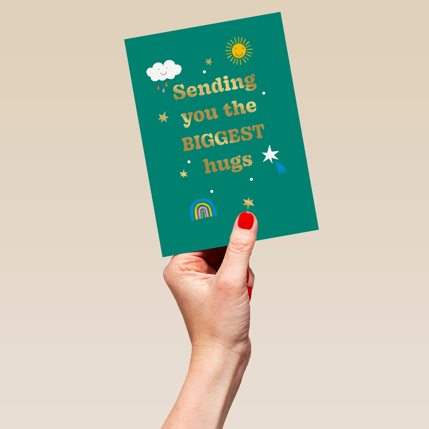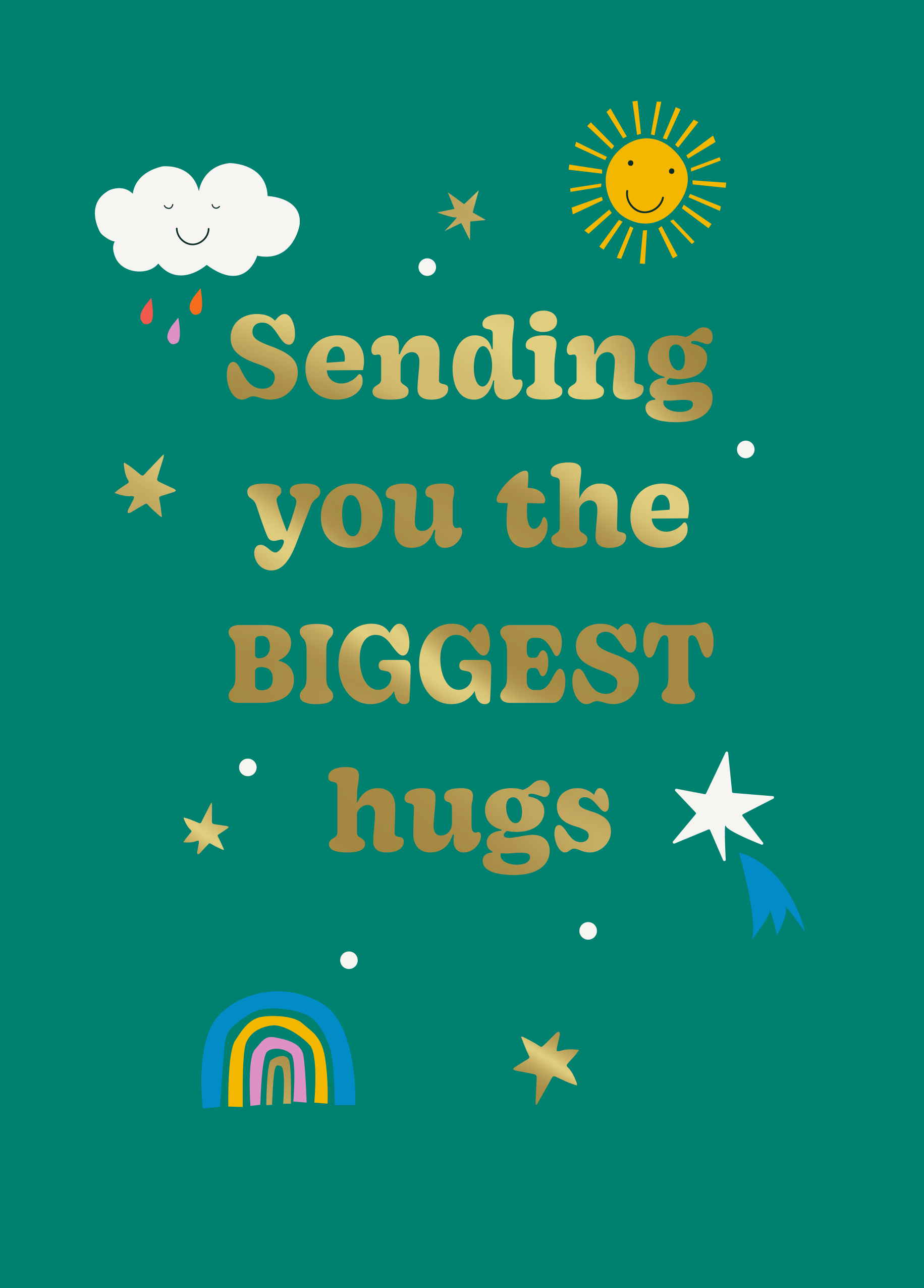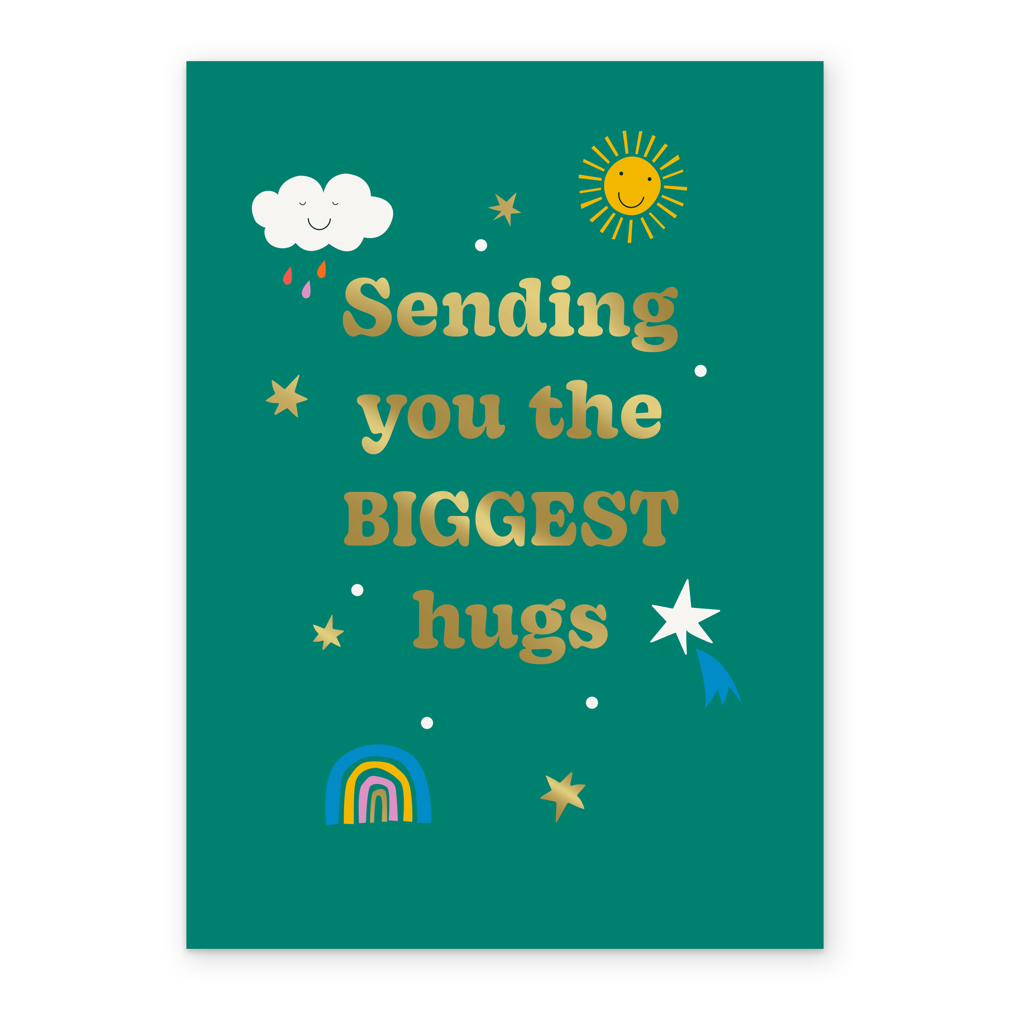 Printed on premium-quality board, this card features a green background with a sunshine, cloud, rainbow and stars, with the message 'Sending you the BIGGEST hugs', and comes complete with a co-ordinating white envelope.