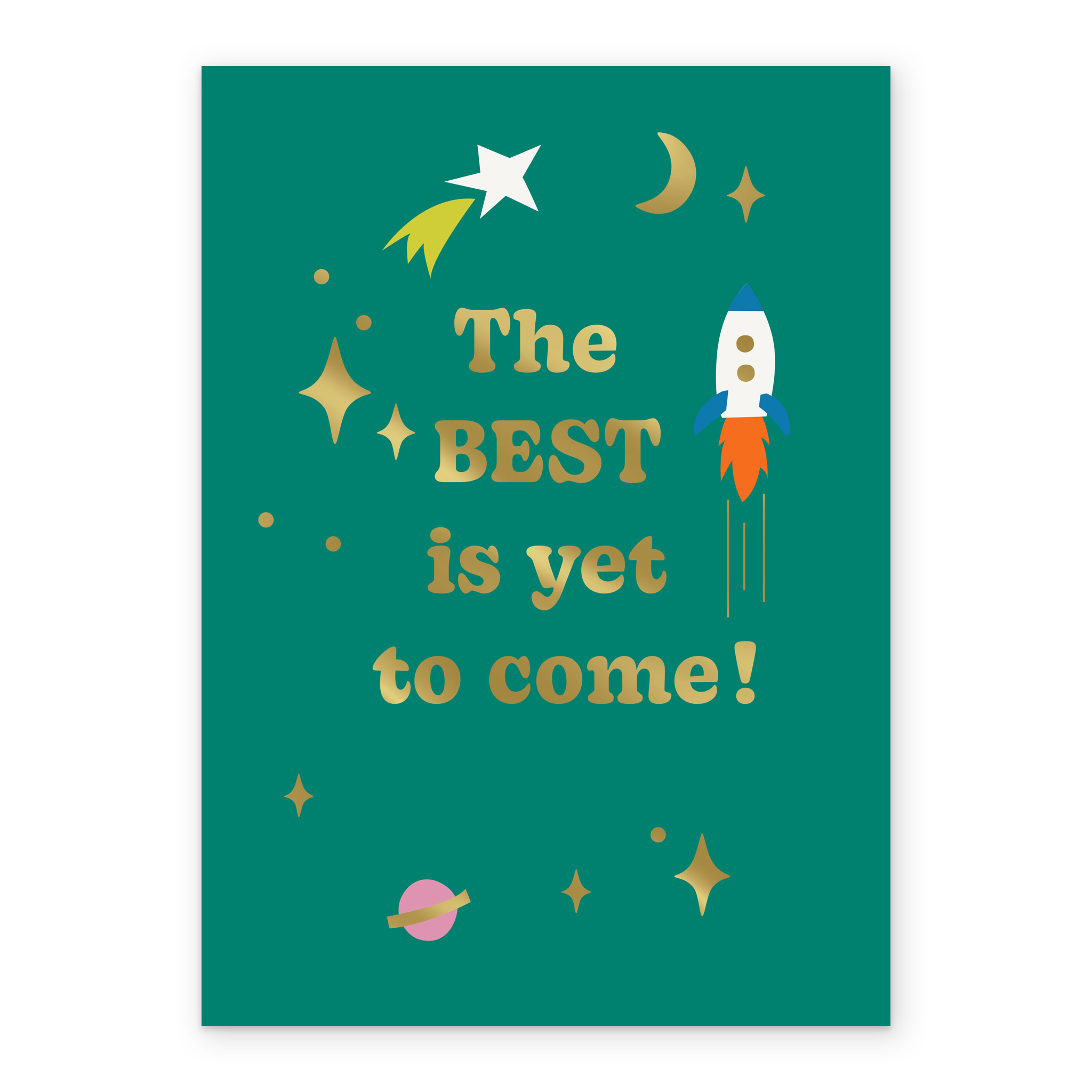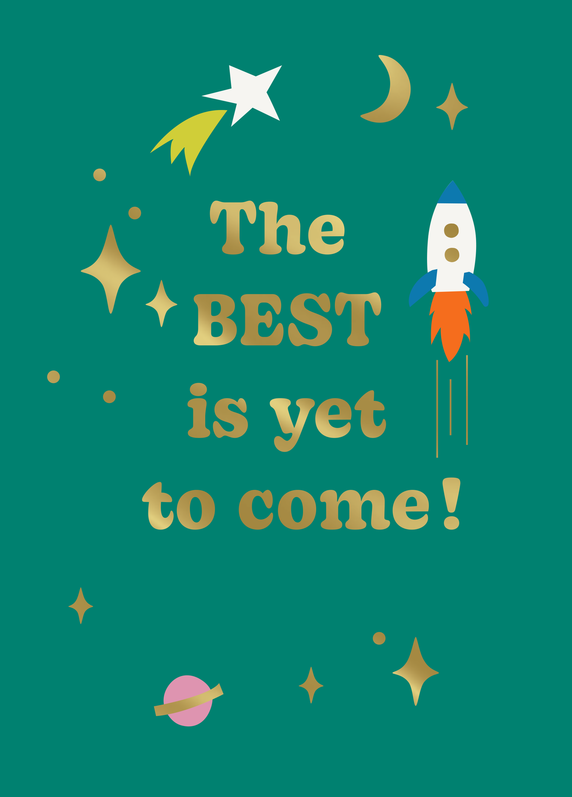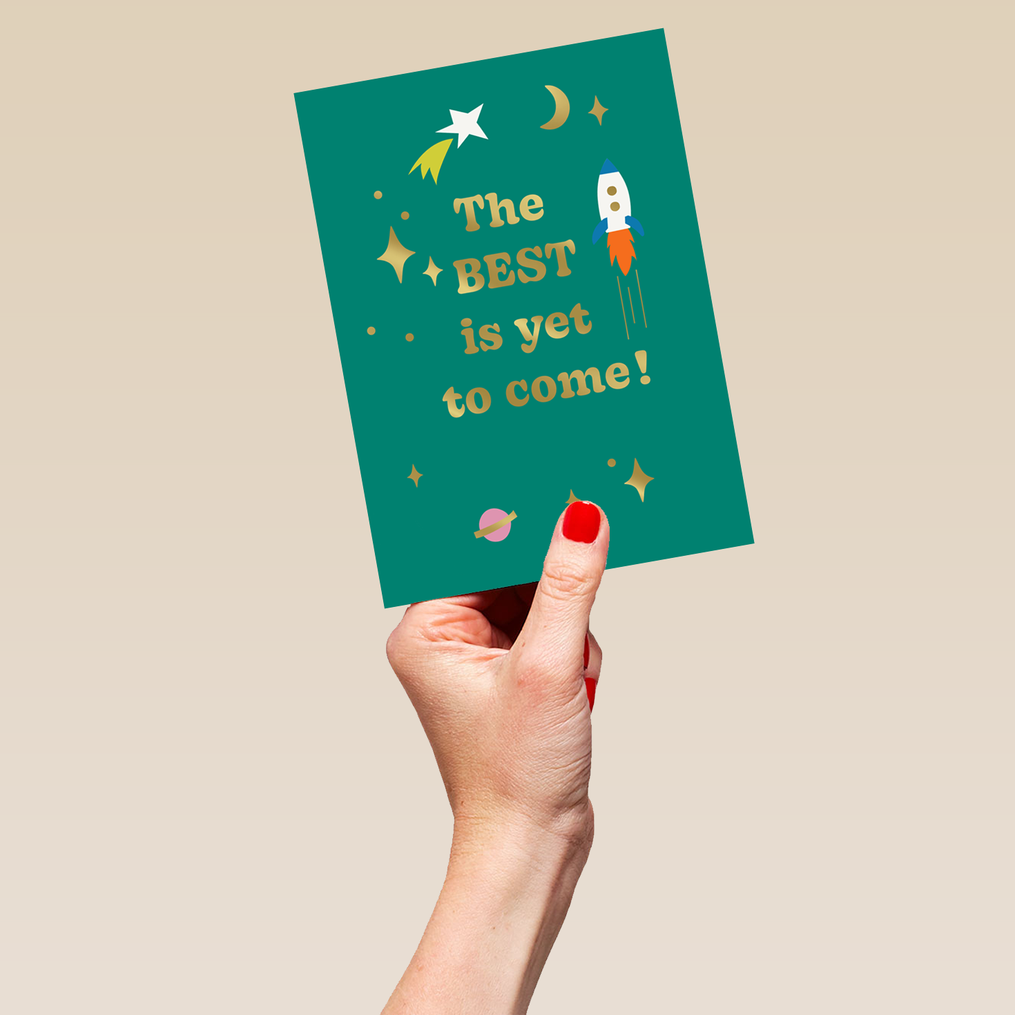 Printed on premium-quality board, this card features a green background with a rocket ship, stars and planets, with the message 'The BEST is yet to come!', and comes complete with a co-ordinating white envelope.