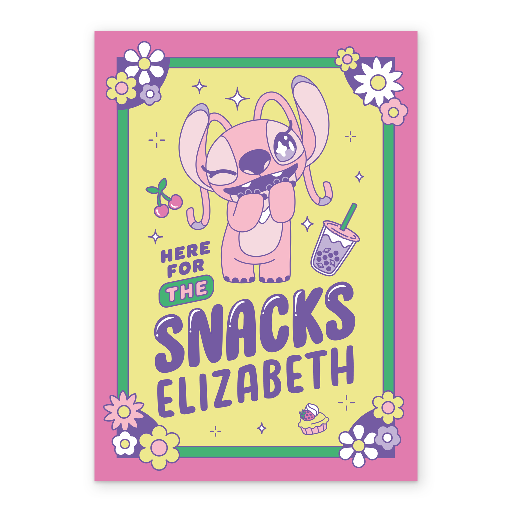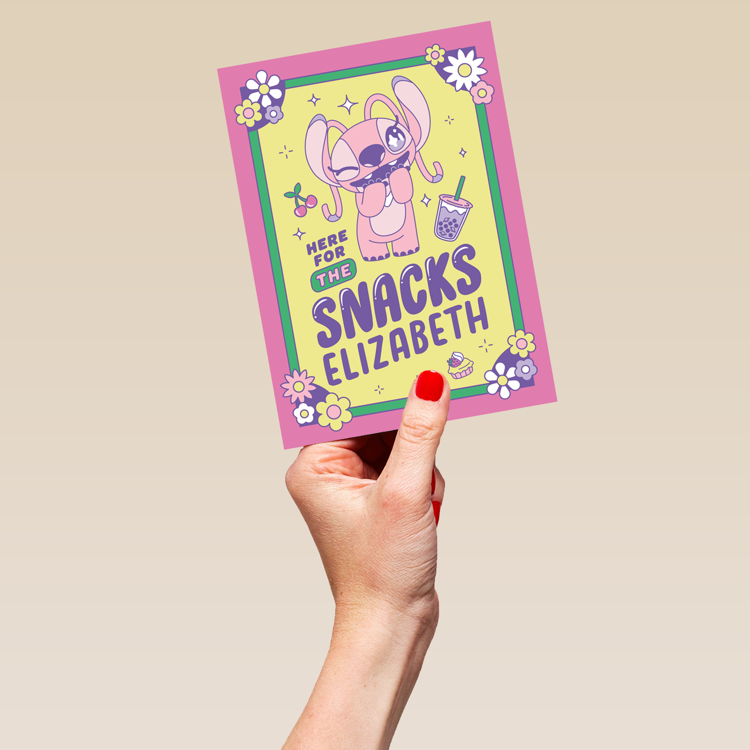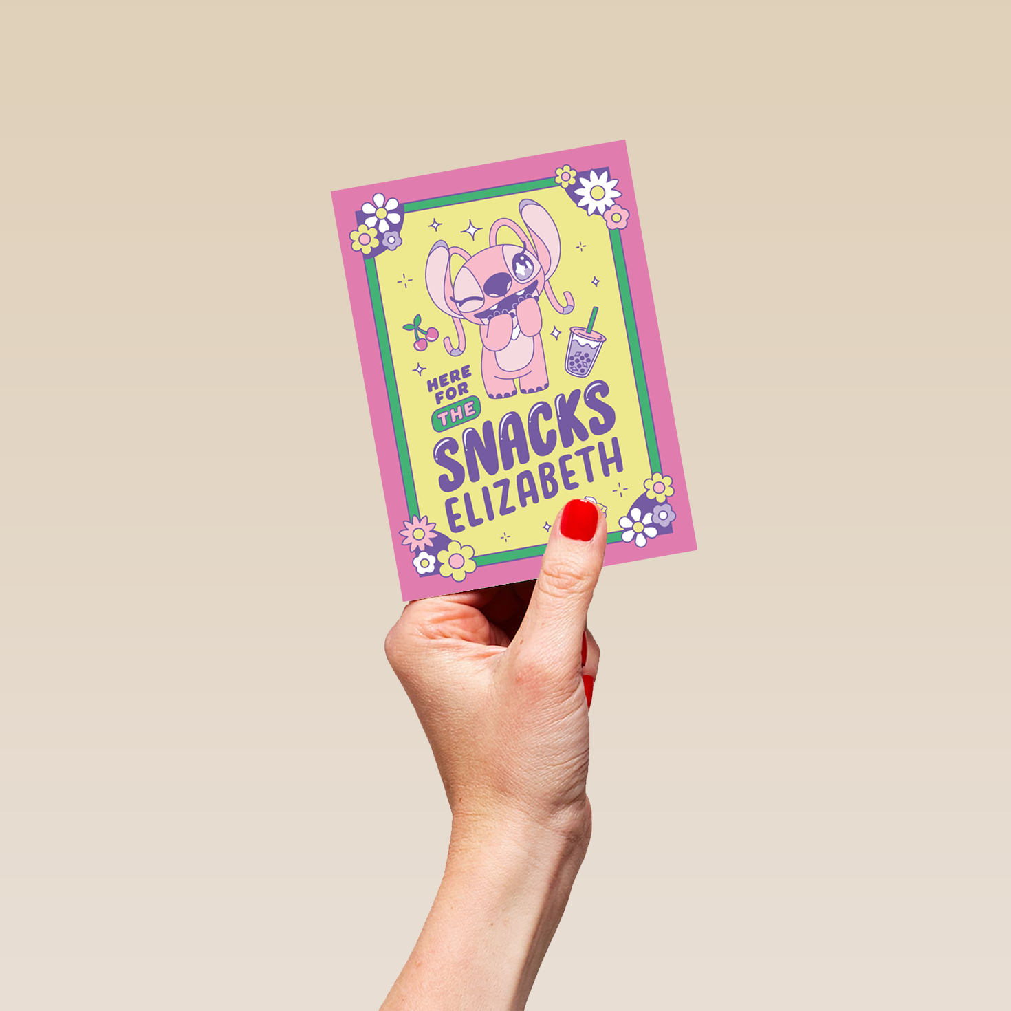 Printed on premium-quality board, this card features Angel with a cupcake, cherries and bubble tea, with the message 'Here for the snacks', space to personalise a name, and comes complete with a co-ordinating white envelope.
