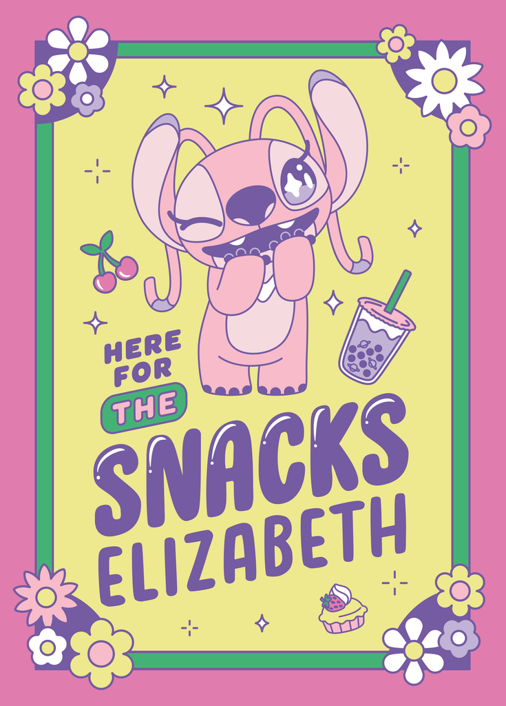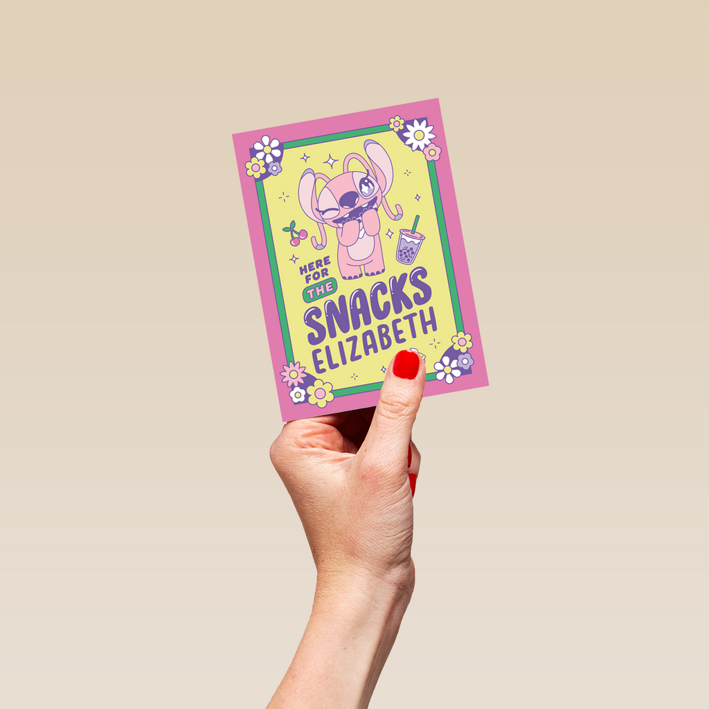Celebrate with snacks, sweet treats and fun with this adorable personalised and editable Lilo and Stitch card and add a loving message inside. The perfect way to celebrate a birthday, to brighten their day and more.