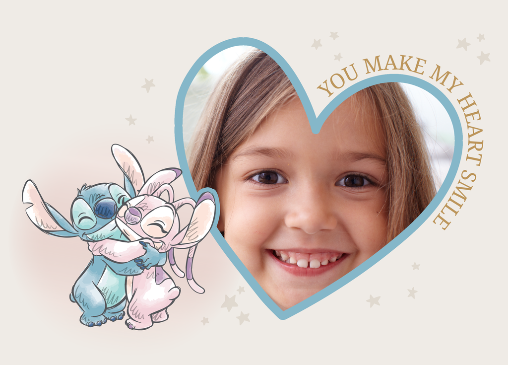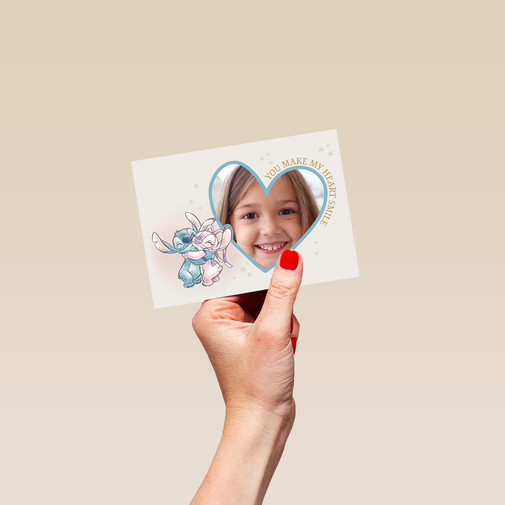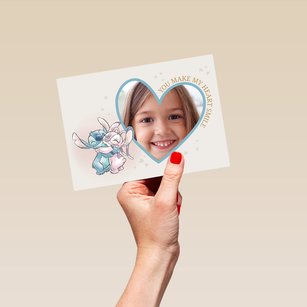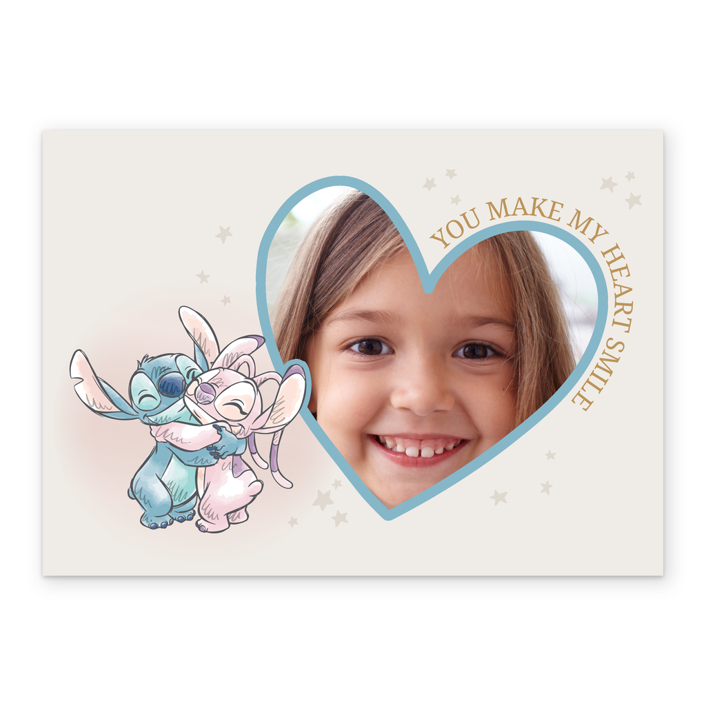 Printed on premium-quality board, this card features Stitch and Angel cuddling together, with the message 'You make my heart smile', space to upload a photo, and comes complete with a co-ordinating white envelope.