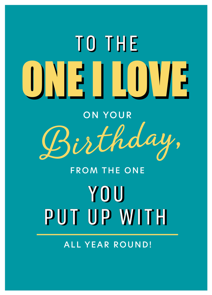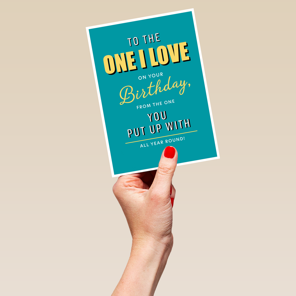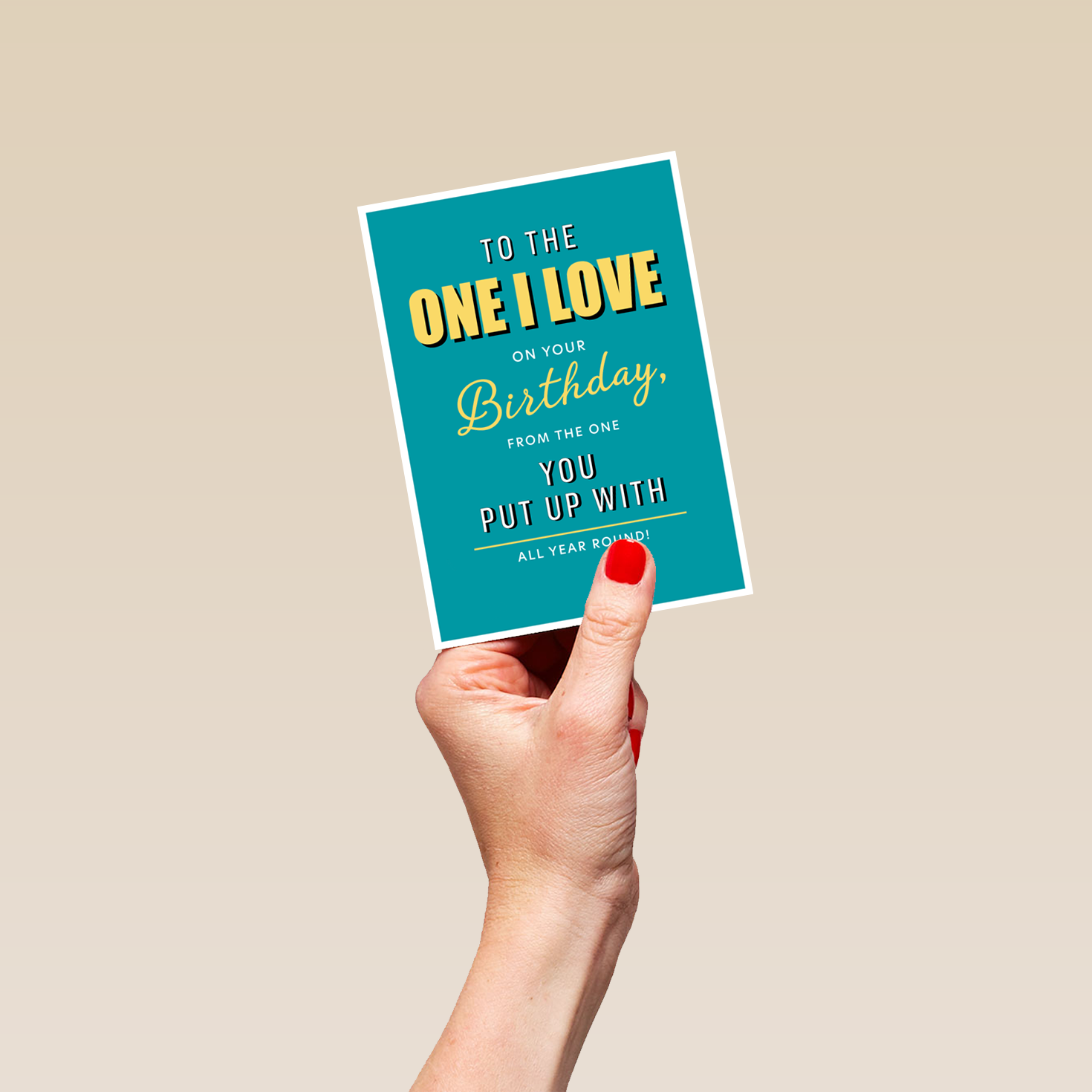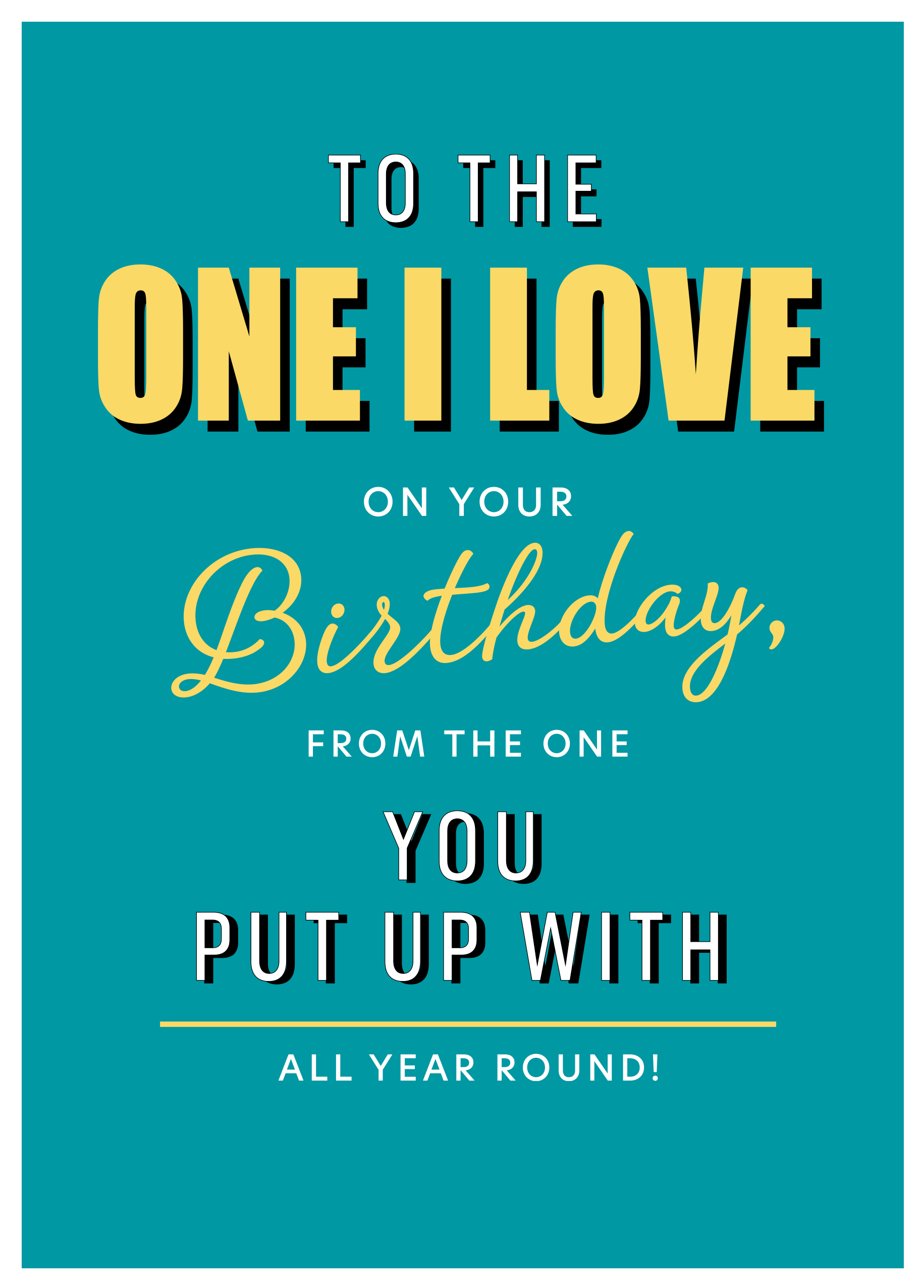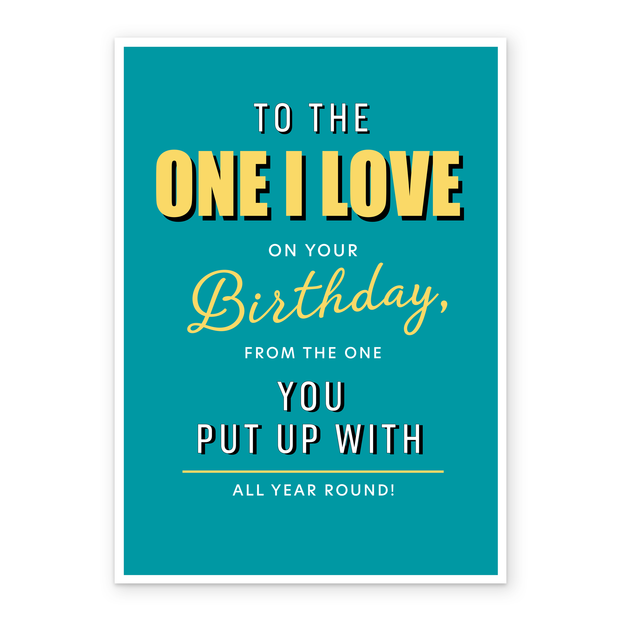 Printed on premium-quality board, this card features a contemporary, word art design, with the message 'To the one I love on your birthday, from the one you put up with all year round!', and comes complete with a co-ordinating white envelope.