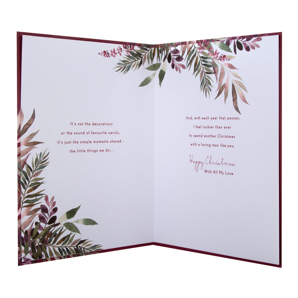 Message Inside Card Reads: You and I have seen some happy Christmases together - we've made so many memories around the festive tree... And though I can't remember every brightly gift-wrapped present, I know why all those special times have meant so much to me... It's not the decorations or the sound of favourite carols, it's just the simple moments shared - the little things we do... And, with each year that passes, I feel luckier than ever to spend another Christmas with a loving man like you. Happy Christmas With All My Love
