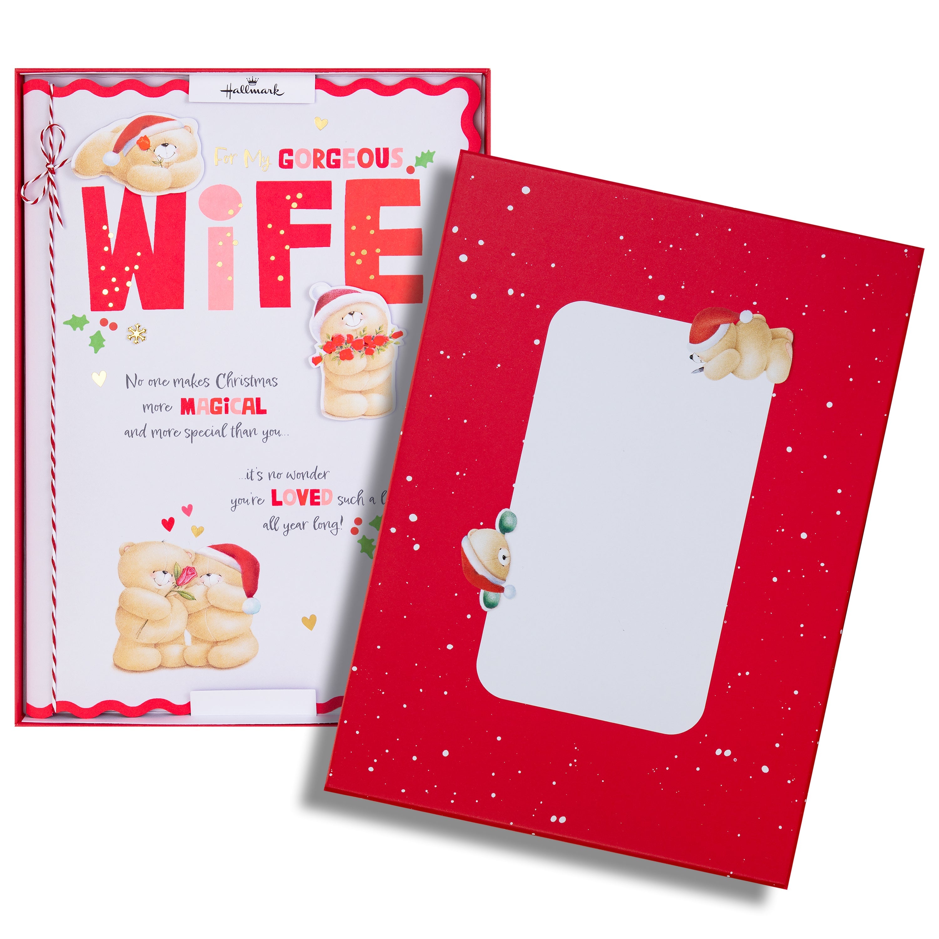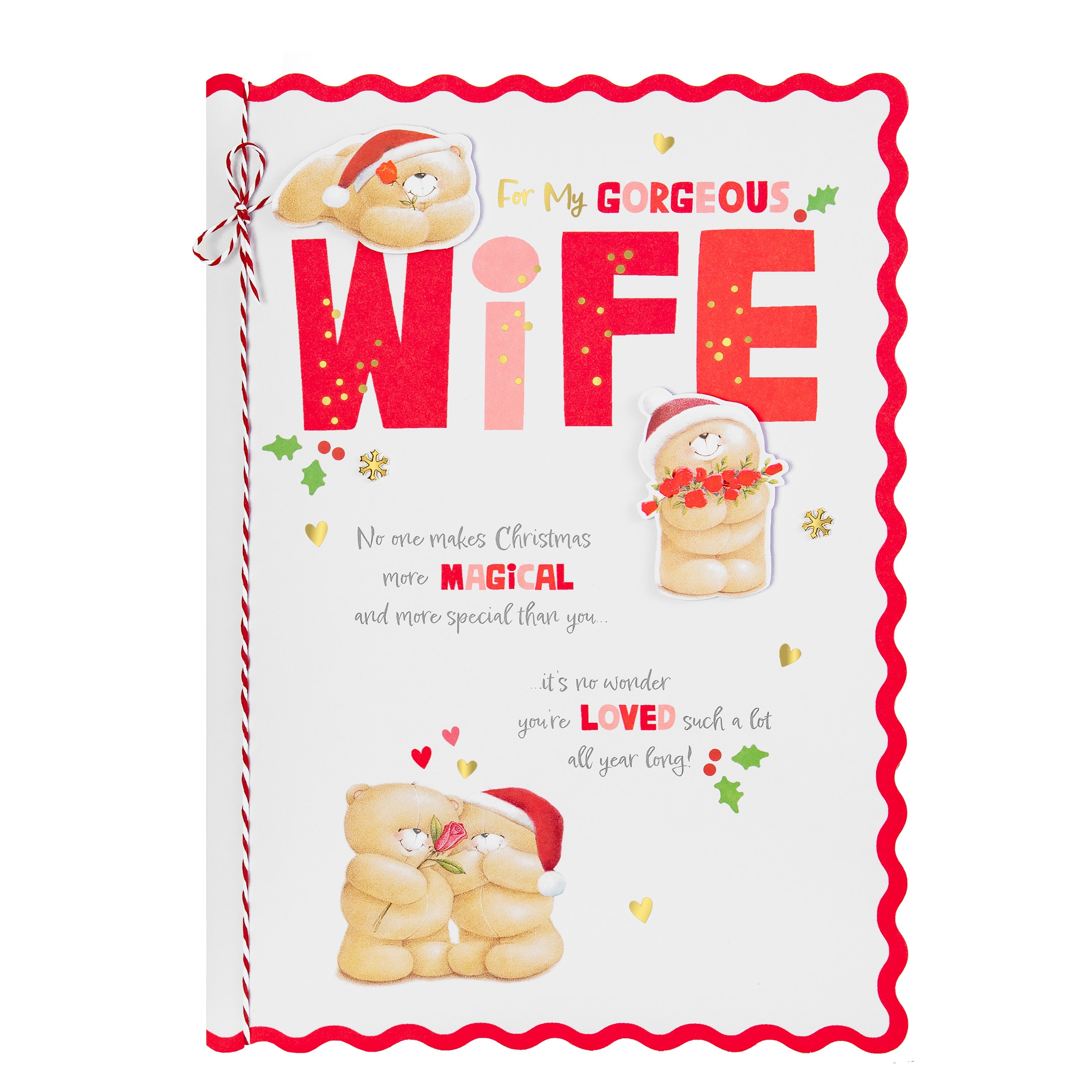 Give your gorgeous wife another reason to smile this Christmas with this adorable Forever Friends Luxury Boxed Christmas Card. Printed on high-quality board with die-cut scalloped edging, this lovely card features bold lettering and the Forever Friends bear in various cute poses alongside a 4-page paper insert, with heartfelt seasonal message, 3D effect attachments, gold foil details, a gold-foiled snowflake paper 'gem' and a red and white twine attachment, and comes complete with a co-ordinating bright red, presentation box.