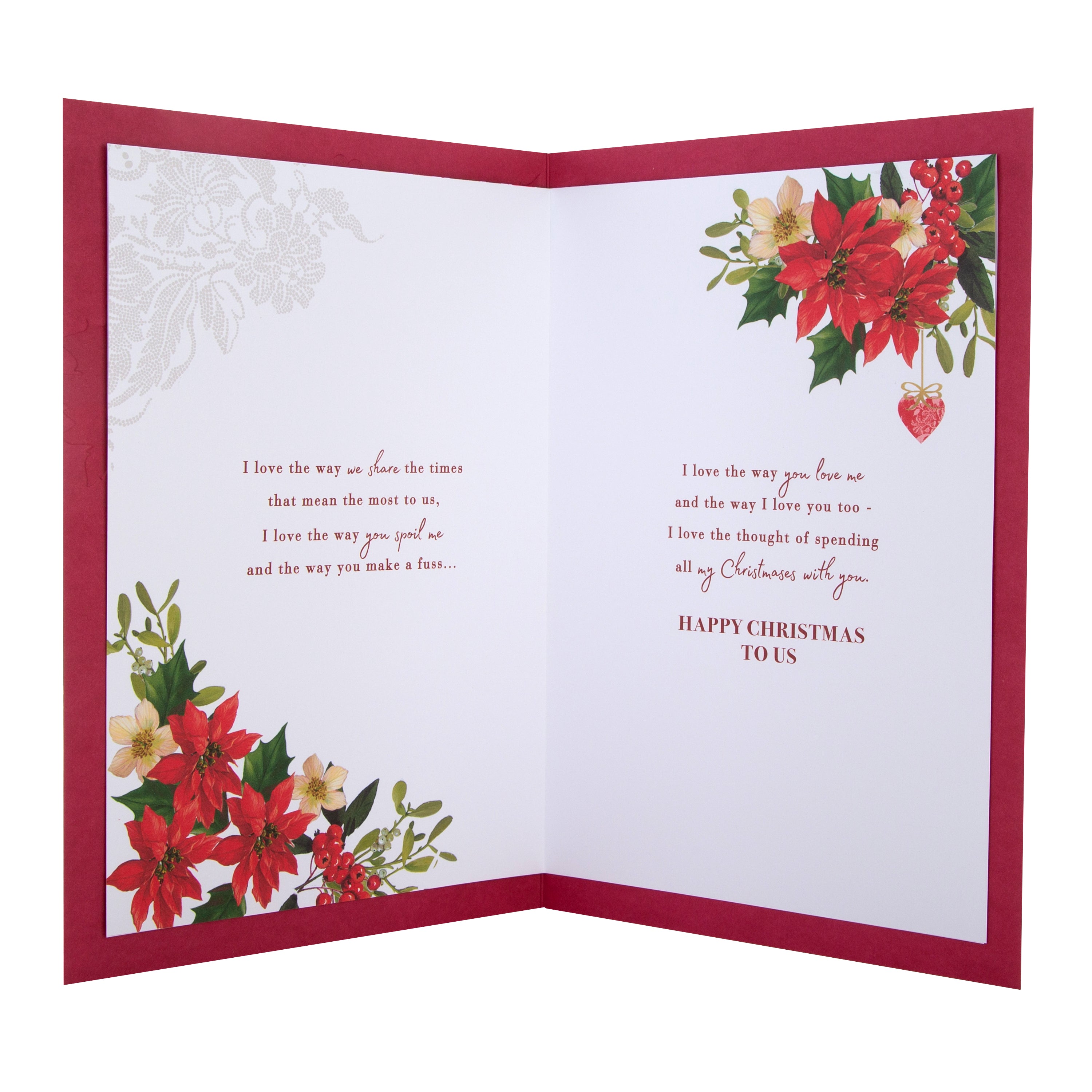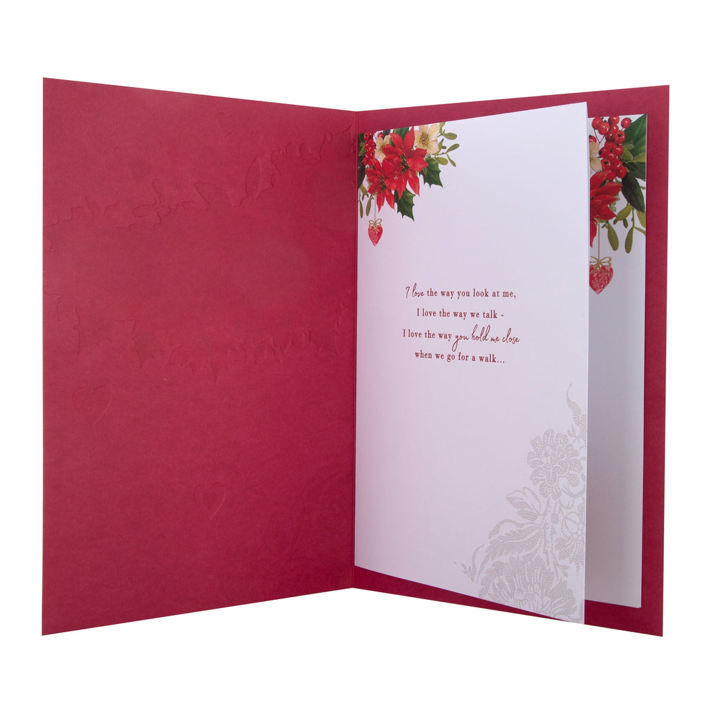 Message Inside Card Reads: I love the way you look at me, I love the way we talk - I love the way you hold me close when we go for a walk... I love the way we share the times that mean the most to us, I love the way you spoil me and the way you make a fuss... I love the way you love me and the way I love you too - I love the thought of spending all my Christmases with you. Happy Christmas to us