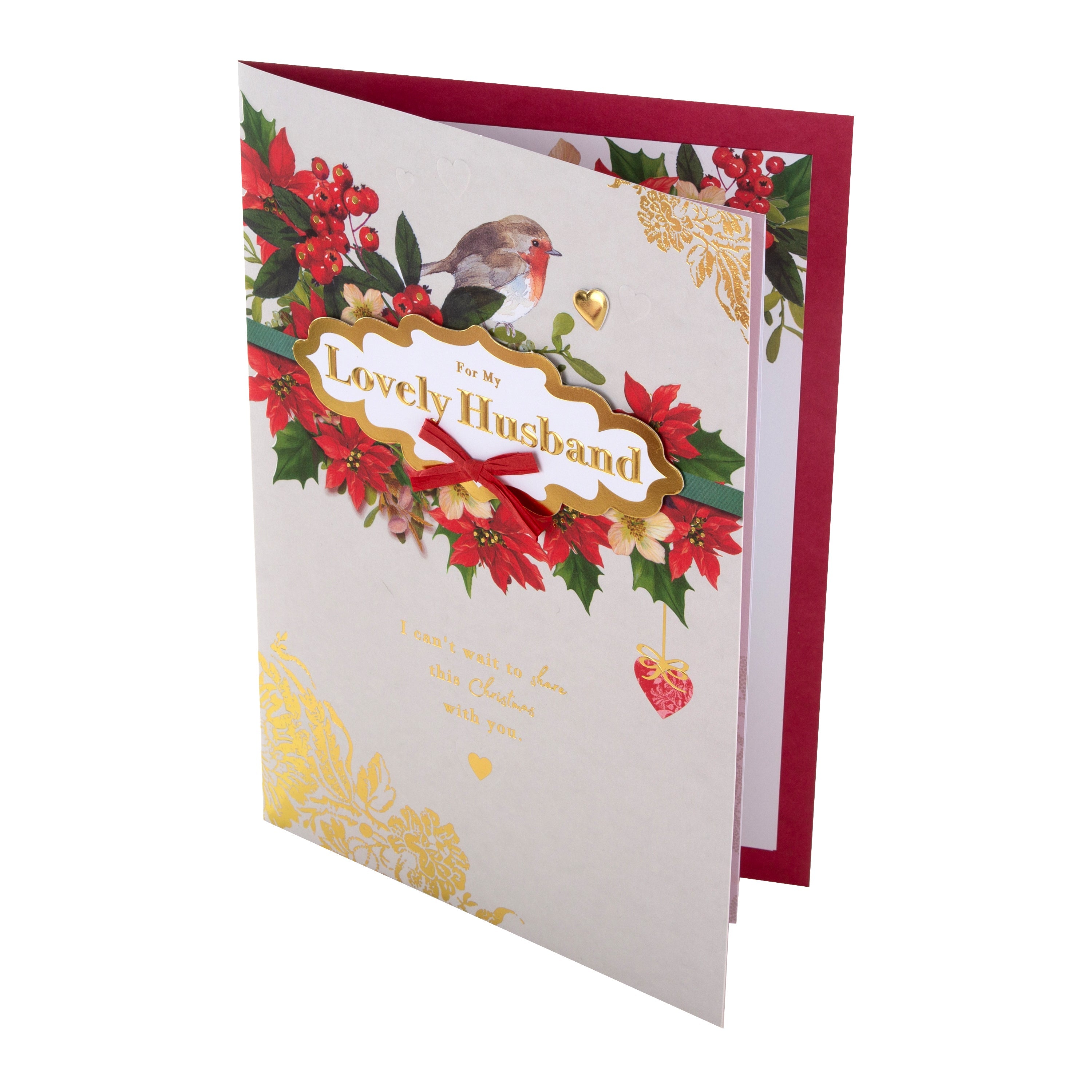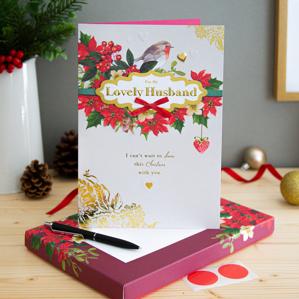 Medium Luxury Boxed Christmas Card for Husband - Traditional Robin and Foliage Design