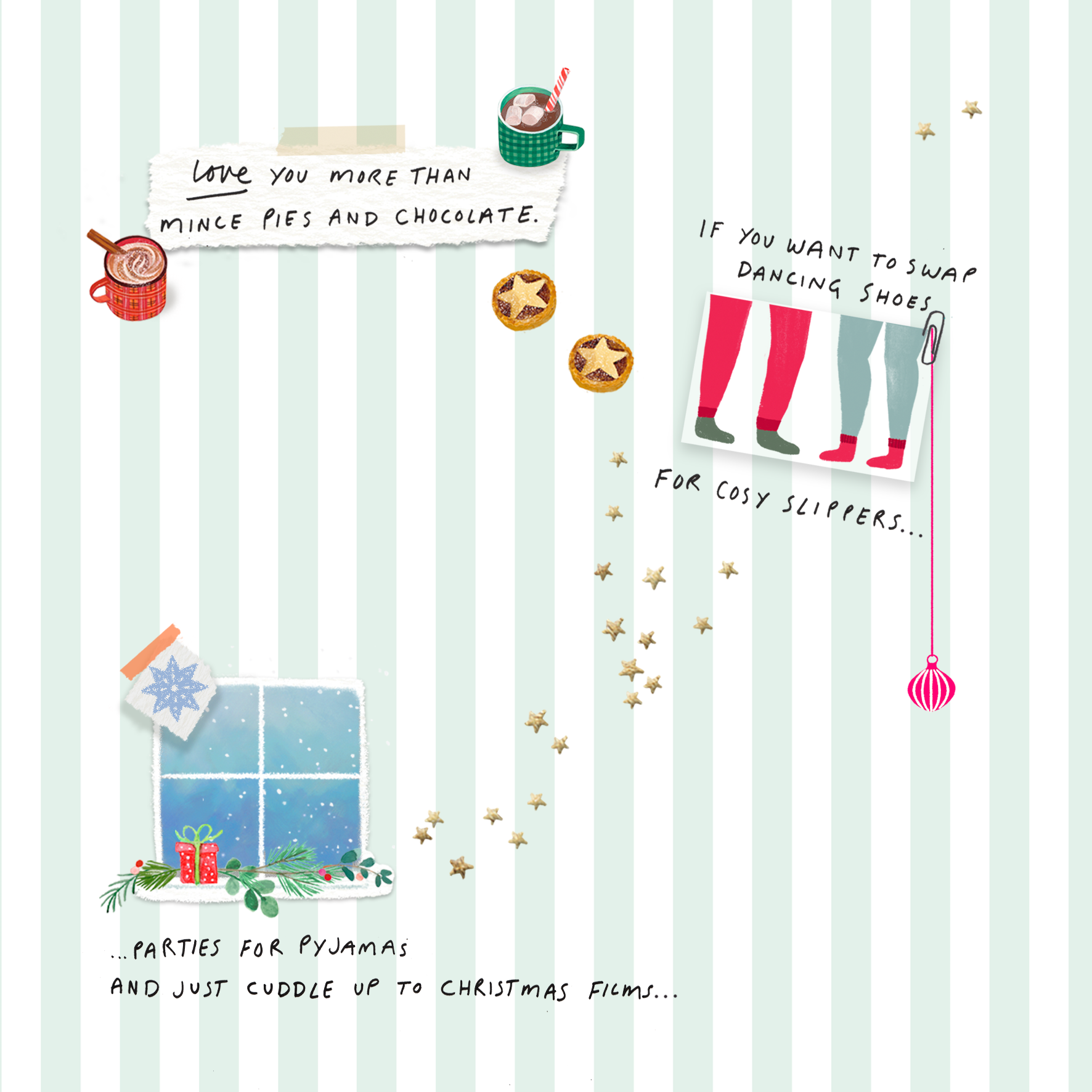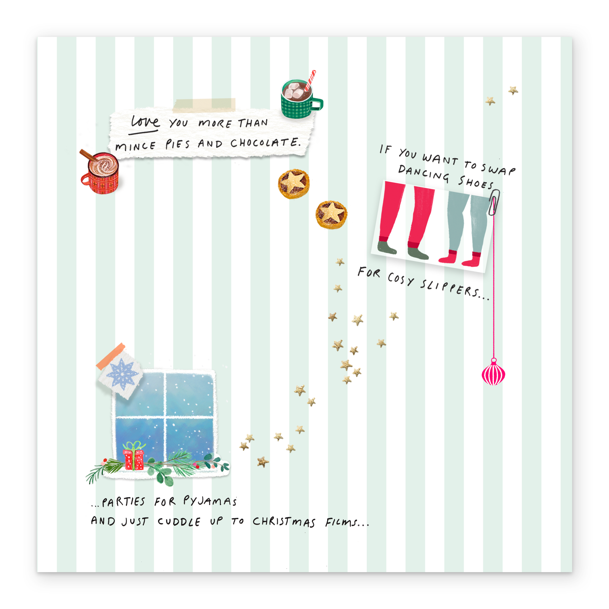 Printed on premium-quality board, this card features cosy and quirky festive illustrations, including mince pies, mugs of cocoa, legs in colourful leggings and a foliage decorated window with snow falling outside, set against a pale blue and white striped background overlaid with black lettering, with the message 'LOVE YOU MORE THAN