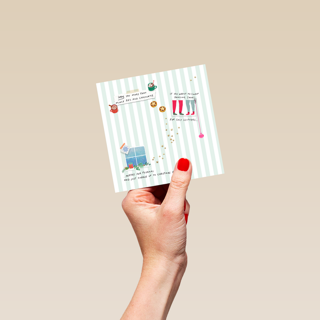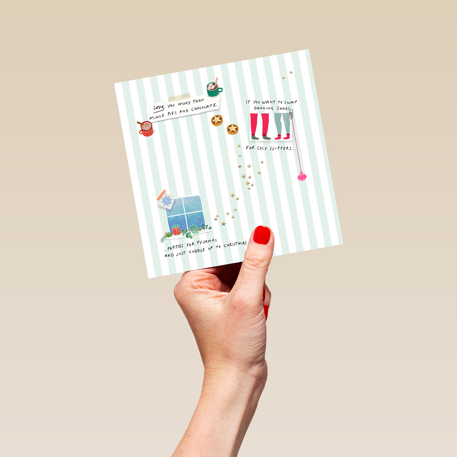 ...PARTIES FOR PYJAMAS AND JUST CUDDLE UP TO CHRISTMAS FILMS...', and comes complete with a co-ordinating white envelope.