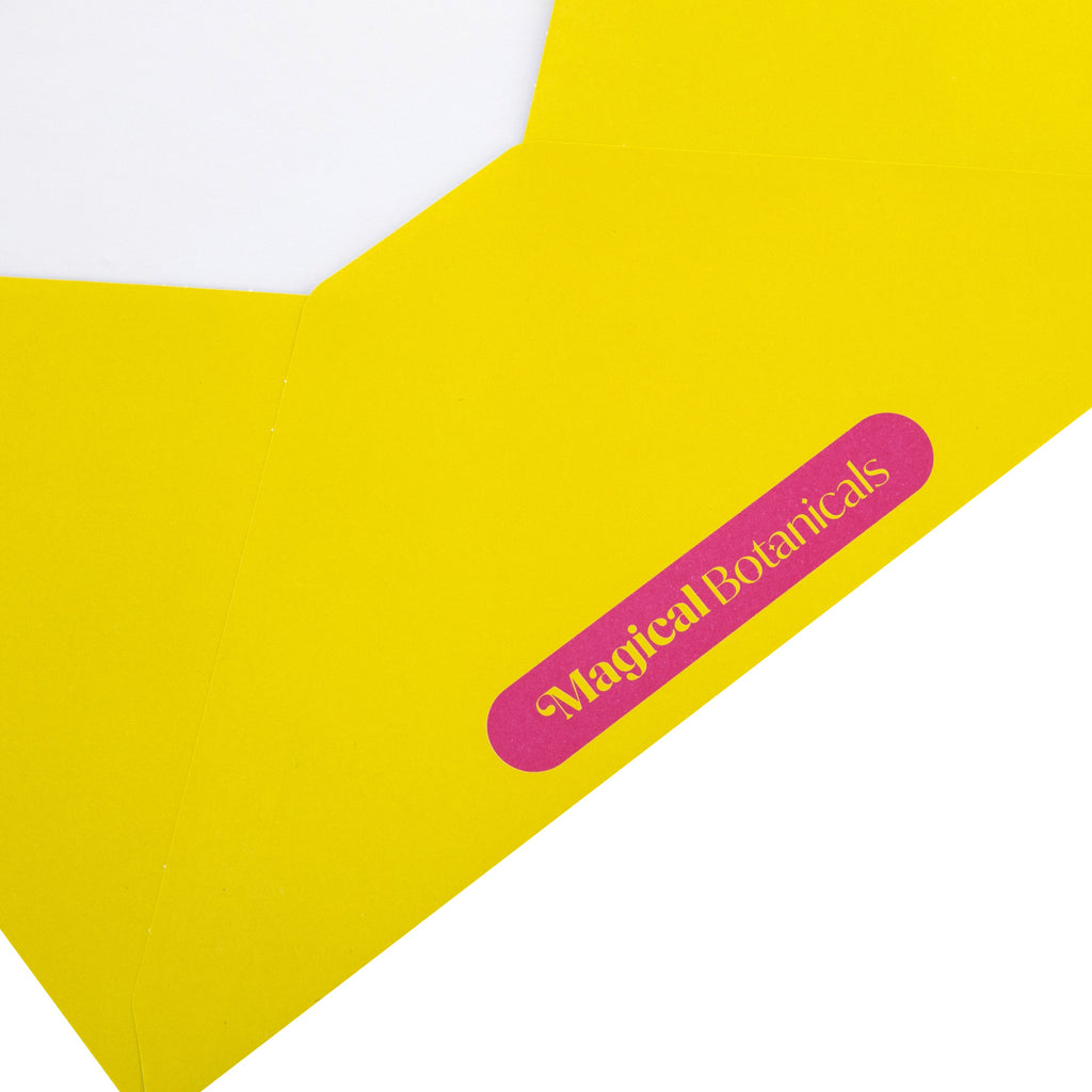 Inspired by nature, 'the Elisabeth' collection is crafted with love, these gorgeous blooms will surprise, delight and inspire. Printed on high-quality board, and featuring classic watercolour-style florals in a sitting cat vase and a die cut design. The horizontal 'A' fold makes for a simple but impactful display, adding a burst of colour to your home. The card comes complete with a co-ordinating Hallmark branded, chartreuse envelope with the Magical Botanicals logo.