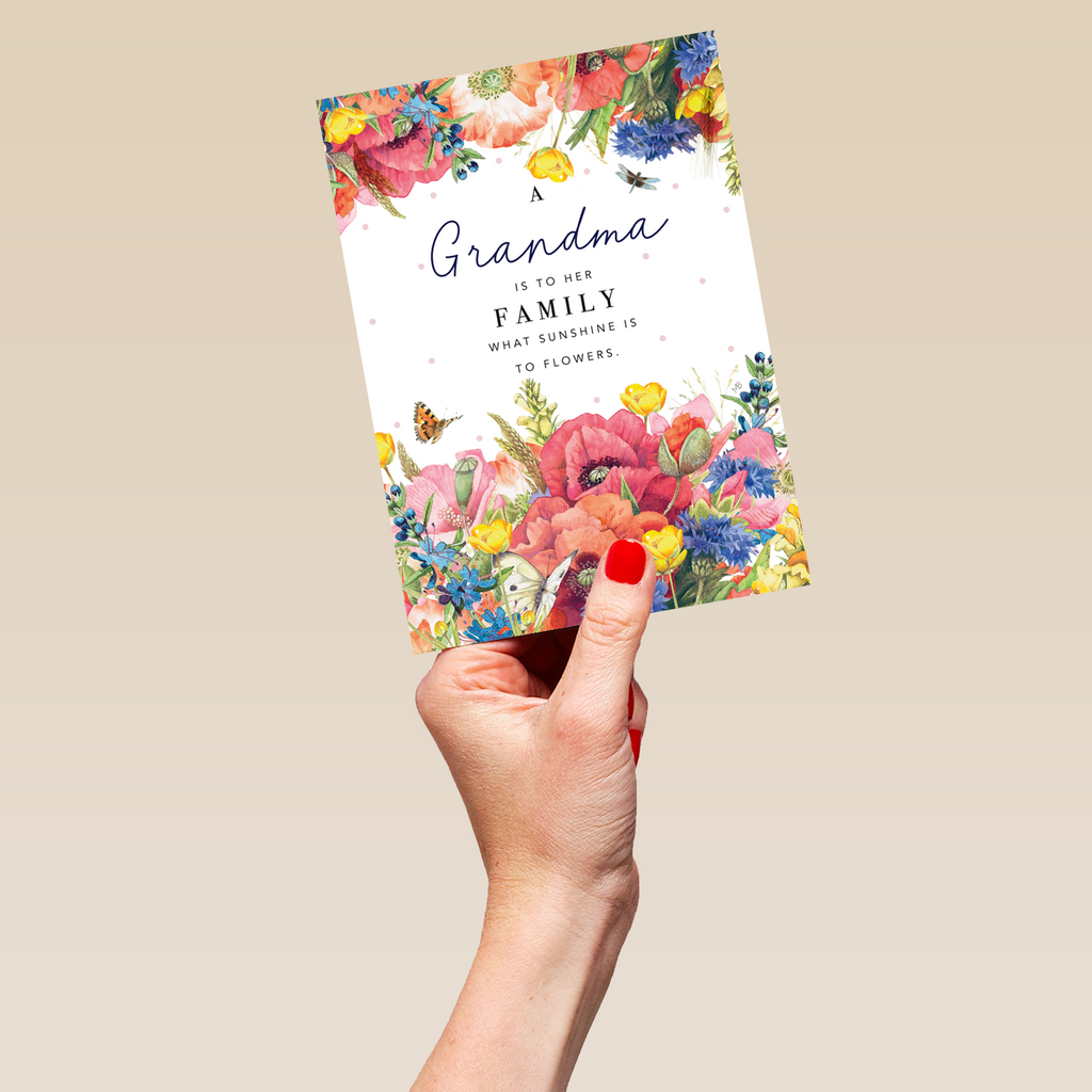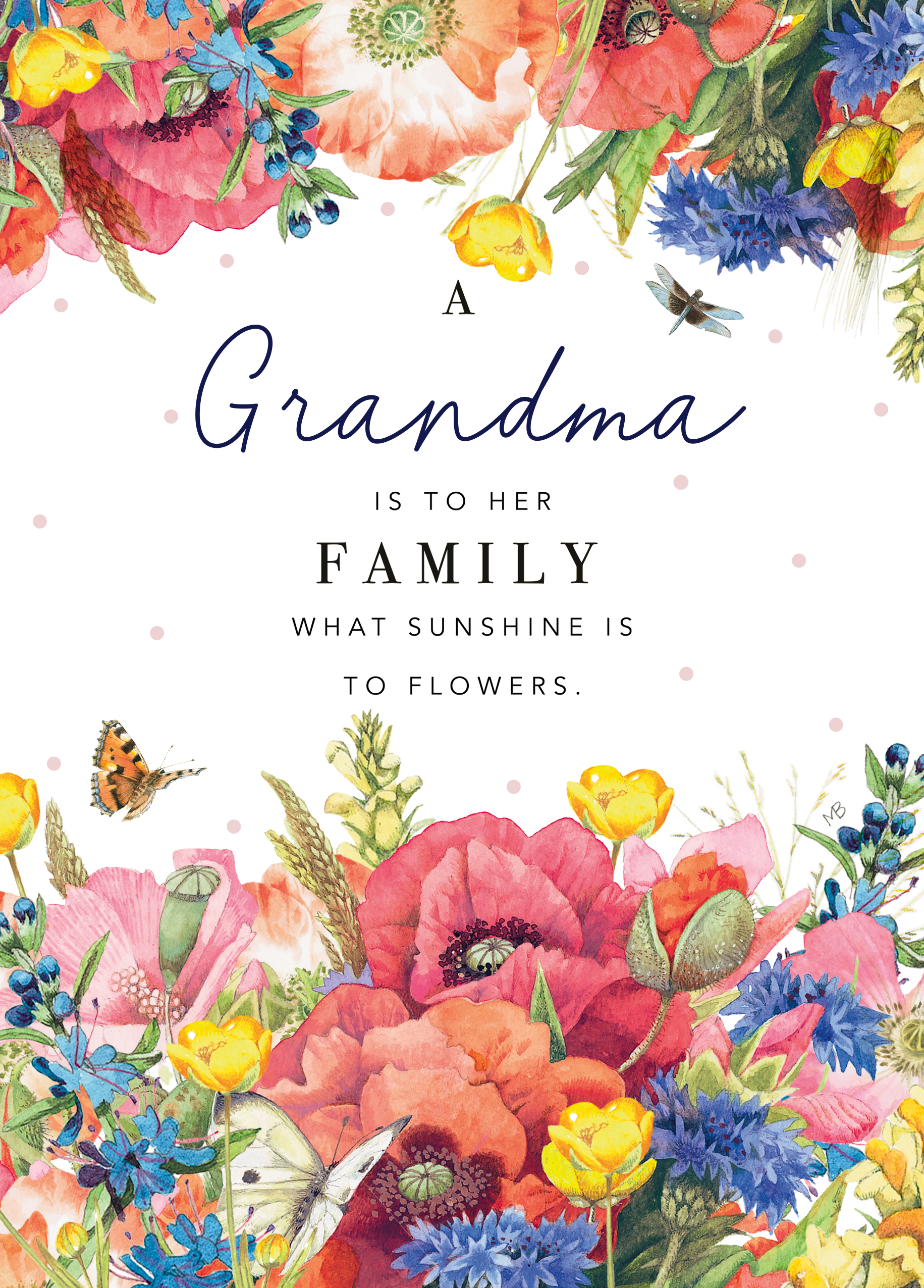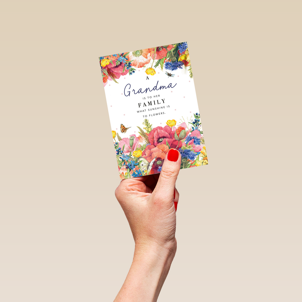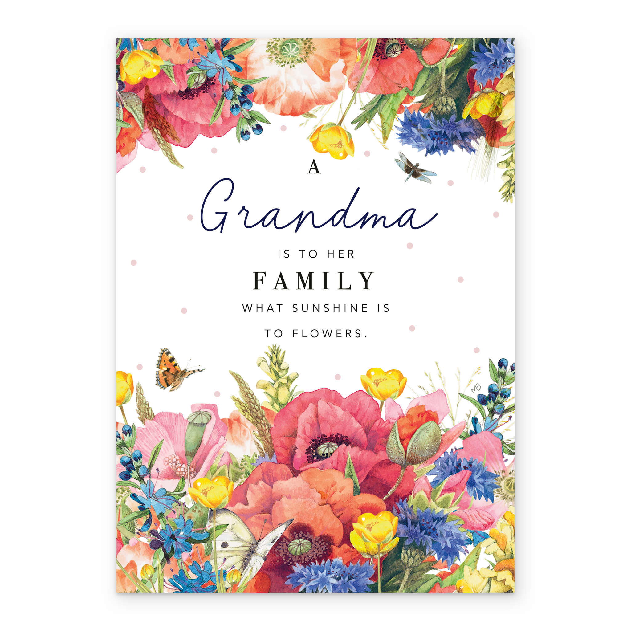 Printed on premium-quality board, this card features stunning floral artwork by Marjolein Bastin, with the message ‘A Grandma is to her family what sunshine is to flowers', space to personalise a name, and comes complete with a co-ordinating white envelope.