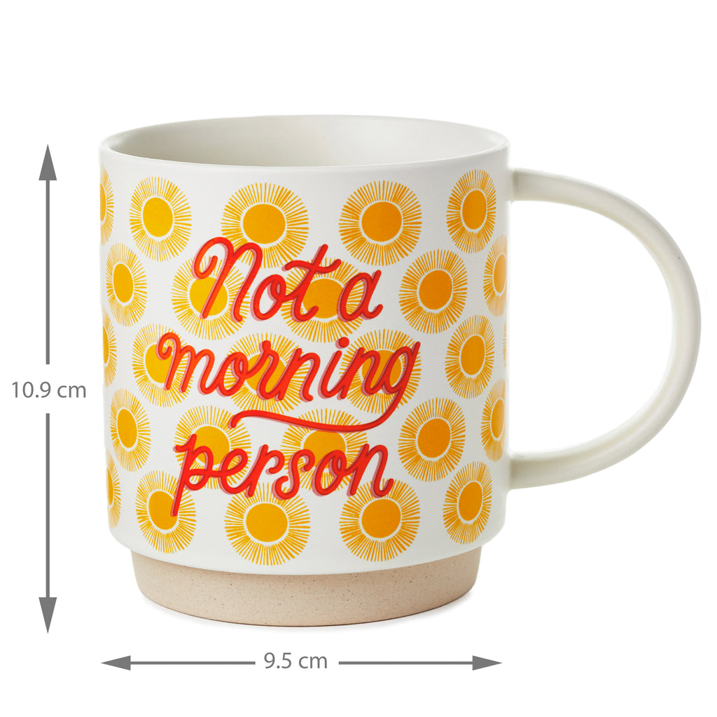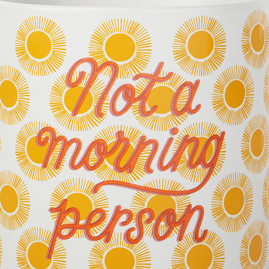 This funny ceramic mug features a pattern of yellow suns with the message "Not a morning person" in red text.