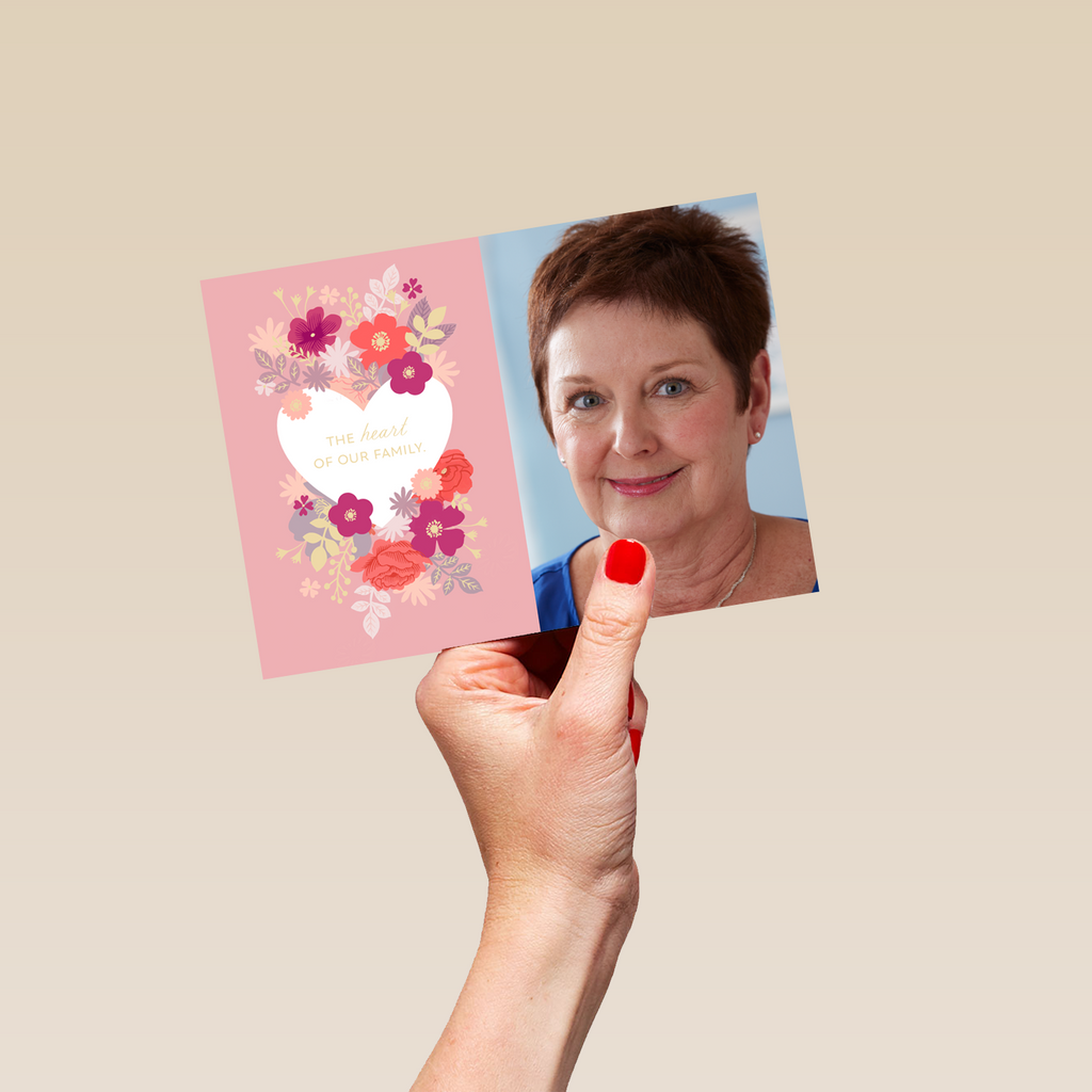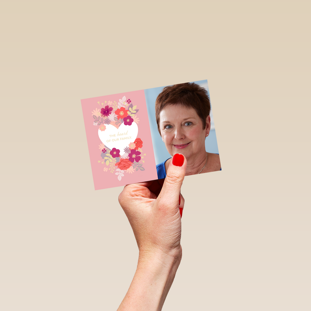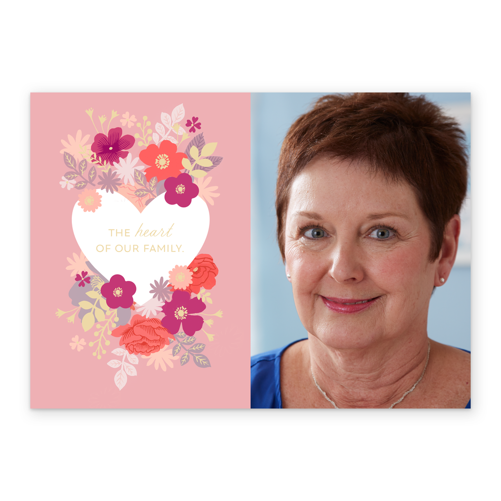 Printed on premium-quality board, this card features a pink background, a heart and florals design, with the message 'The heart of our family', space to upload a photo, and comes complete with a co-ordinating white envelope.