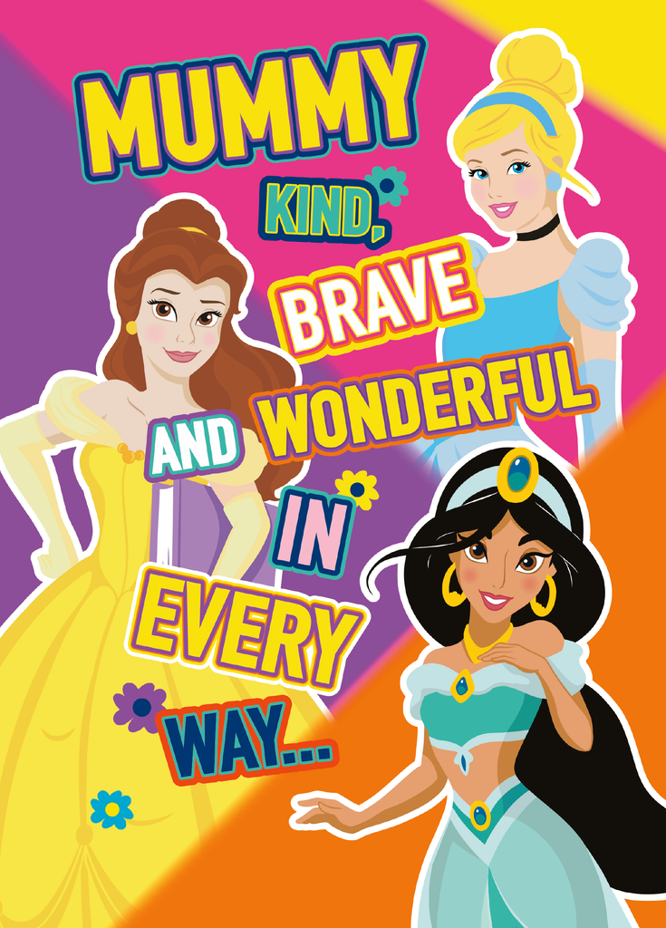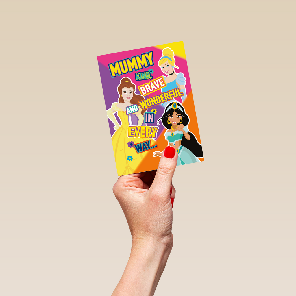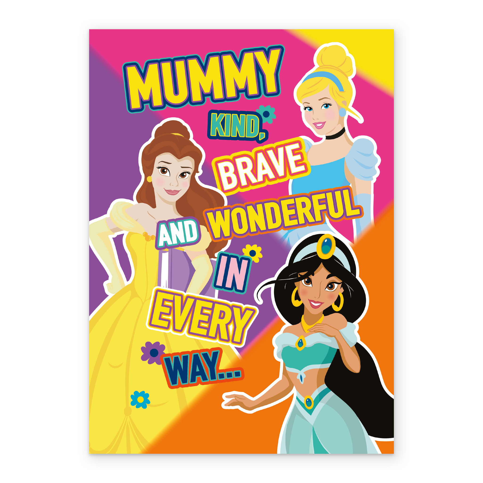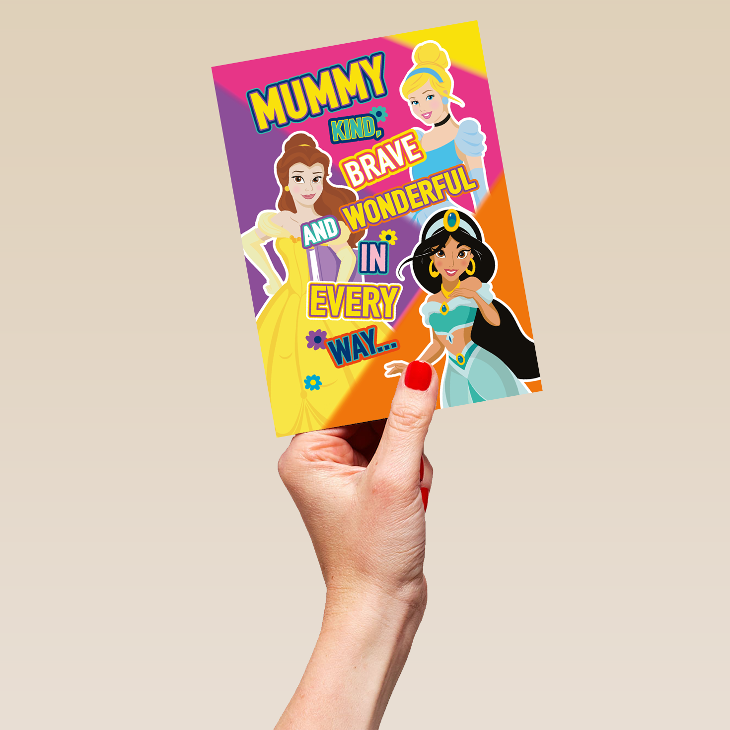 Printed on premium-quality board, this card features Disney's Cinderella, Belle and Jasmine on a colourful contemporary background, with the message 'Mummy Kind, Brave And Wonderful In Every Way…', and comes complete with a co-ordinating white envelope.