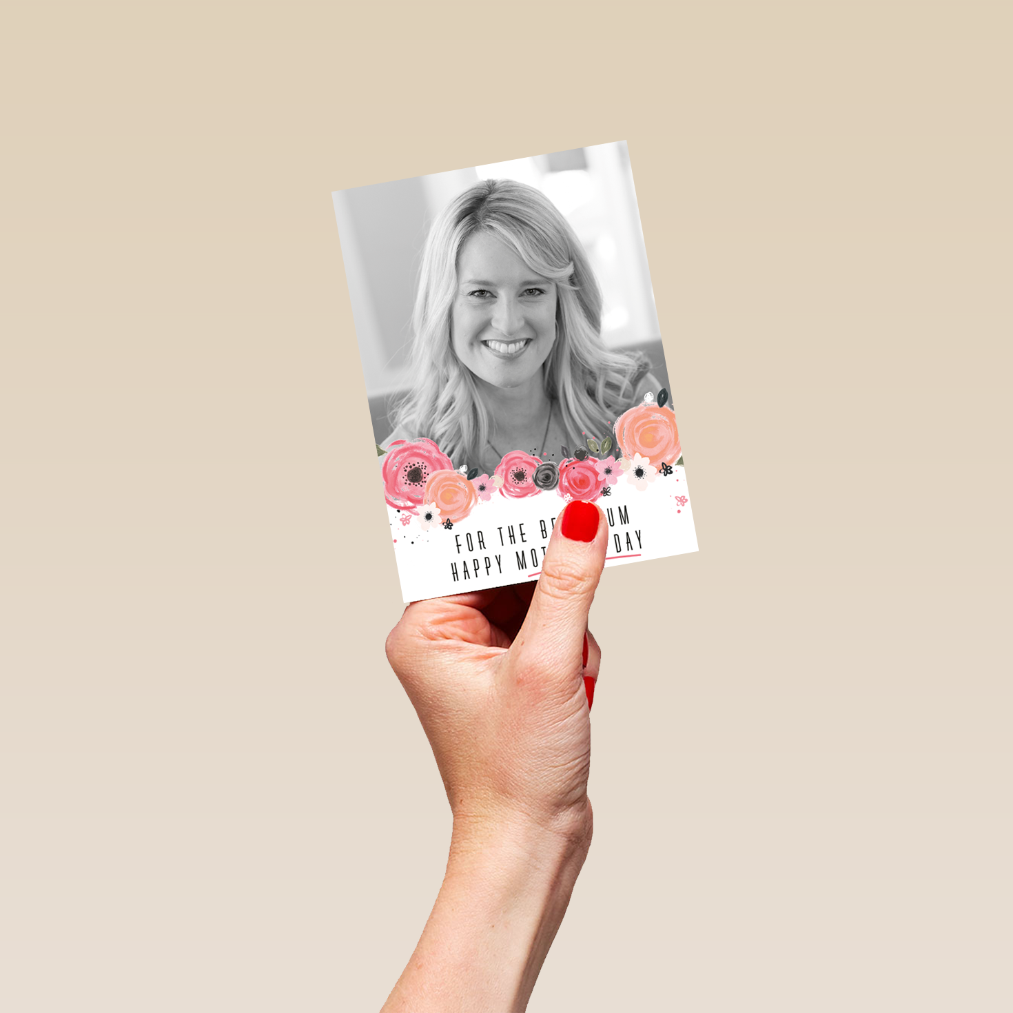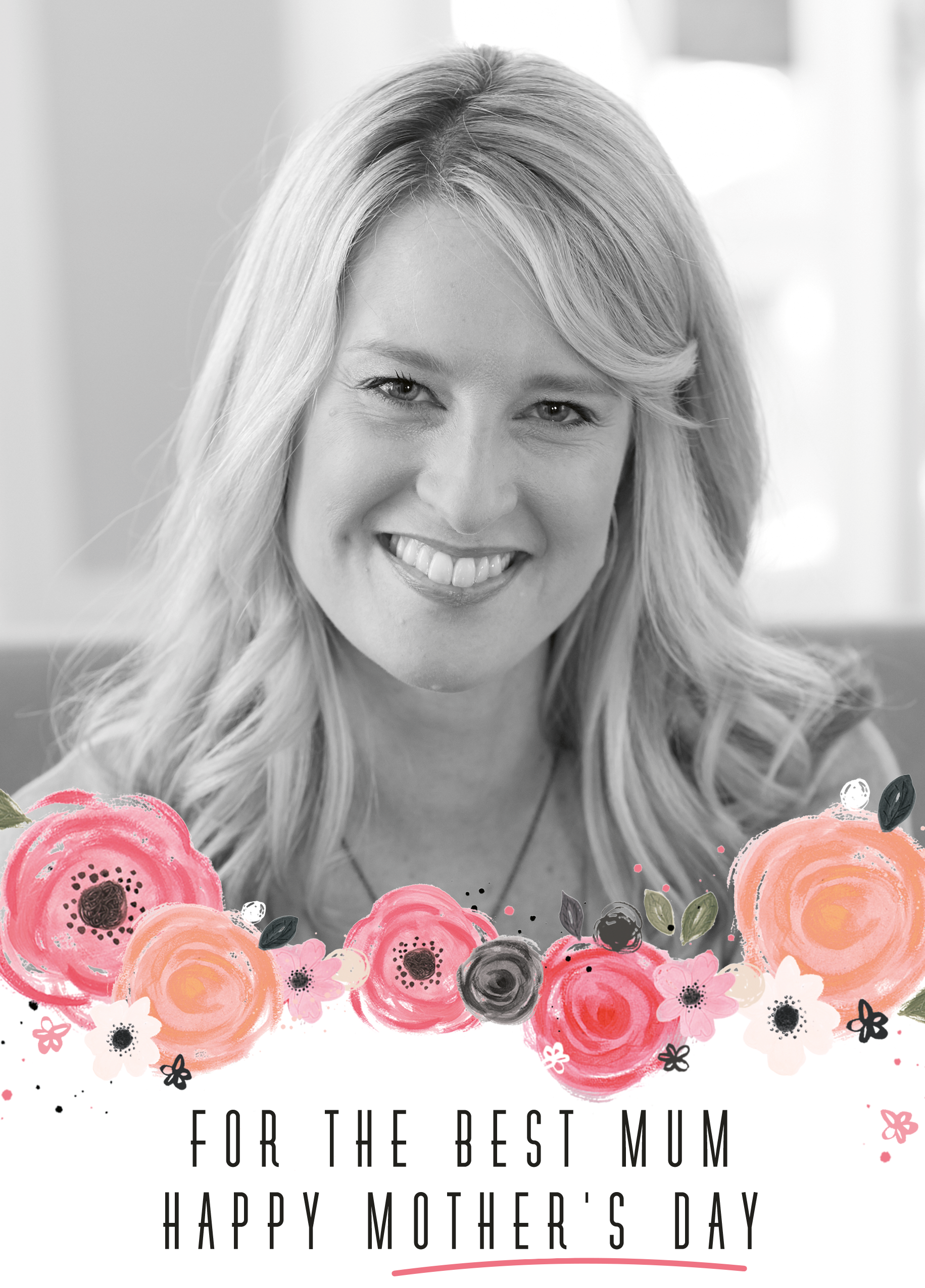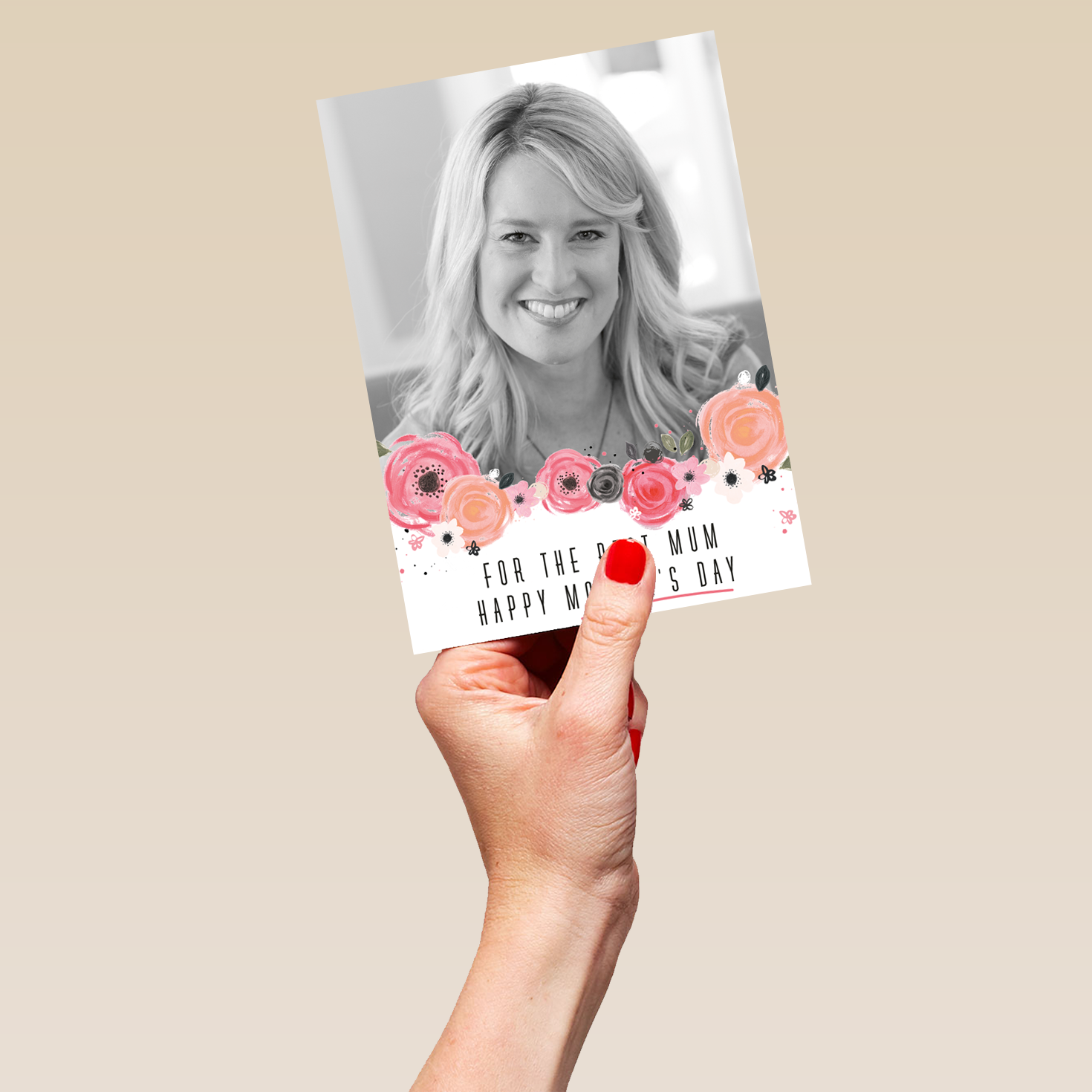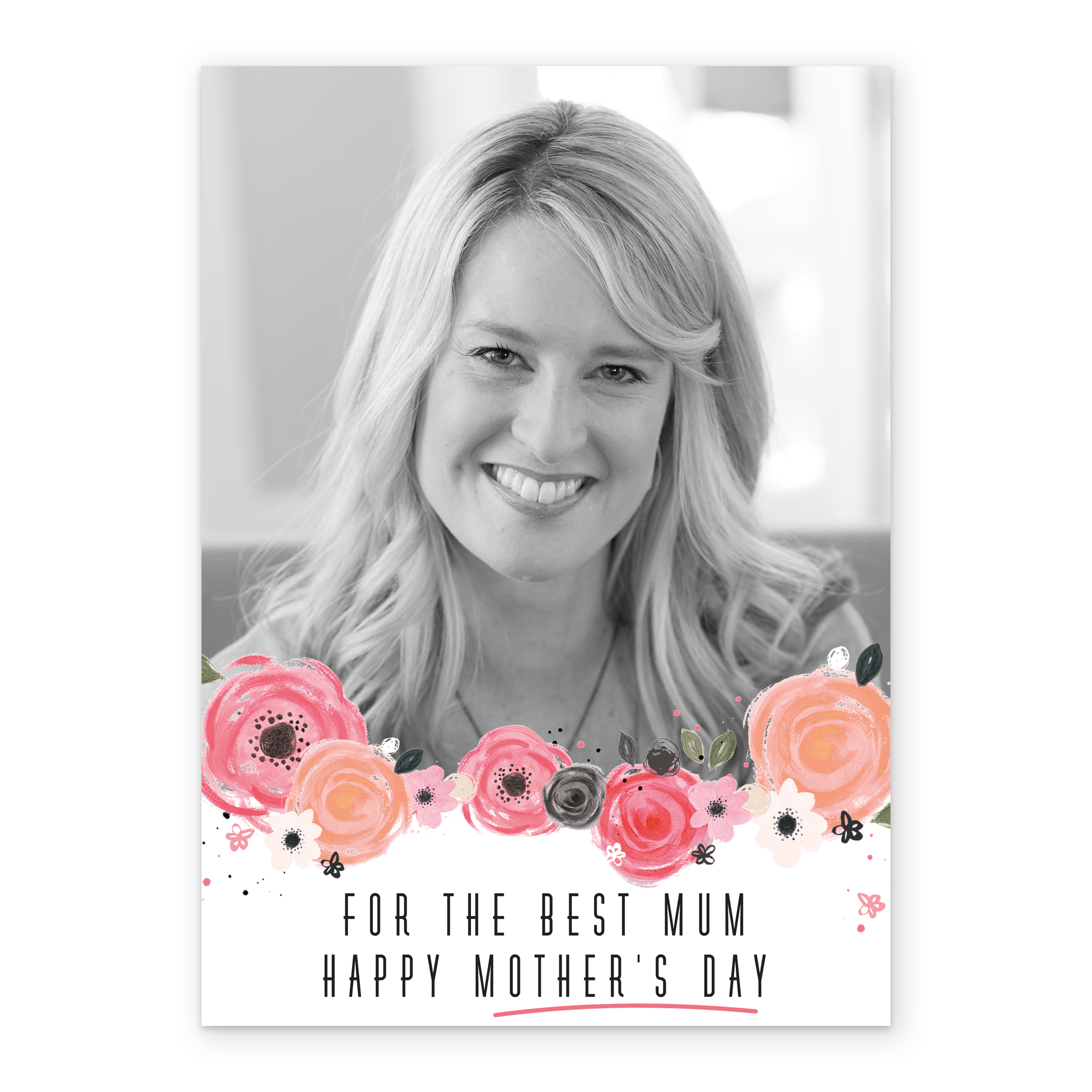 Printed on premium-quality board, this card features a large photo frame with contemporary illustrated pink, peach and black flowers, on a white background, with the message 'For the best mum Happy Mother's Day', space to upload a photo, and comes complete with a co-ordinating white envelope.
