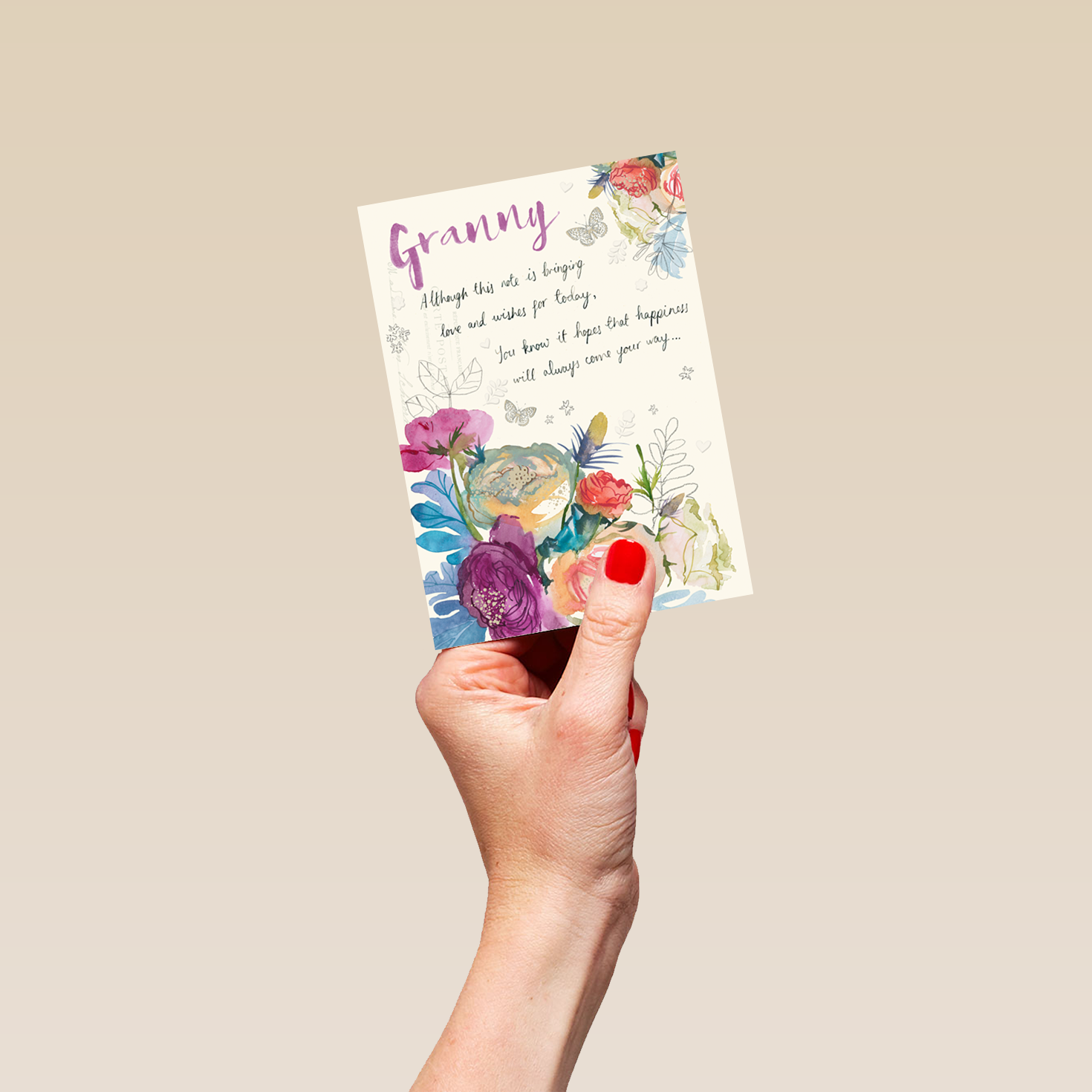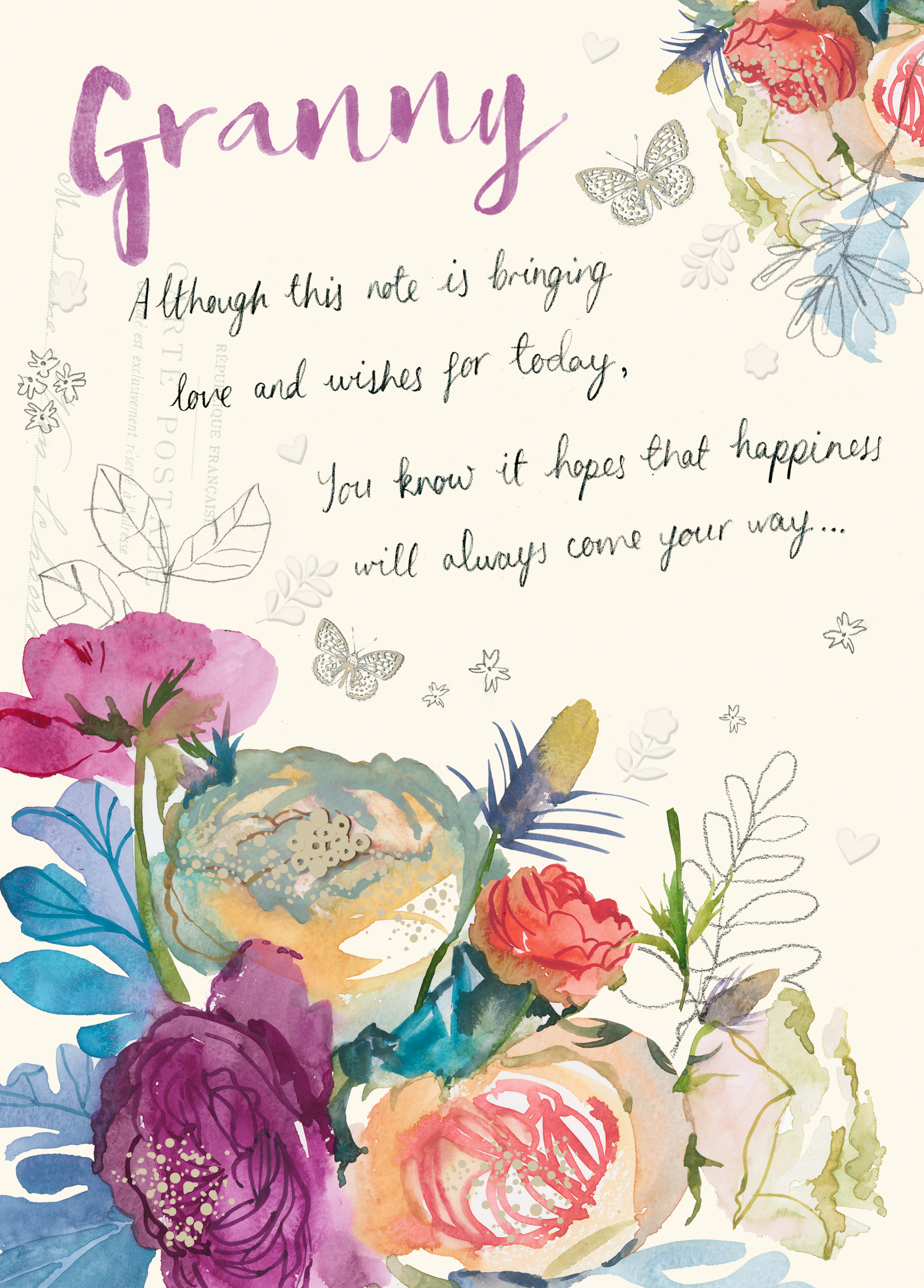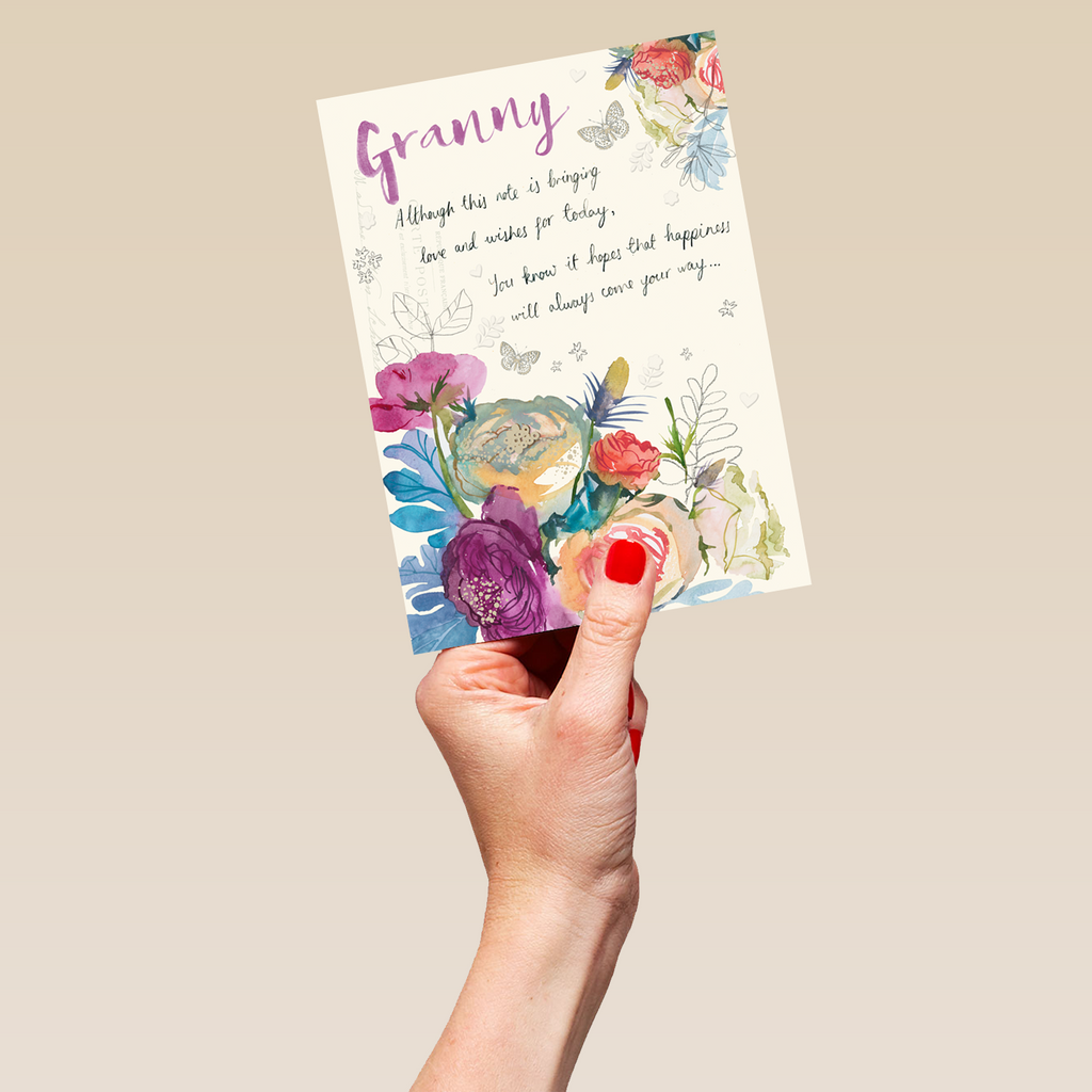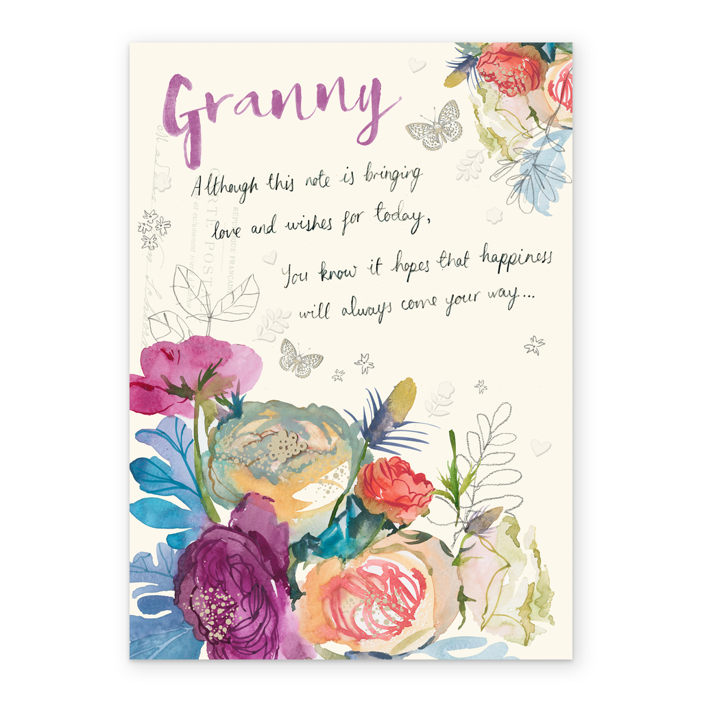 Printed on premium-quality board, this card features a watercolour inspired floral design with butterflies, with the message 'Granny. Although this note is bringing love and wishes for today, you know it hopes that happiness will always come your way...', and comes complete with a co-ordinating white envelope.