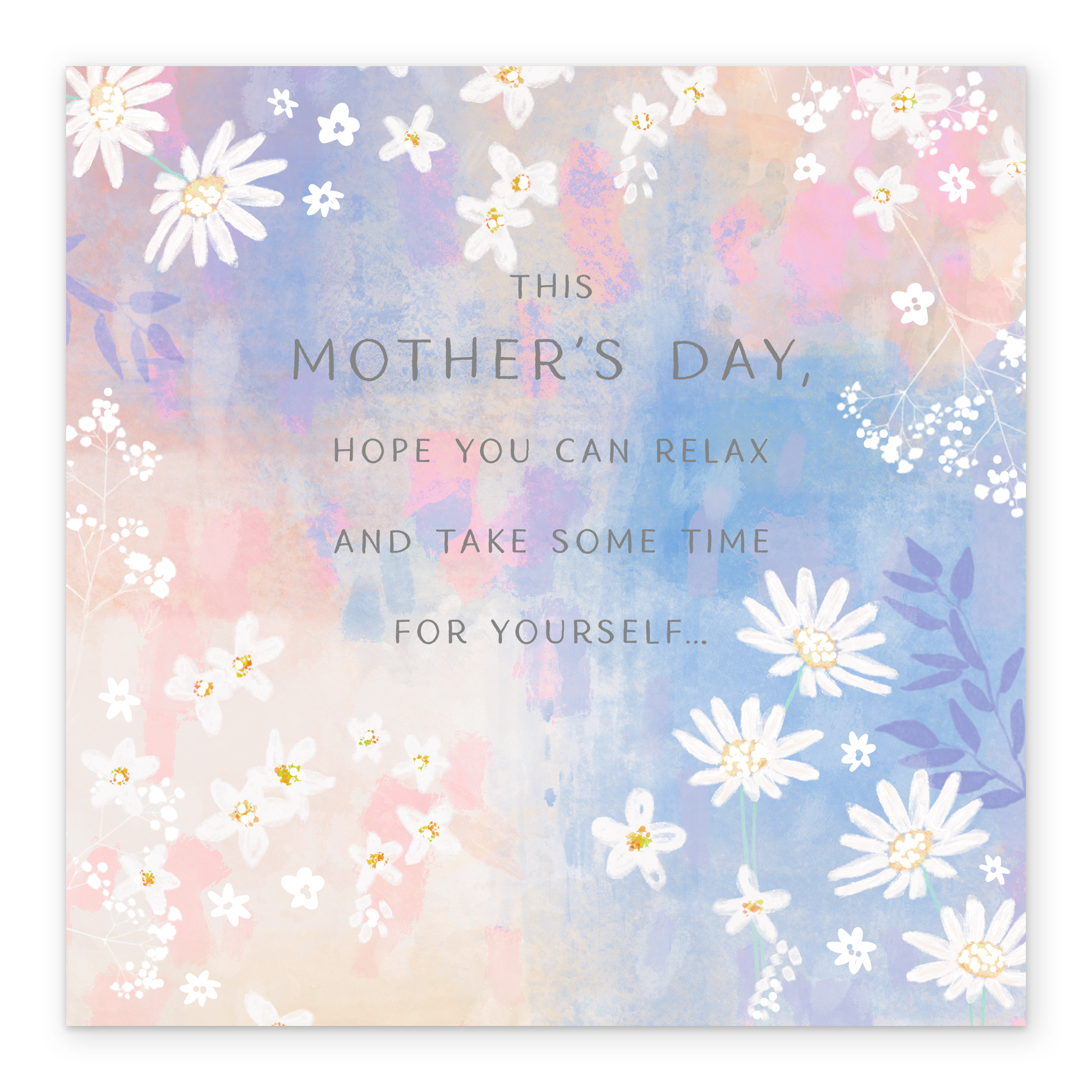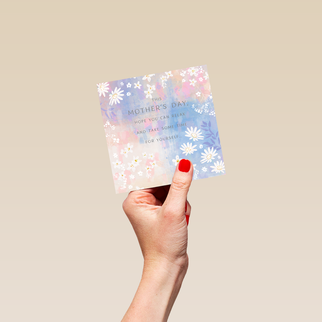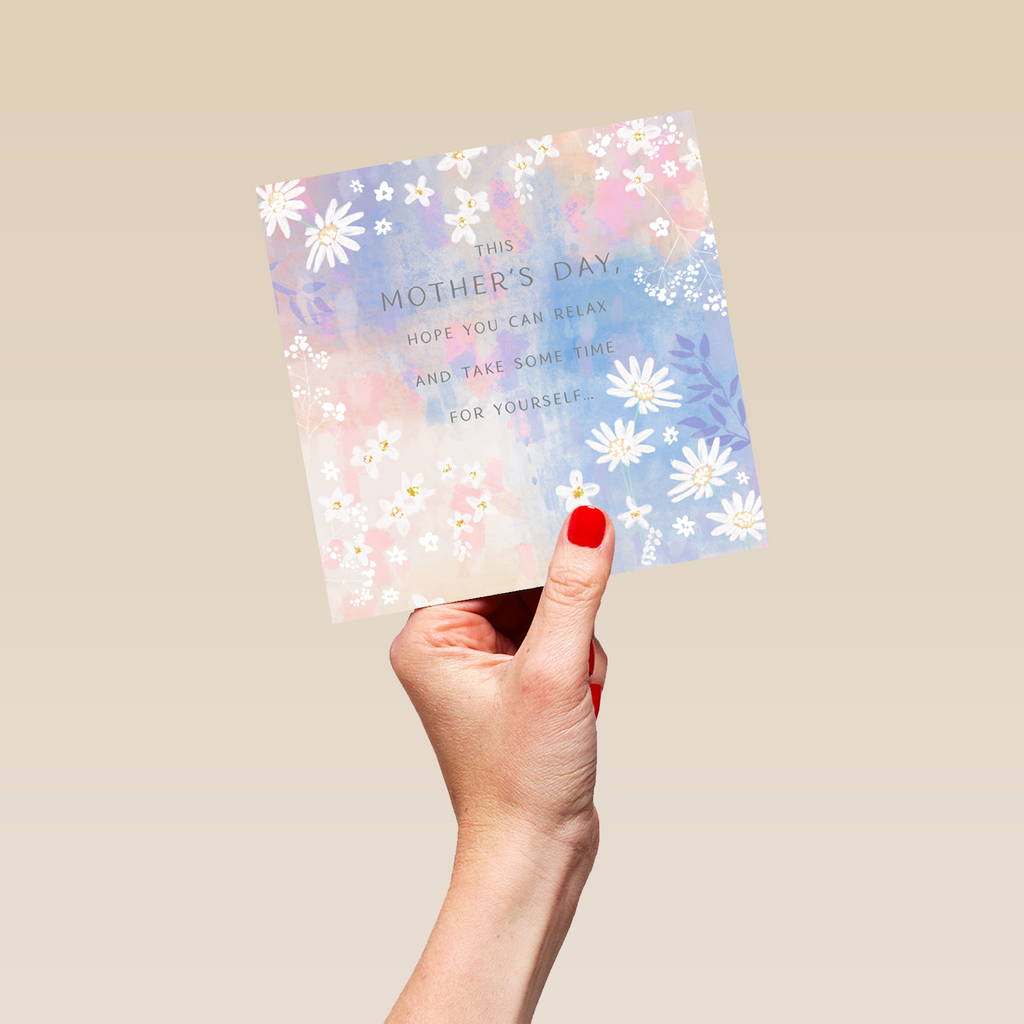 Printed on premium-quality board, this card features a watercolour background with white daisies, with the message 'This Mother's Day, hope you can relax and take some time for yourself...', and comes complete with a co-ordinating white envelope.